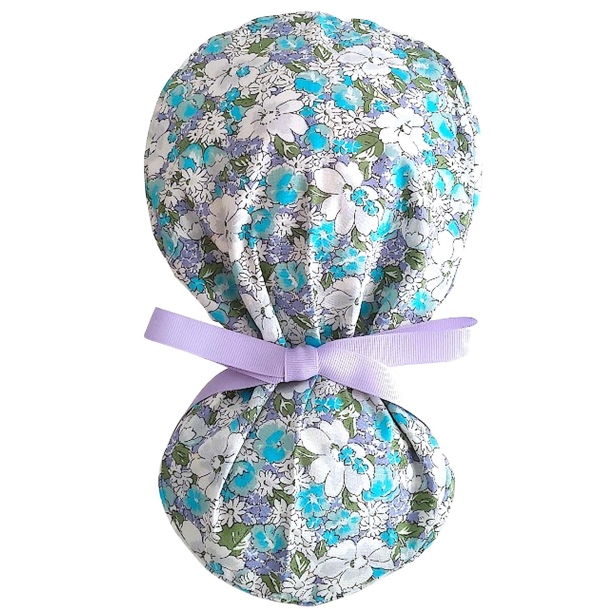Ponytail Scrub Cap with Satin Lining, Embroidery, and Buttons for Comfortable Mask Wearing.