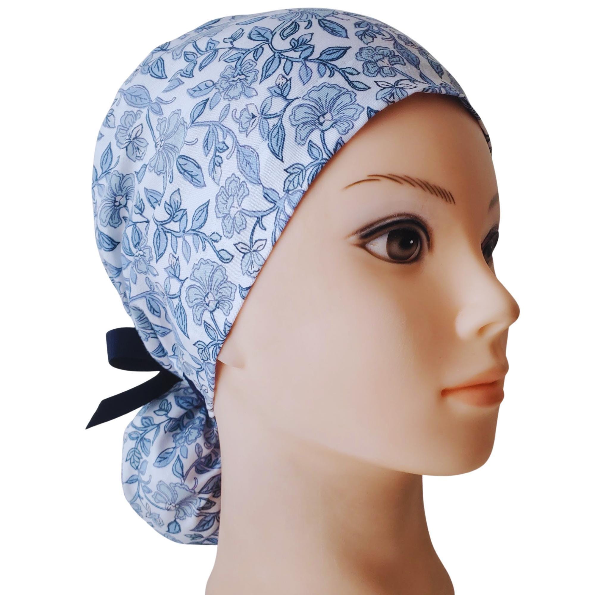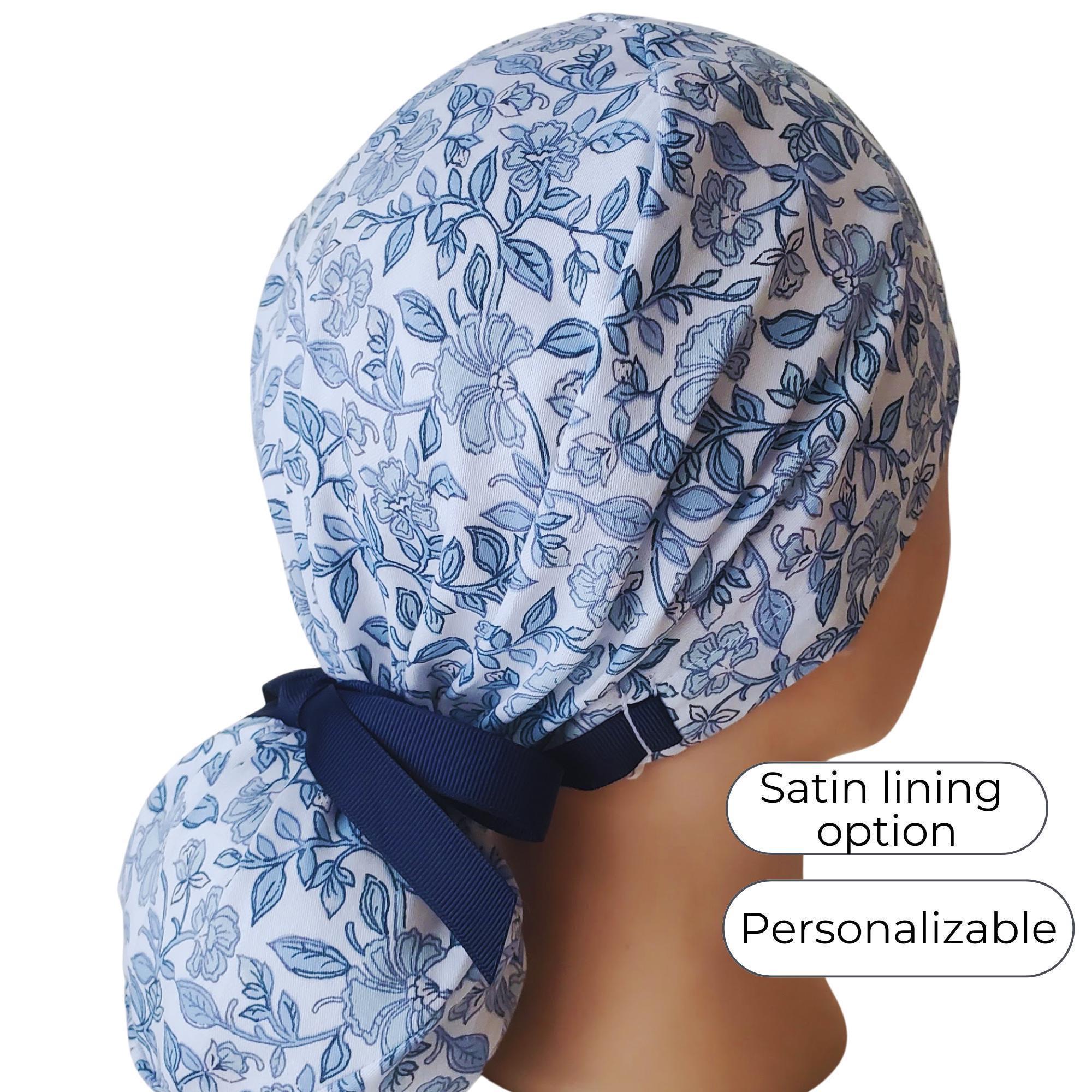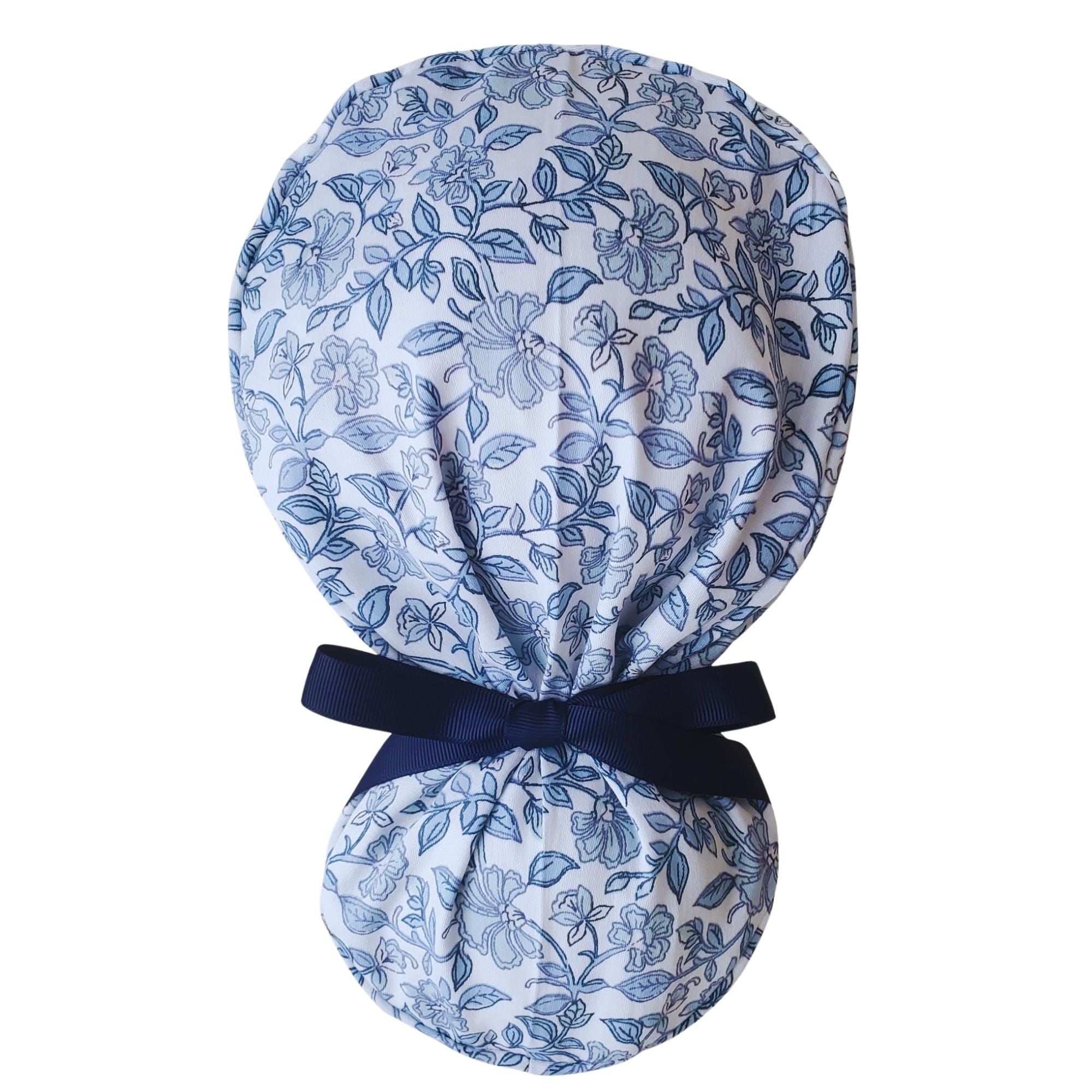 Bring calm and elegance to your shift with this Blue Floral Ponytail Scrub Cap. The delicate navy floral pattern on a crisp white background creates a timeless and professional look. Designed with a roomy ponytail pouch, this cap keeps long hair tucked away neatly, while the optional satin lining helps prevent frizz and breakage during long shifts.