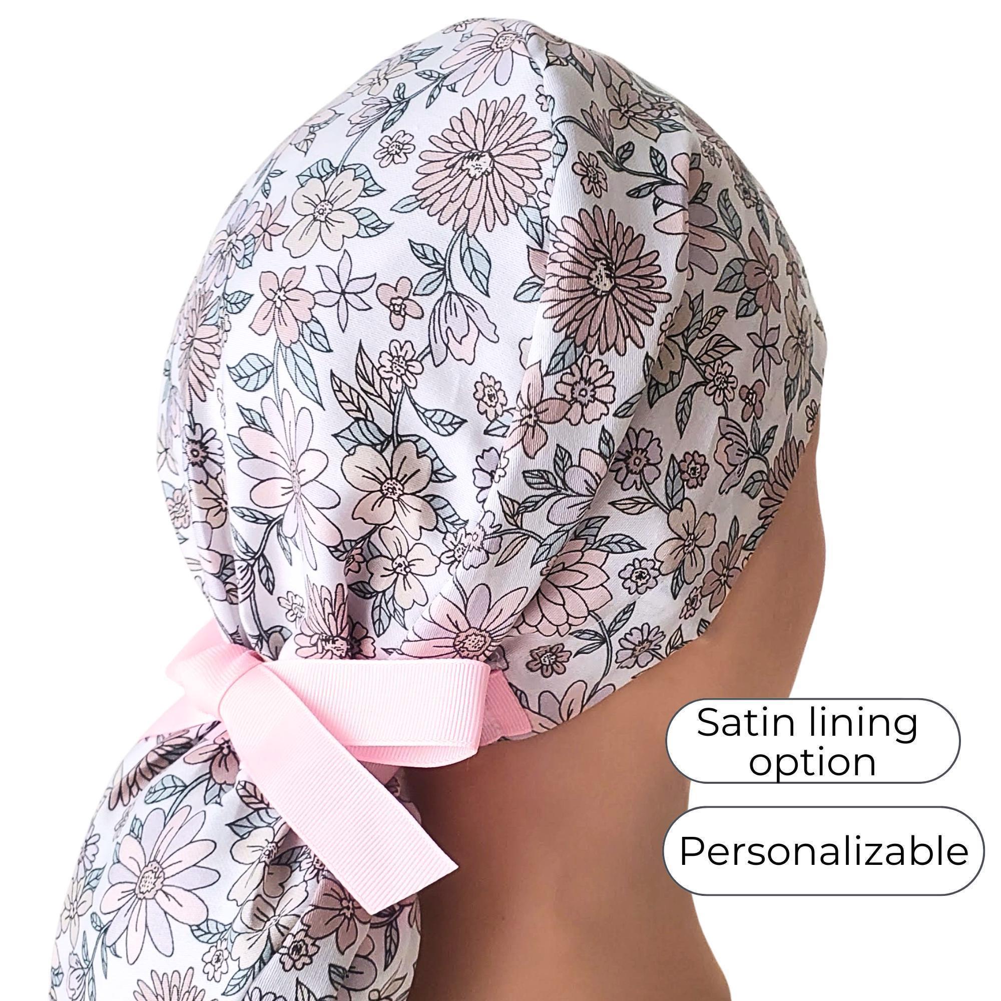 Brighten your workday with this Light Pink Floral Ponytail Scrub Cap. Featuring a soft white base with gentle pink and gray floral accents, this cap offers a romantic, professional look while keeping hair neatly secured. The spacious ponytail pouch provides full coverage for long hair, while the optional satin lining helps prevent frizz, dryness, and breakage during long shifts.