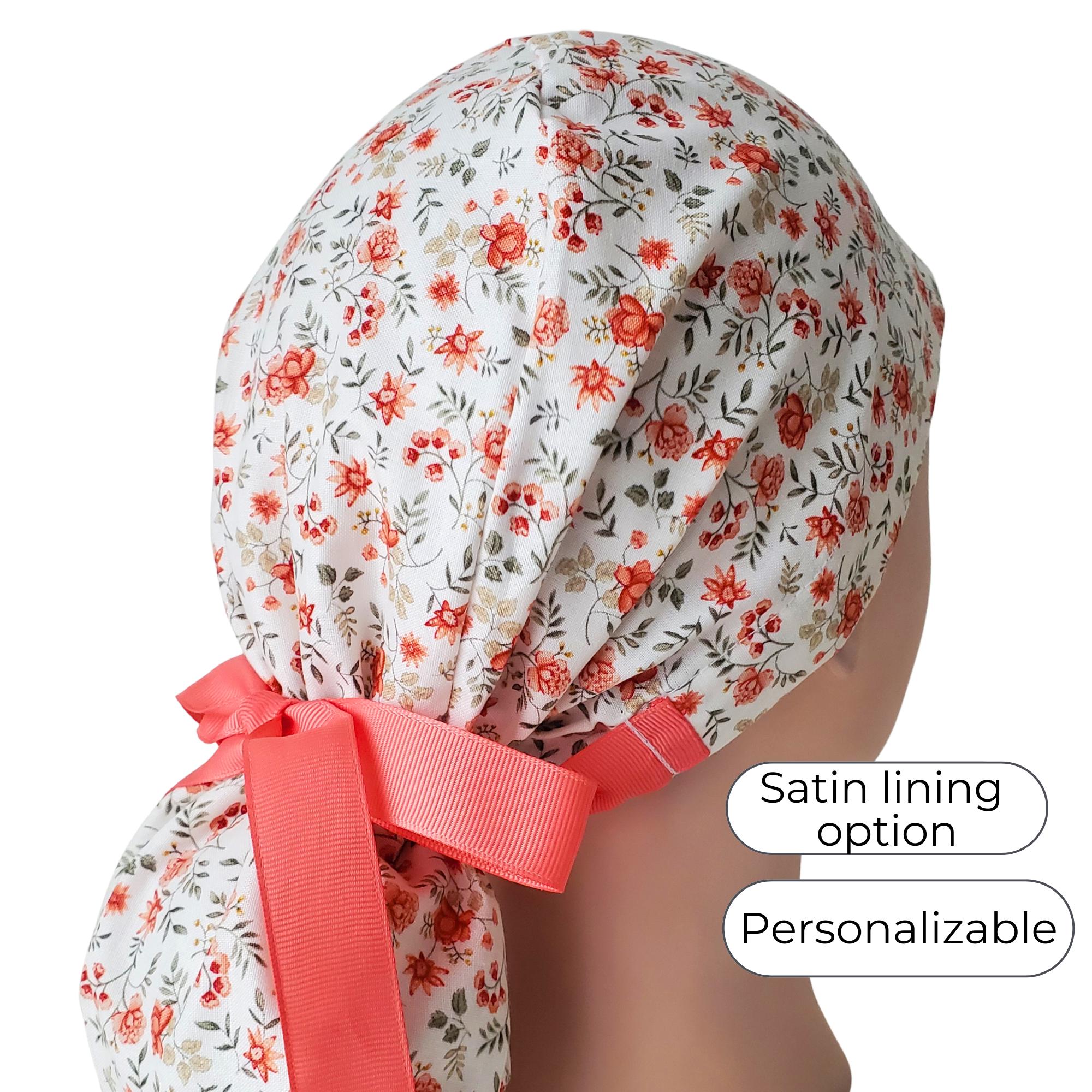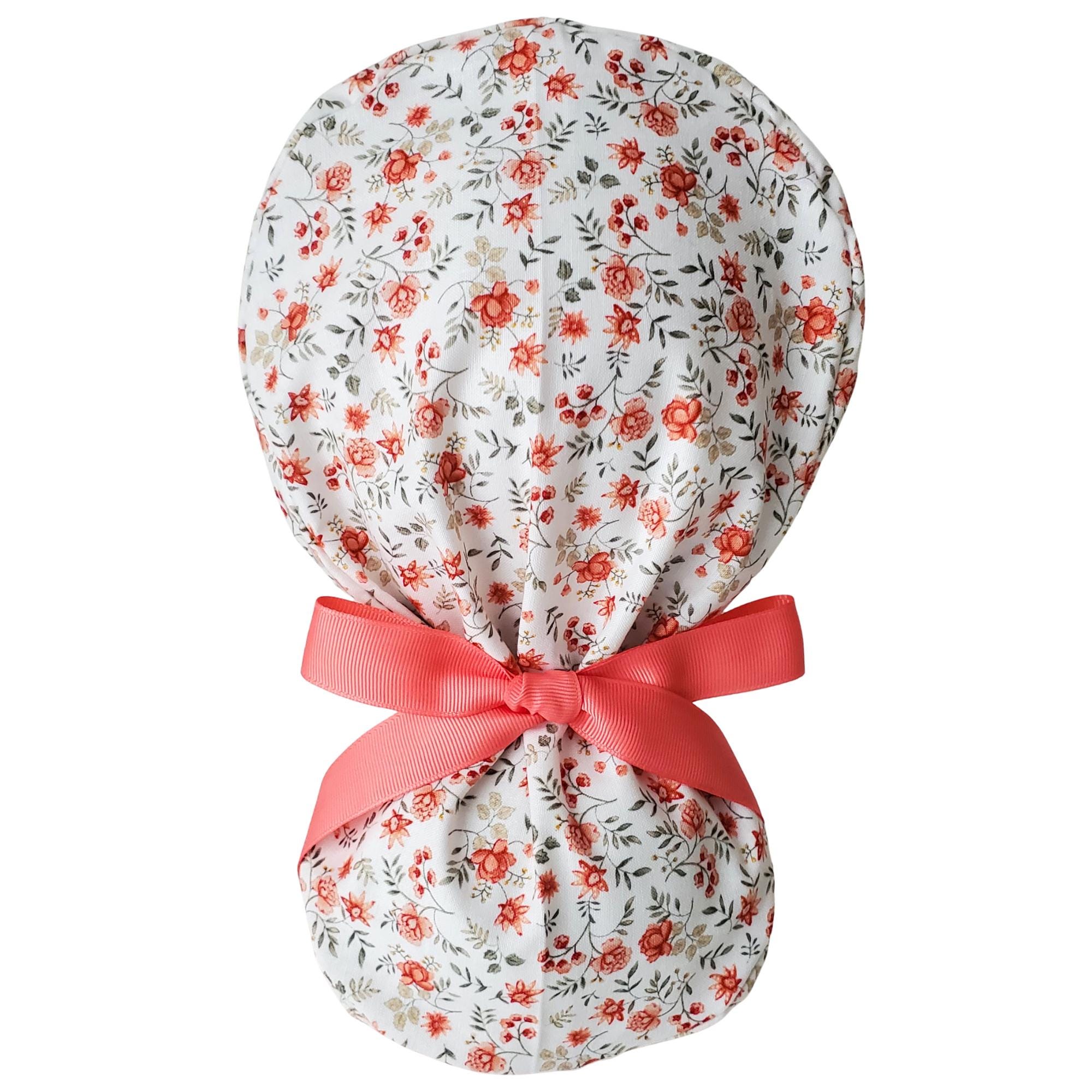 Available with or without a satin lining for added hair protection, this design features a unique white Coral floral print. Each cap is carefully handmade to balance functionality, durability, and style.