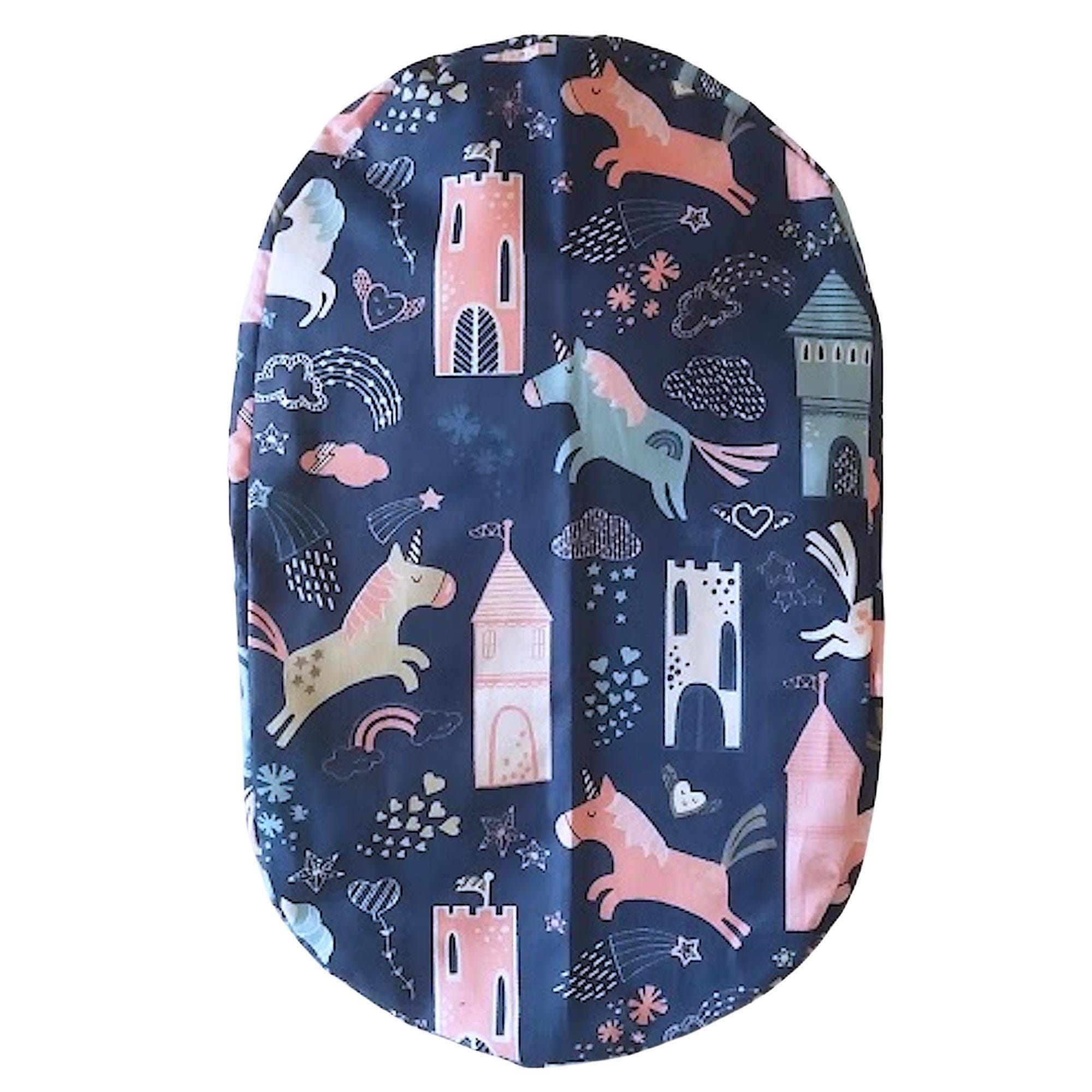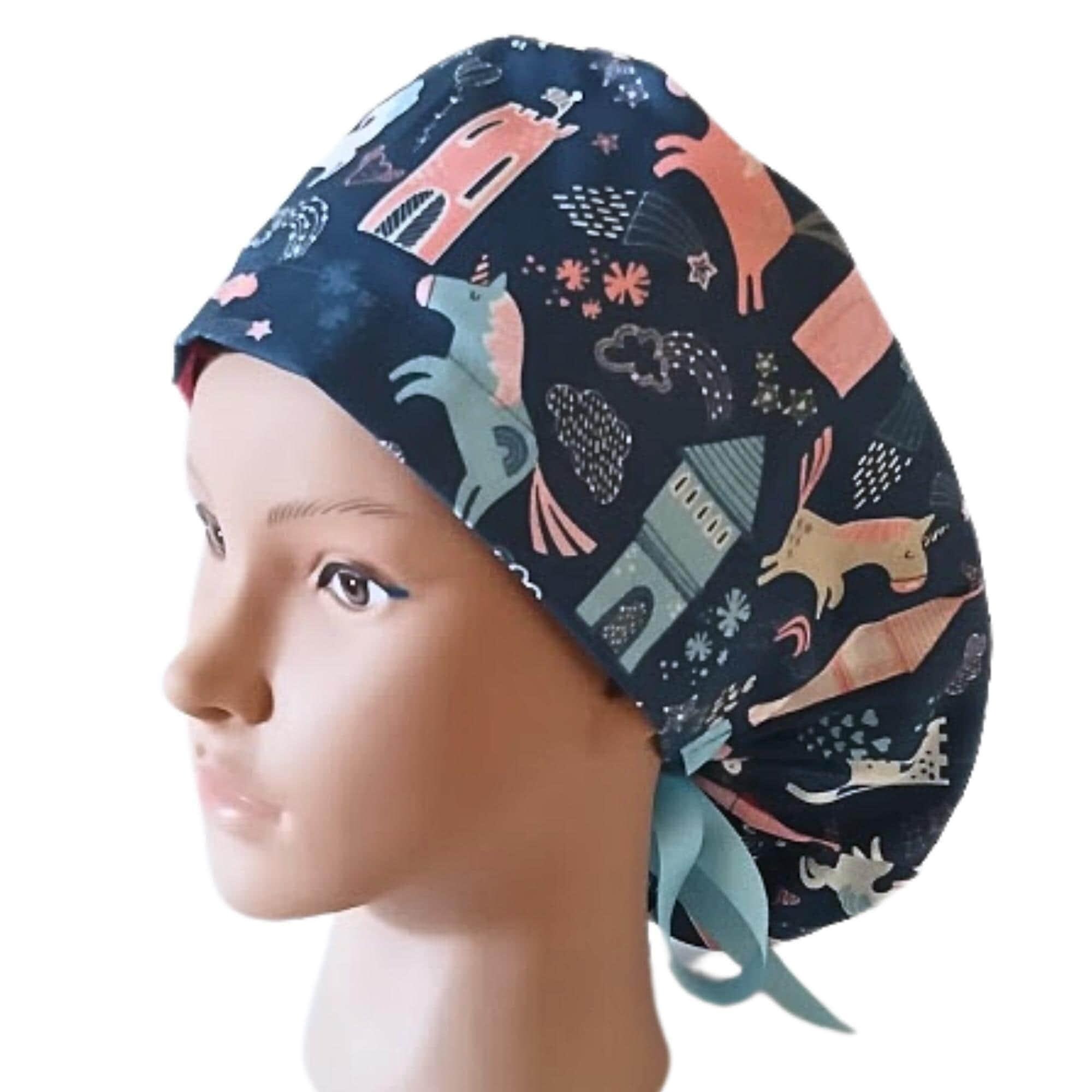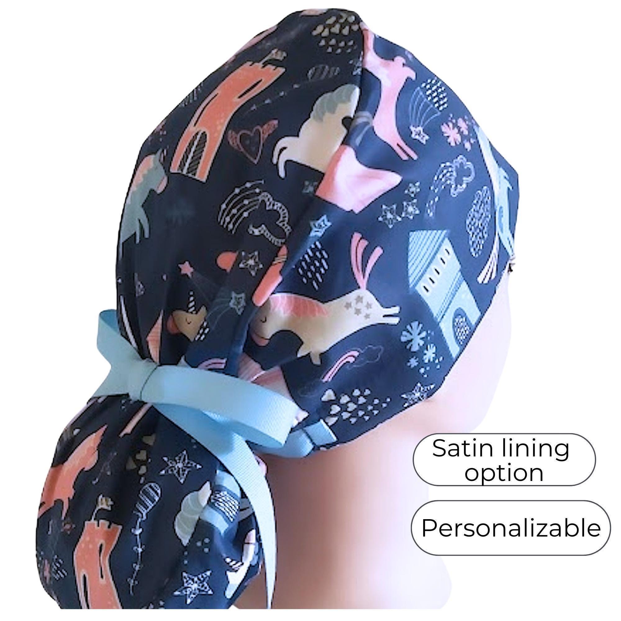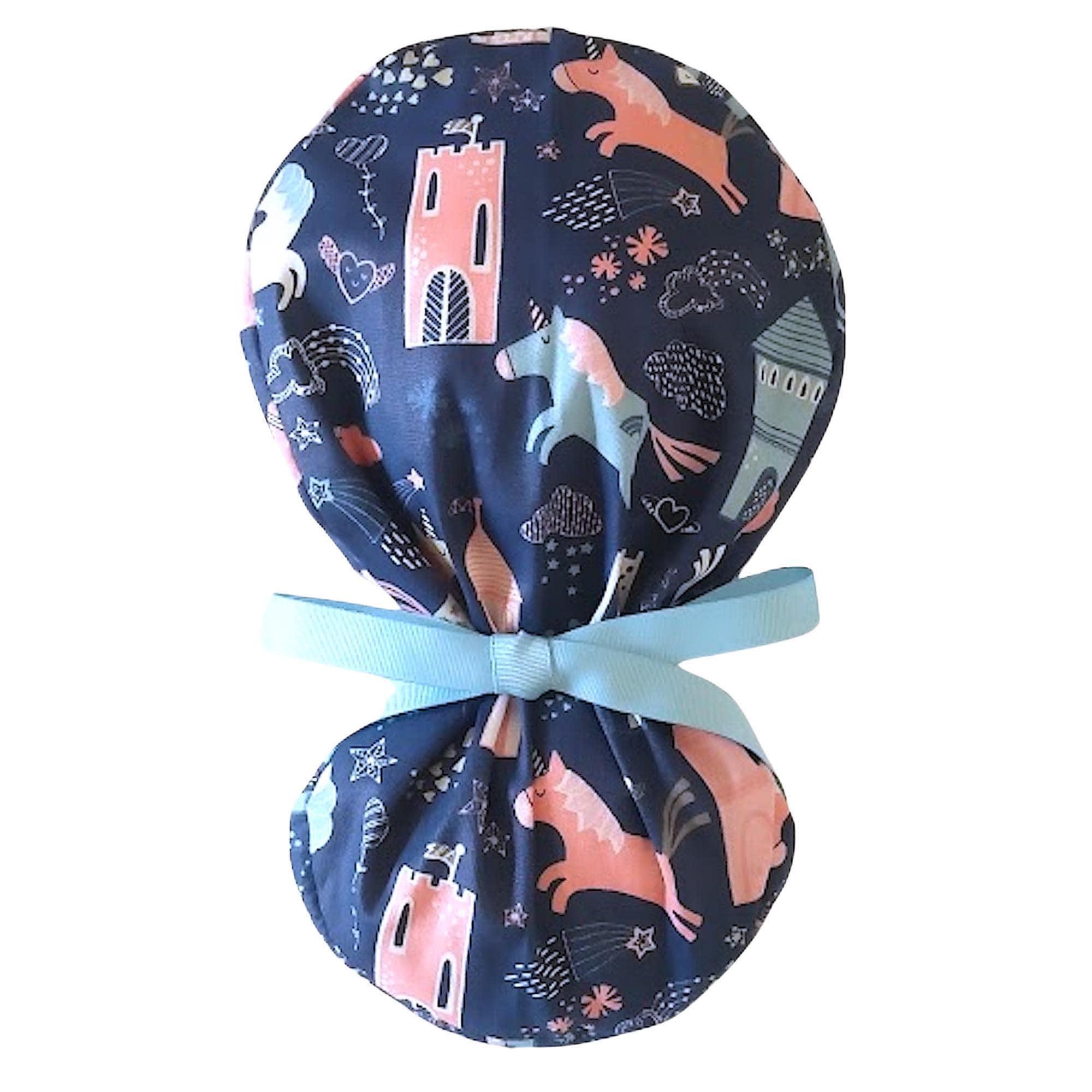 This ponytail scrub cap with satin lining option is handmade from soft, breathable cotton for all-day comfort. Designed as a practical yet stylish scrub cap for women, it features a navy background with playful unicorns, castles, and hearts, finished with a secure elastic back and light blue ribbon ties to keep long hair neatly in place.
