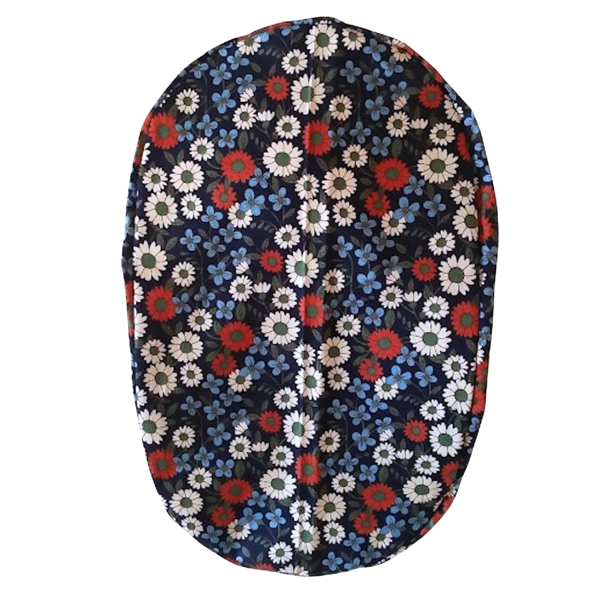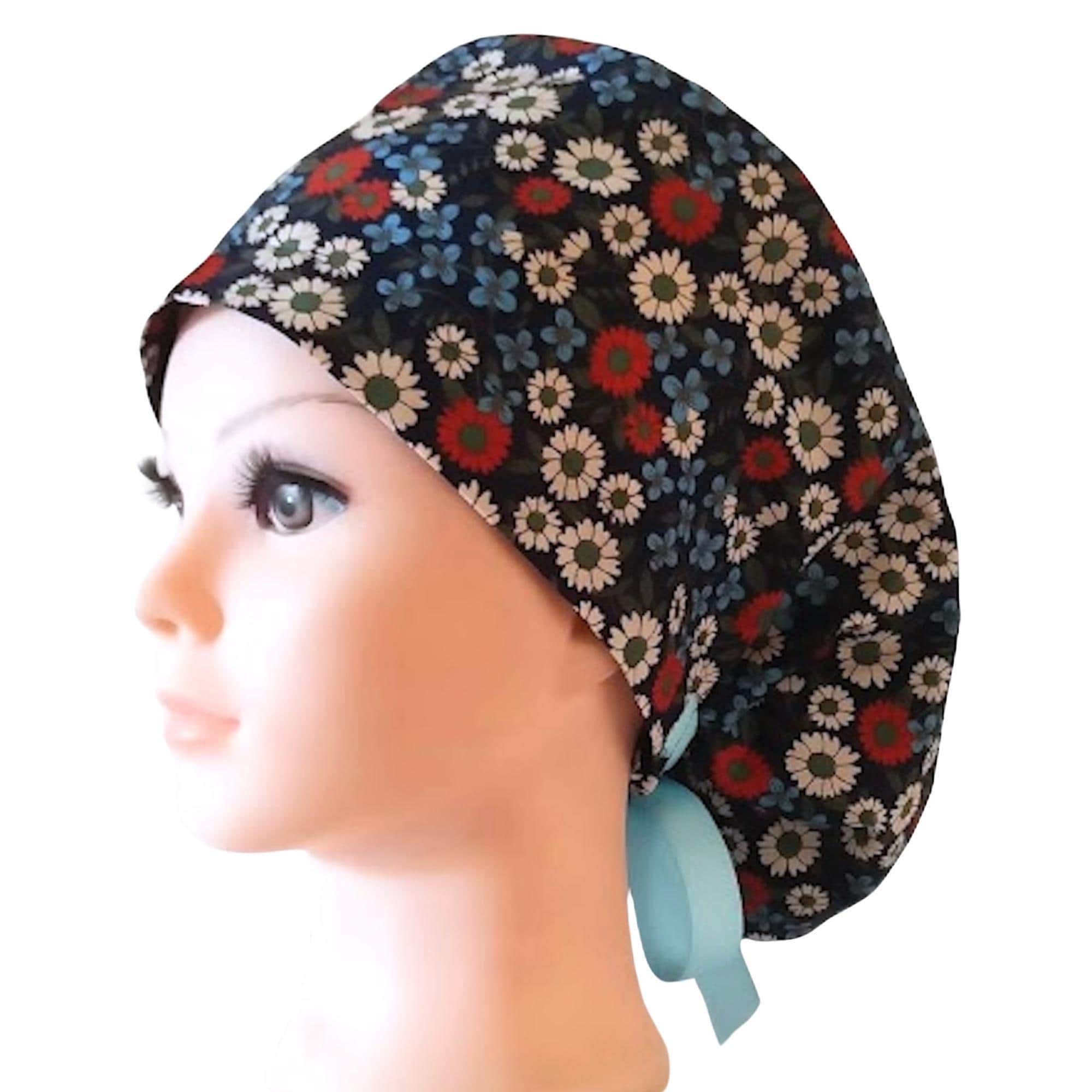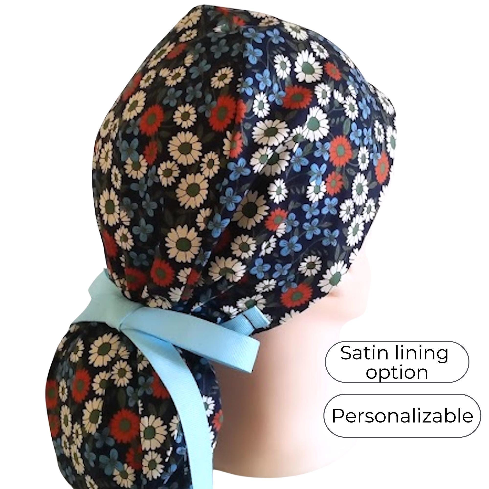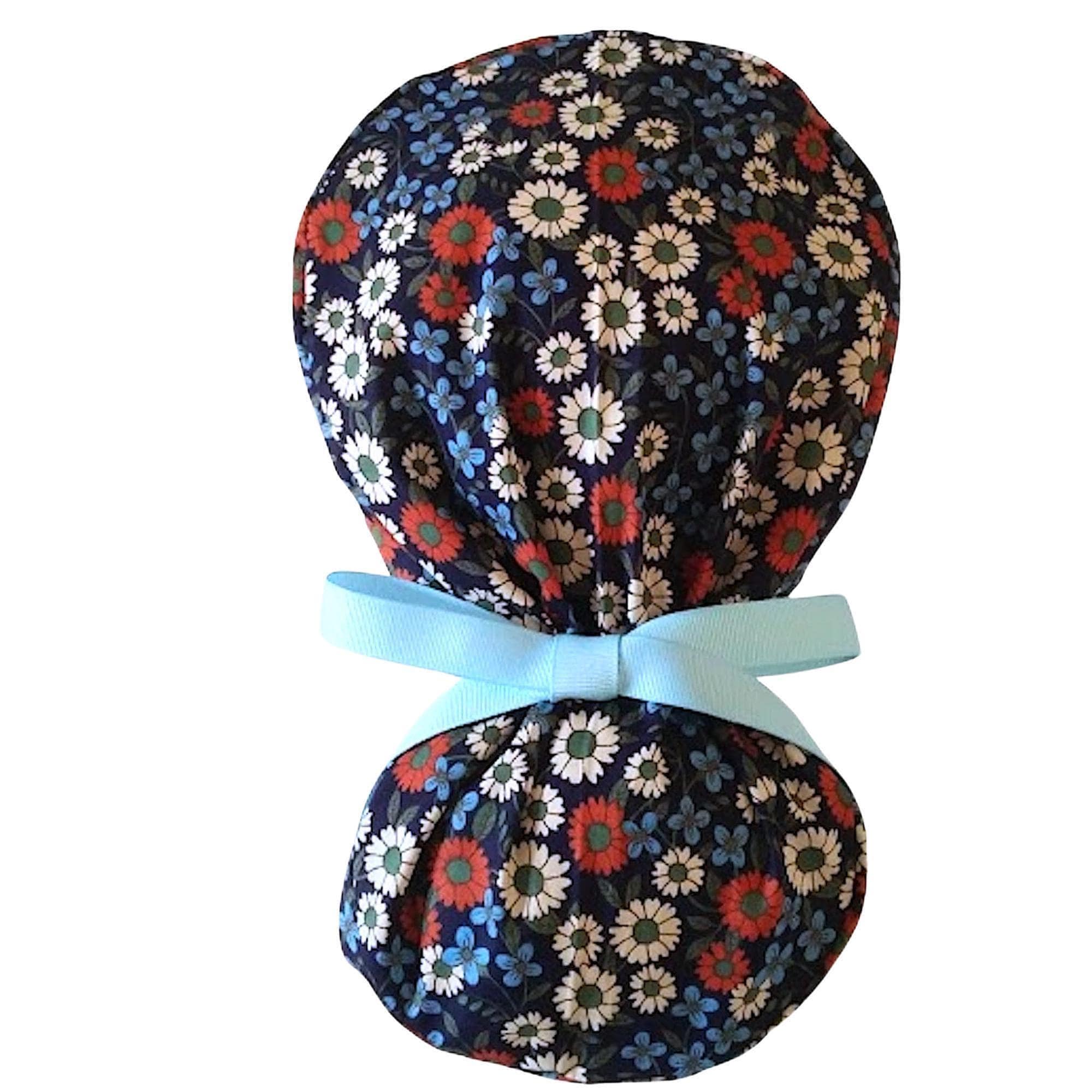 This ponytail scrub cap with satin lining option is handmade from soft, breathable cotton for all-day comfort. Designed as a stylish scrub cap for women, it features a navy background with cheerful red, white, and blue daisy florals, finished with a matching sky blue ribbon tie that keeps long hair neatly in place. This scrub hat is perfect for everyday wear in the operating room, clinic, or hospital.