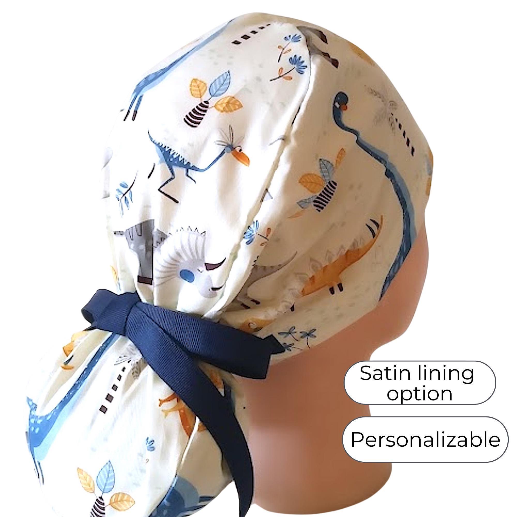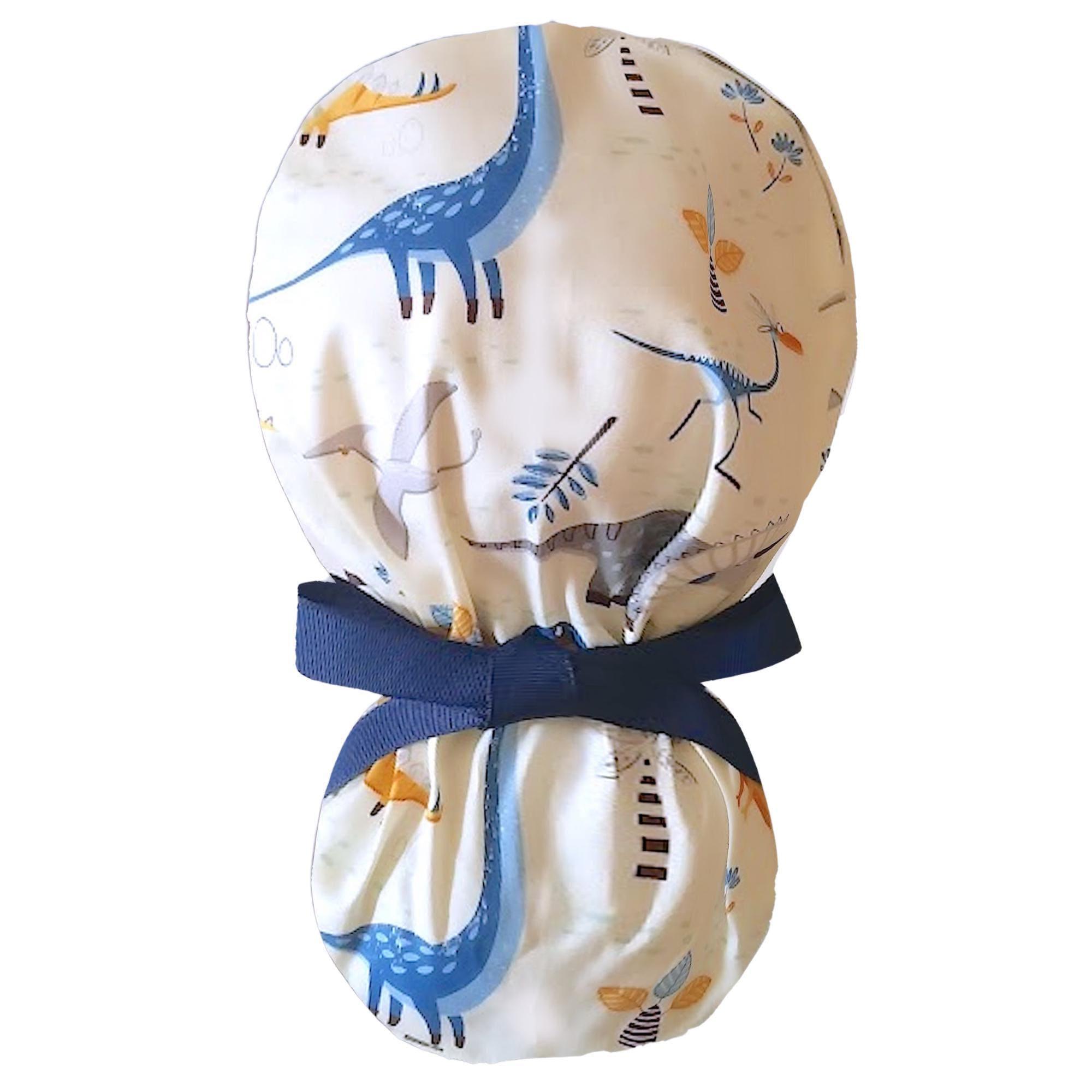 This ponytail scrub cap with satin lining option is handmade from soft, breathable cotton for all-day comfort. Designed as a practical yet stylish scrub cap for women, it features a white background with playful blue and yellow dinosaur print and a secure elastic back with navy ribbon ties that keep long hair neatly in place. This scrub hat is ideal for everyday wear in the operating room, clinic, or hospital.