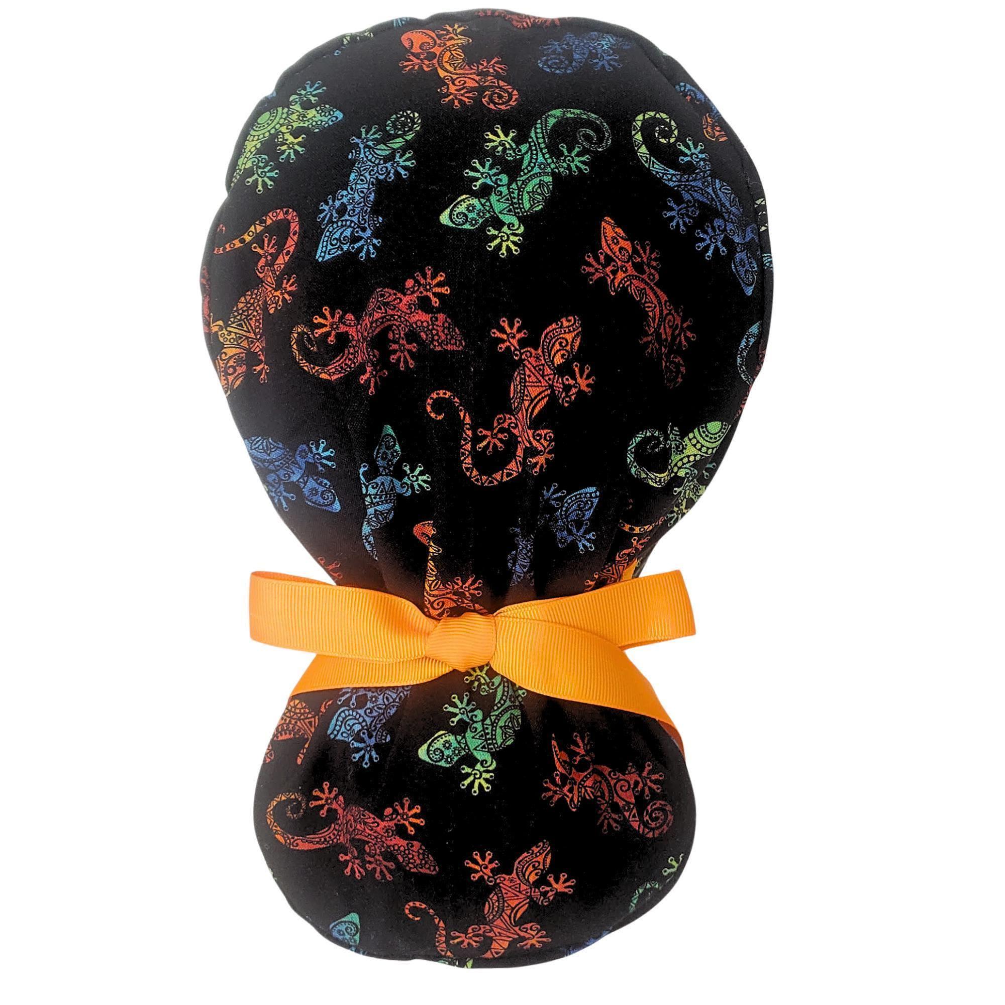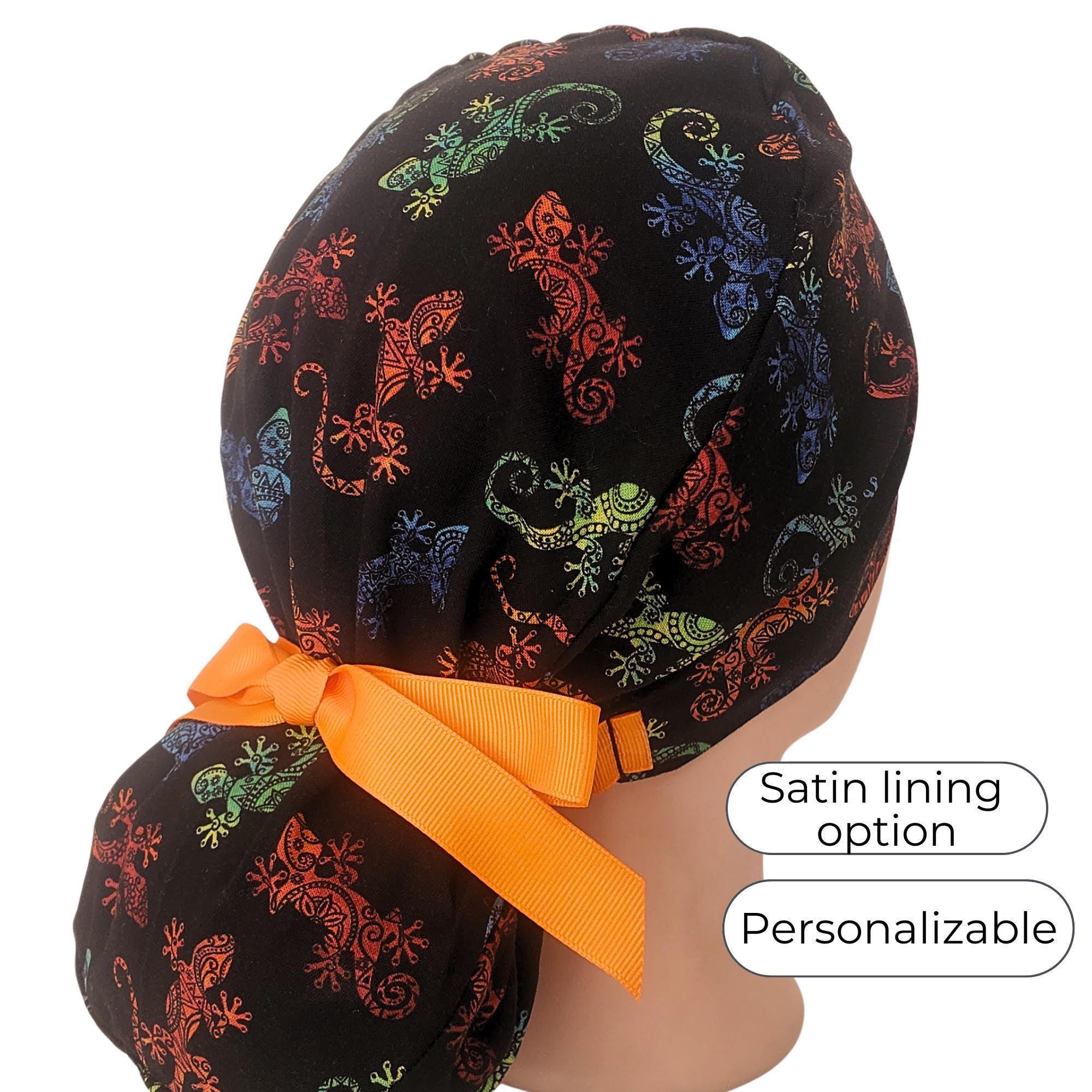 Add a pop of fun to your workday with this Gecko Print Ponytail Scrub Cap. Featuring a bold black background with colorful gecko designs, this scrub hat blends playful style with everyday practicality. The roomy ponytail pouch keeps long hair neatly secured, while the optional satin lining protects hair from frizz and breakage during long shifts.