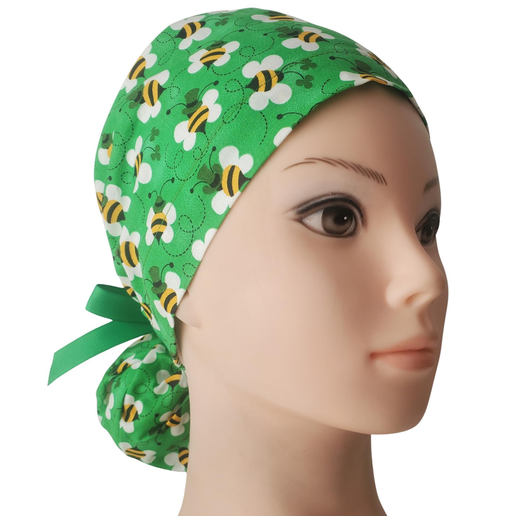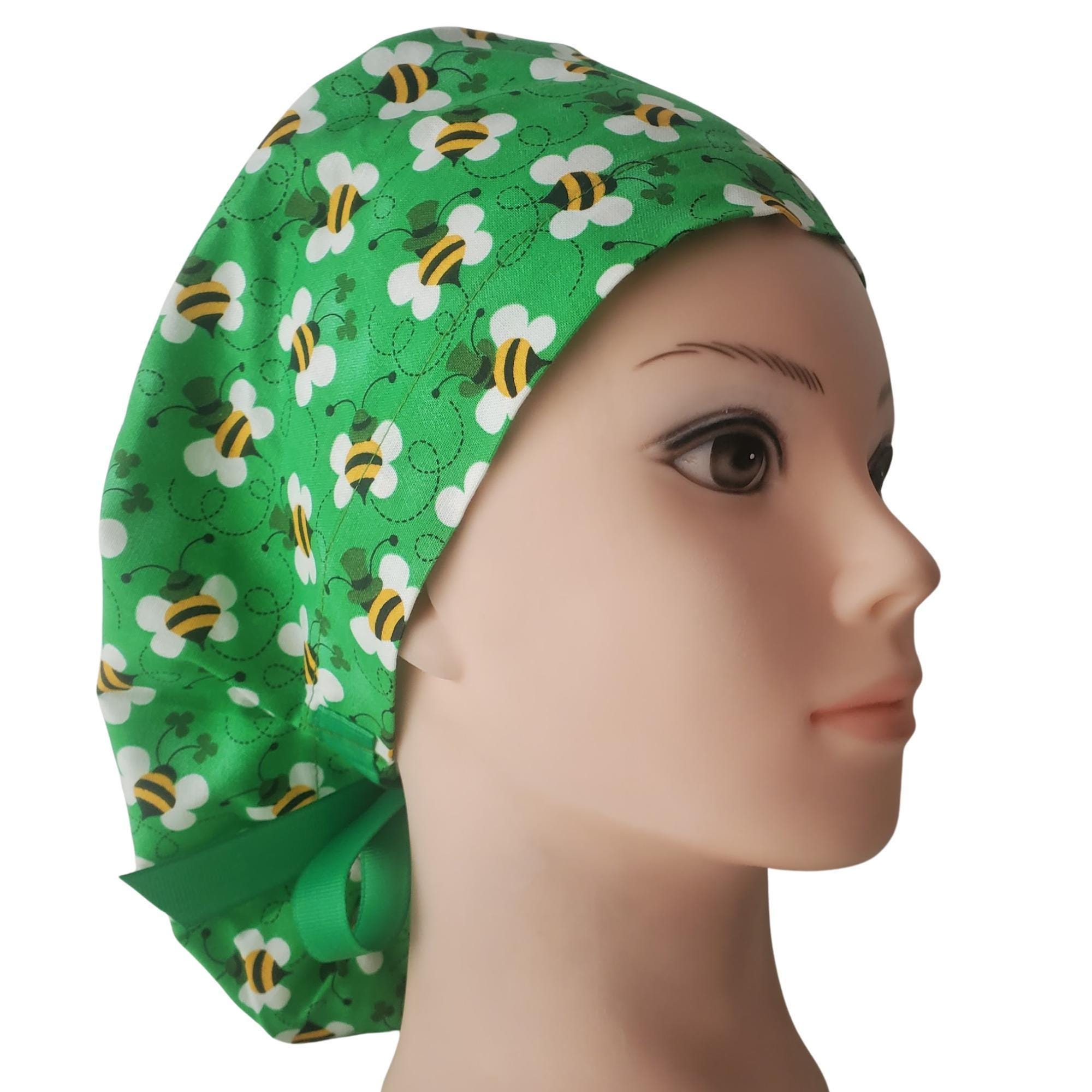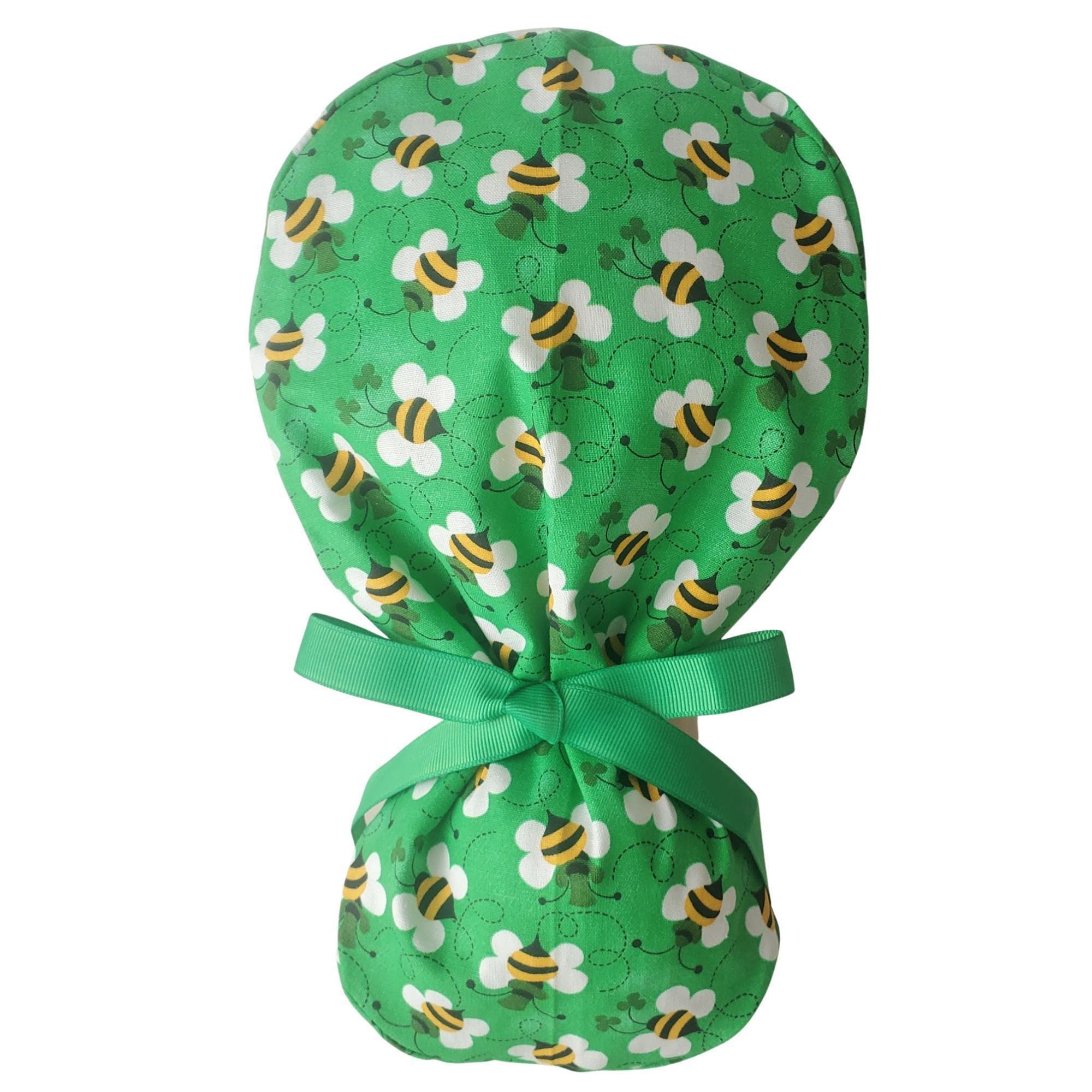 Add a touch of cheer to your workday with this Green Bee Ponytail Scrub Cap. Featuring a playful bee and clover print on a vibrant green background, this cap is perfect for healthcare workers who want style and comfort in one. Designed in a ponytail style, it provides plenty of room for long hair and stays secure through long shifts.