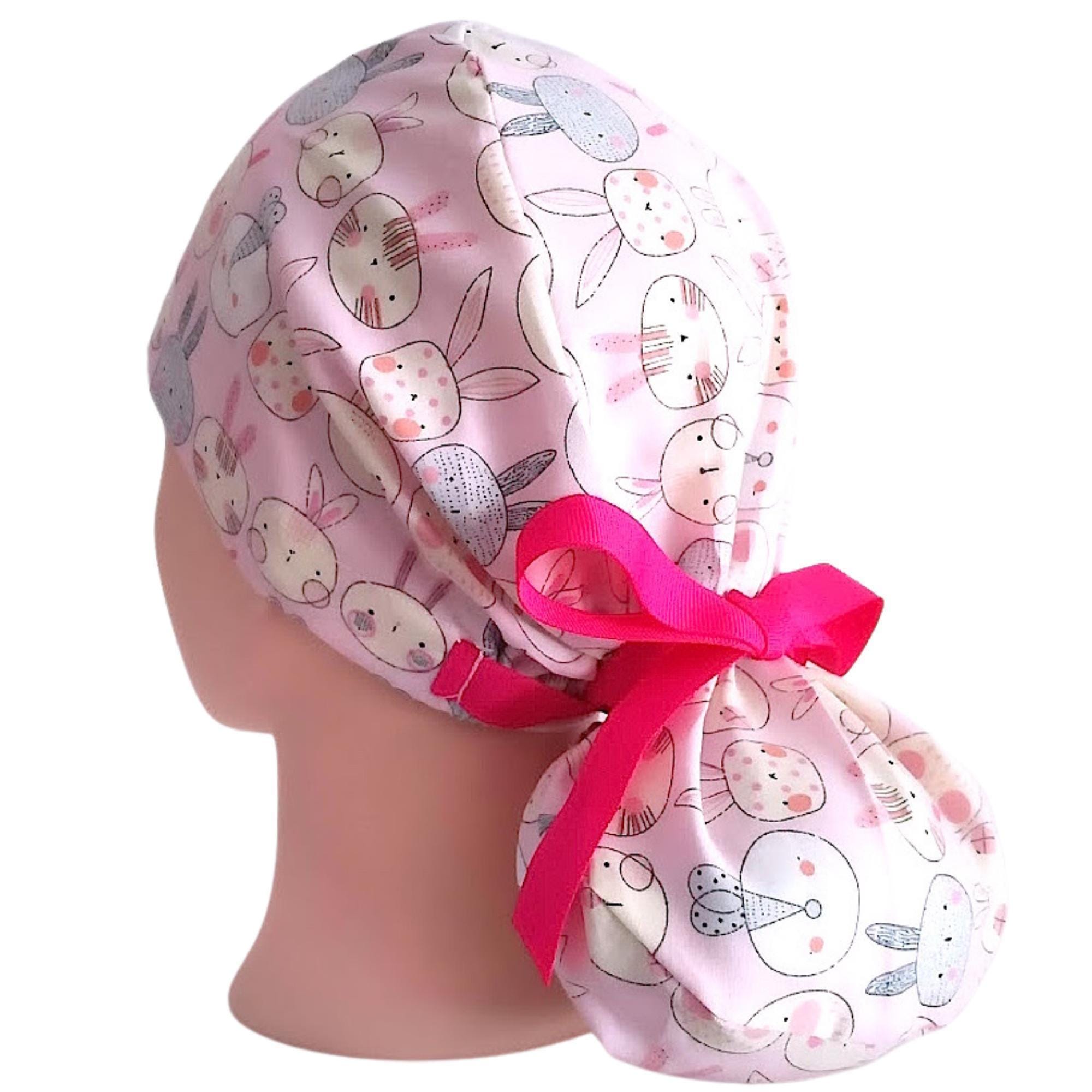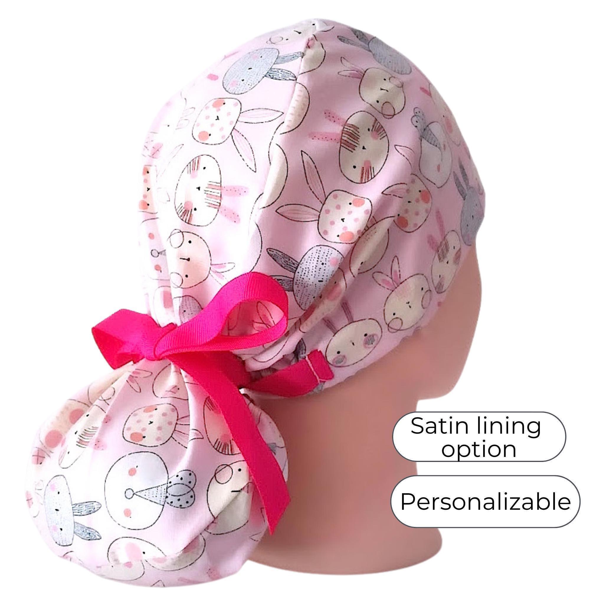 This ponytail scrub cap with satin lining option is handmade from soft cotton, featuring an adorable pink bunny print with a playful hot pink ribbon tie. Designed as a practical yet stylish scrub cap for women, it combines breathable comfort with durability, perfect for long shifts.