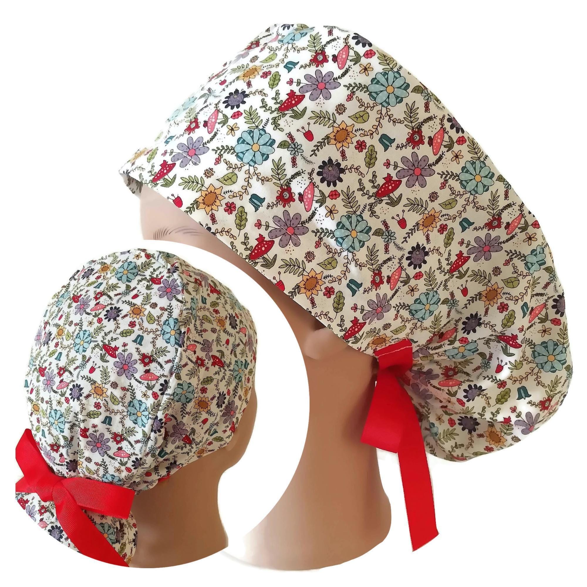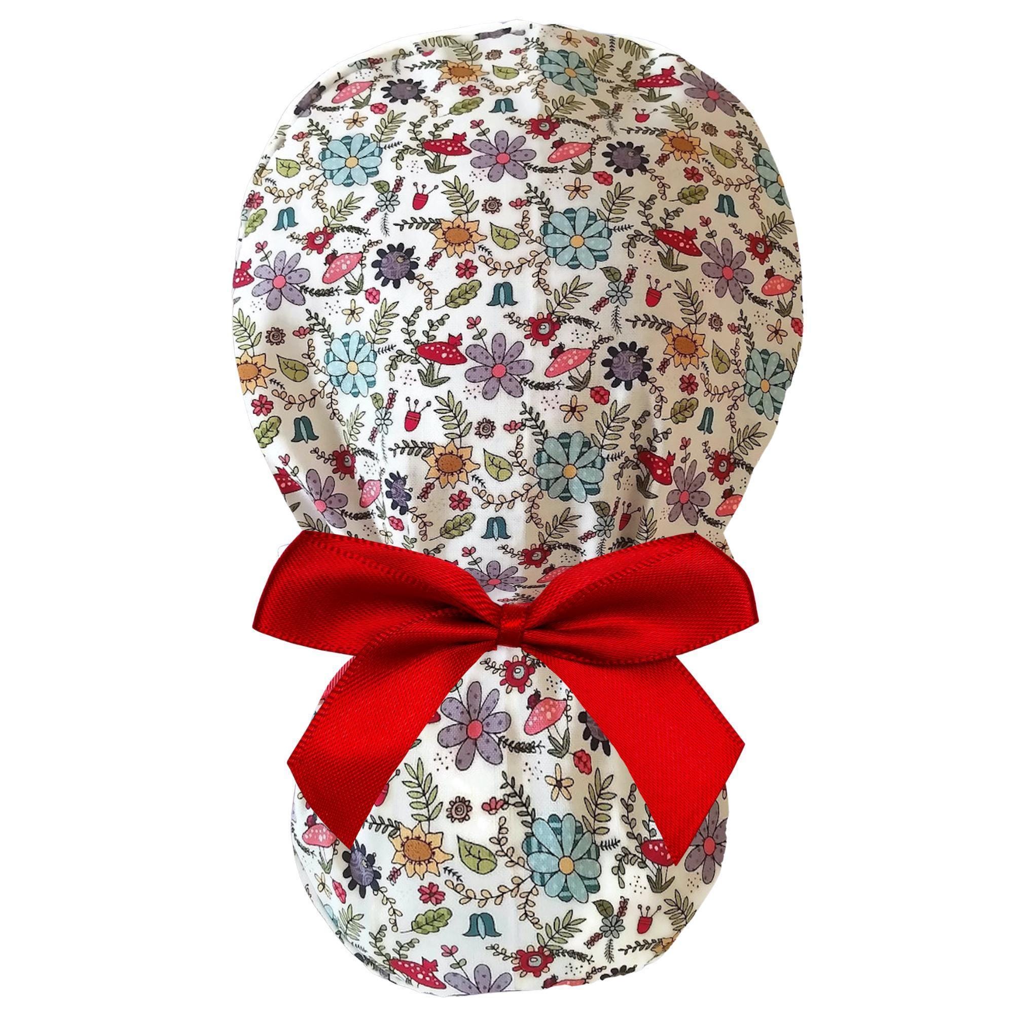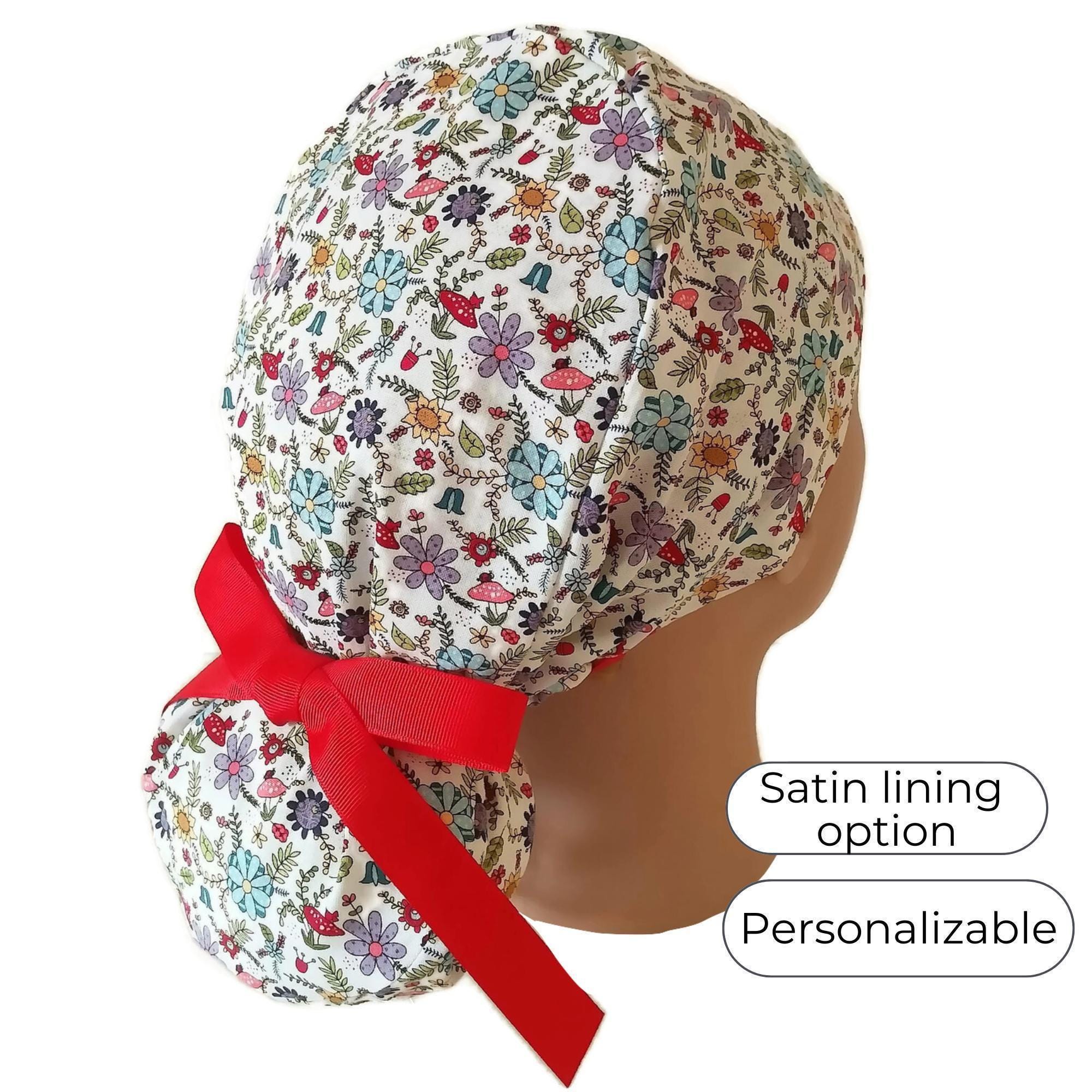 Mushroom Floral Ponytail Scrub Cap for Women with Satin Lining Option