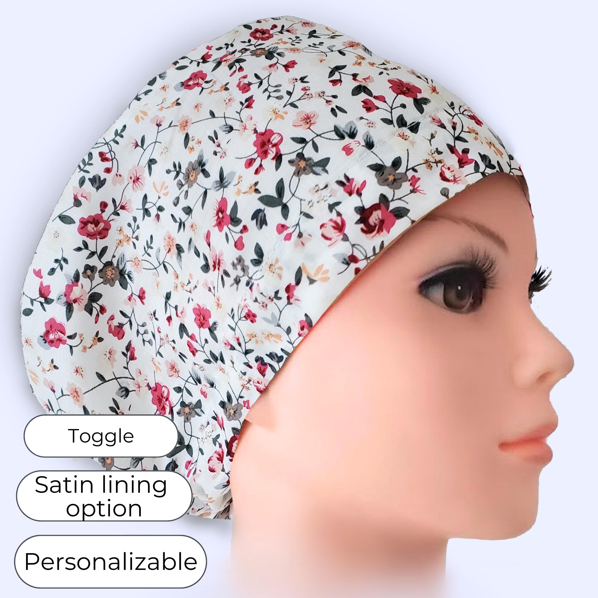 Add charm and comfort to your workday with this Red Floral Euro Scrub Cap, perfect for healthcare professionals who want both style and function. With its elegant white background and red flower pattern, this cap is eye-catching yet practical. The euro style design fits close to the head, while the adjustable toggle ensures a secure and comfortable fit. Optional satin lining helps protect hair from frizz, dryness, and breakage during long shifts.