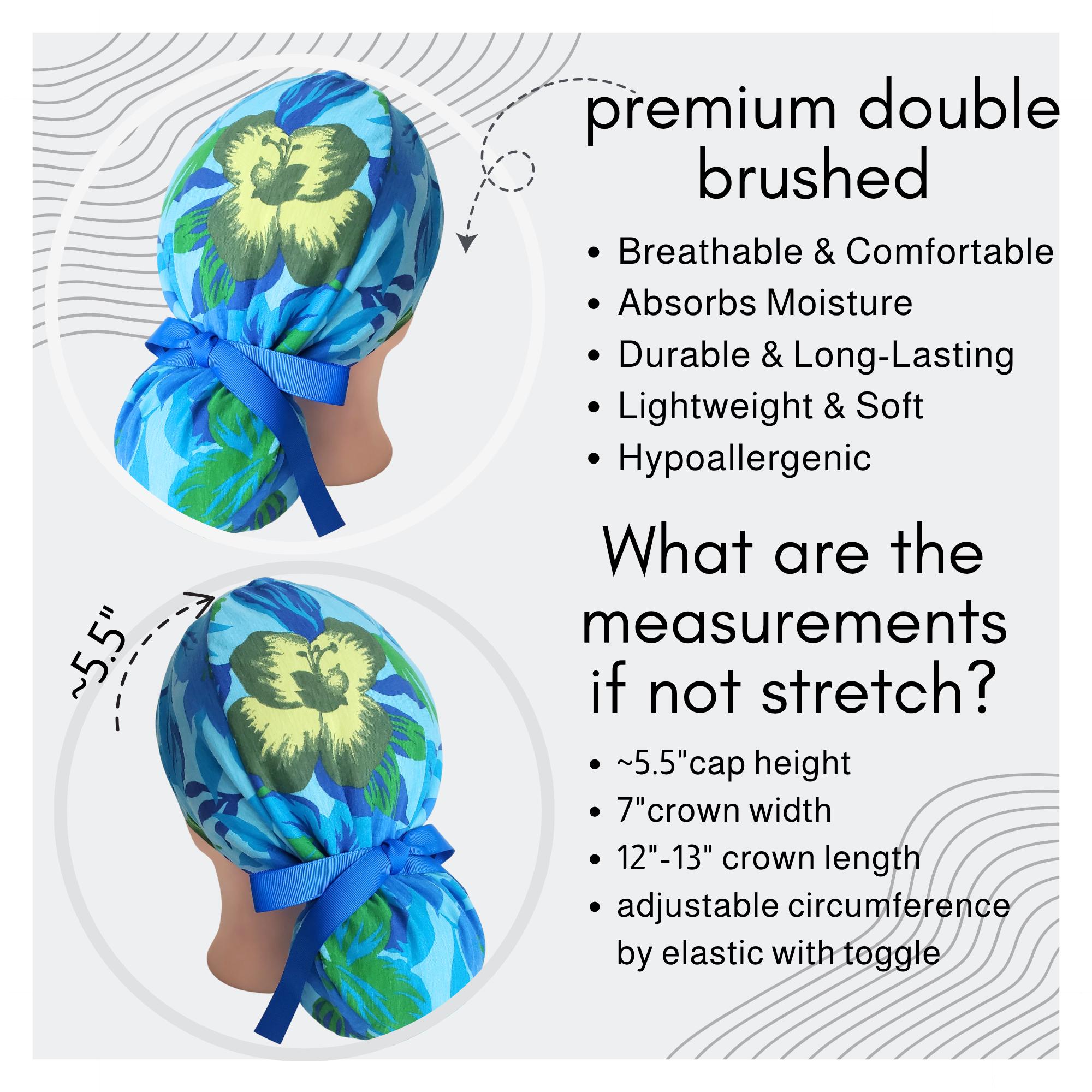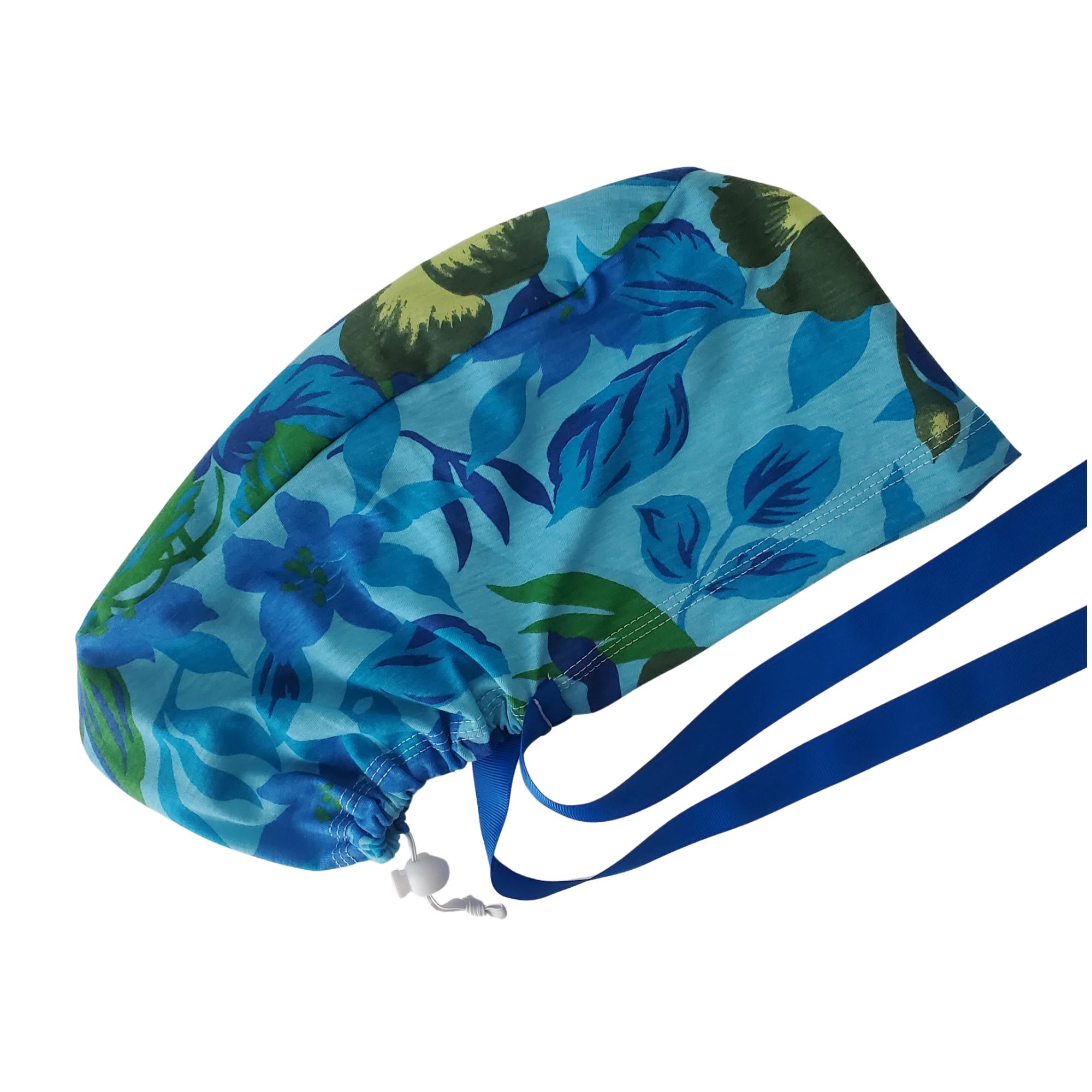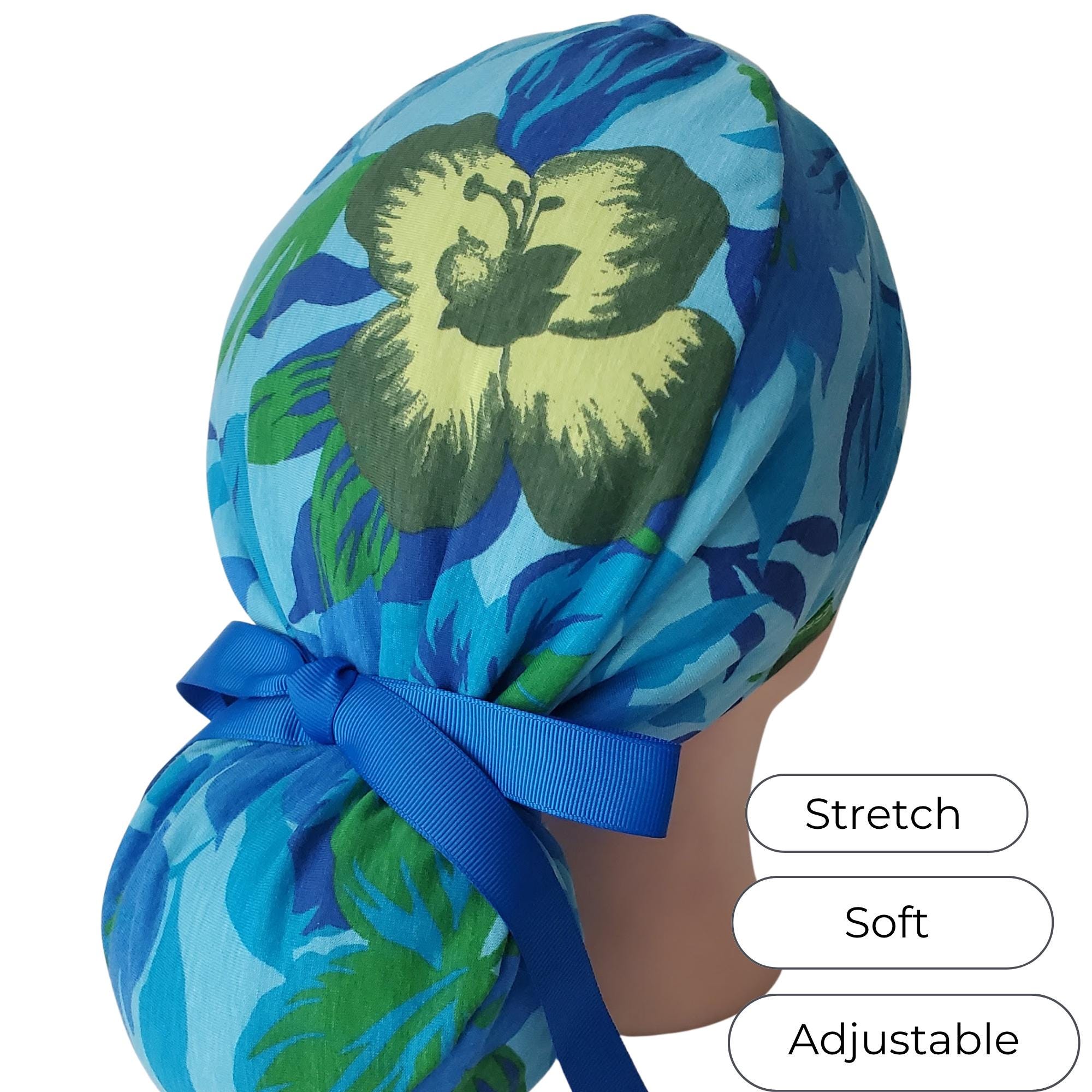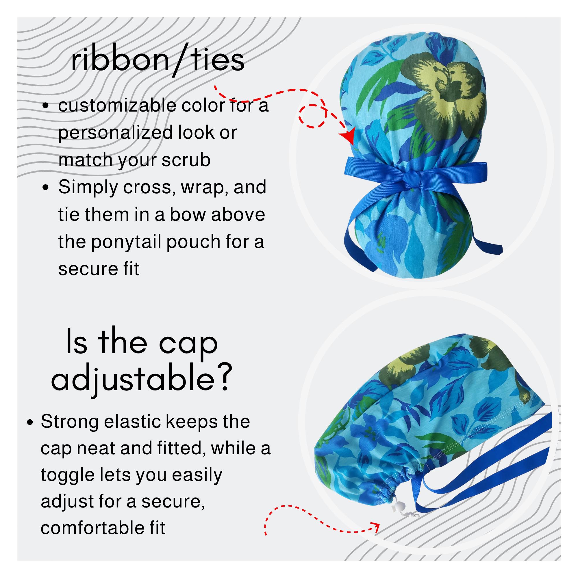 Bring a bold and refreshing look to your workwear with this stretch Cotton ponytail scrub cap featuring a blue tropical floral print. Designed from soft, breathable stretch like t-shirt fabric, it delivers all-day comfort and a secure fit during long shifts. The deep ponytail pouch keeps long or thick hair neatly contained, while the adjustable toggle ensures a customized fit that stays put. Finished with a matching royal blue ribbon tie, this cap combines function with a vibrant, professional style. Stretchy like t-shirt fabric and easy to care for, it’s perfect for nurses, doctors, vet techs, and healthcare workers who love a touch of tropical flair in their scrubs.