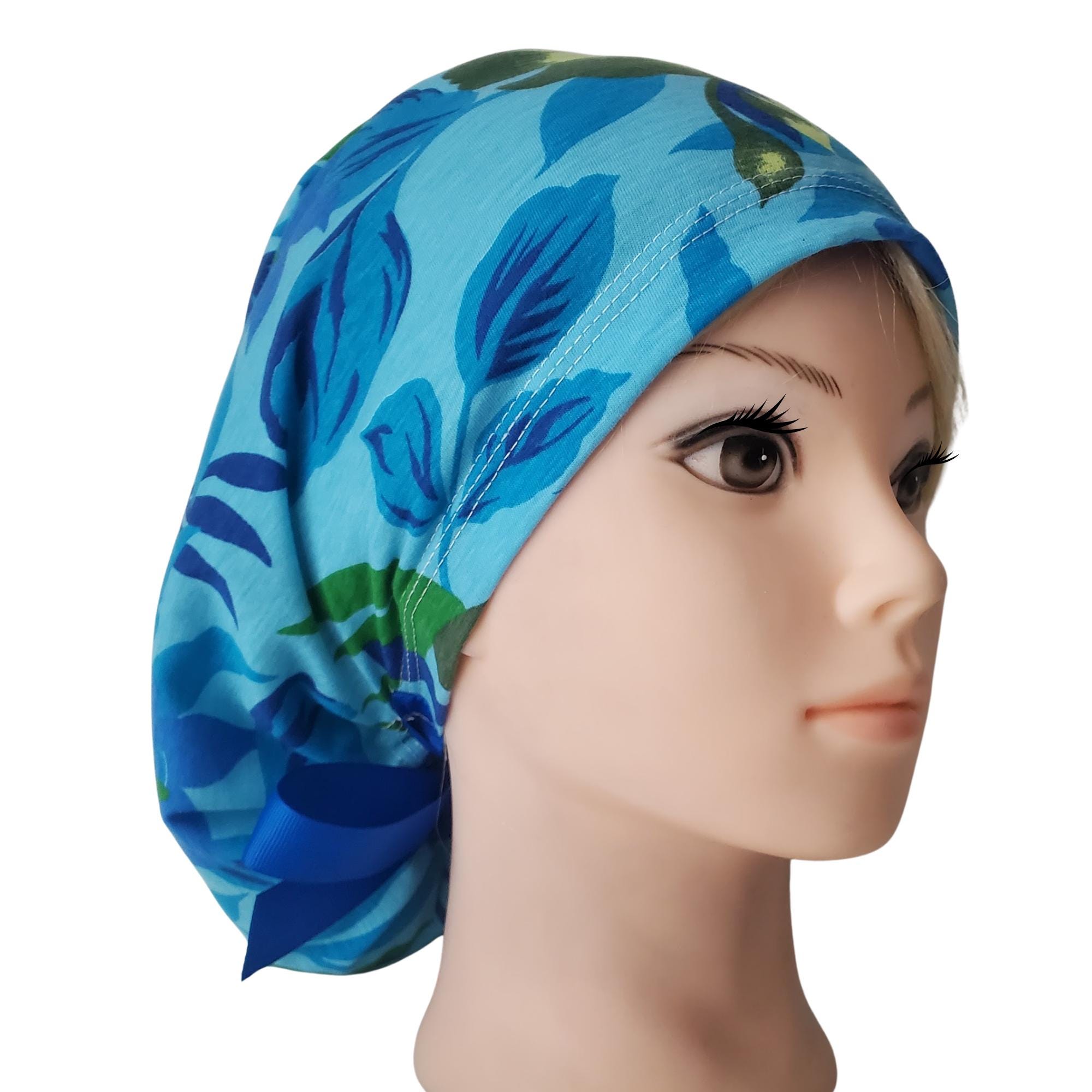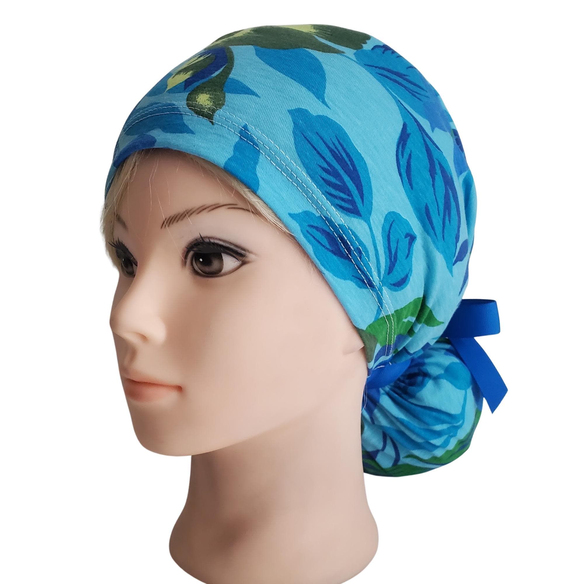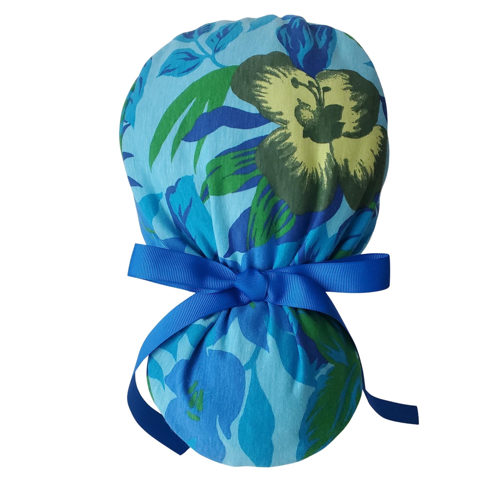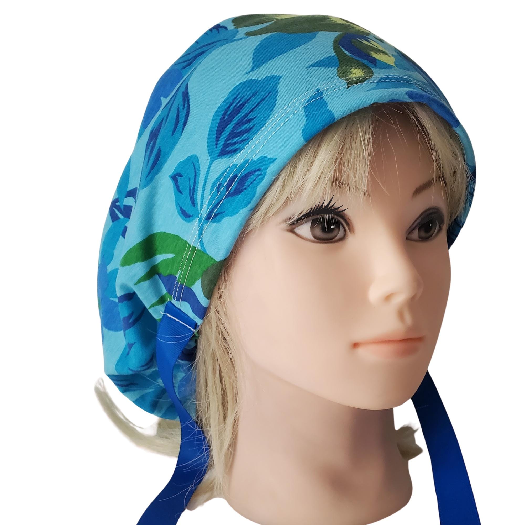 Bring a bold and refreshing look to your workwear with this stretch Cotton ponytail scrub cap featuring a blue tropical floral print. Designed from soft, breathable stretch like t-shirt fabric, it delivers all-day comfort and a secure fit during long shifts. The deep ponytail pouch keeps long or thick hair neatly contained, while the adjustable toggle ensures a customized fit that stays put. Finished with a matching royal blue ribbon tie, this cap combines function with a vibrant, professional style. Stretchy like t-shirt fabric and easy to care for, it’s perfect for nurses, doctors, vet techs, and healthcare workers who love a touch of tropical flair in their scrubs.