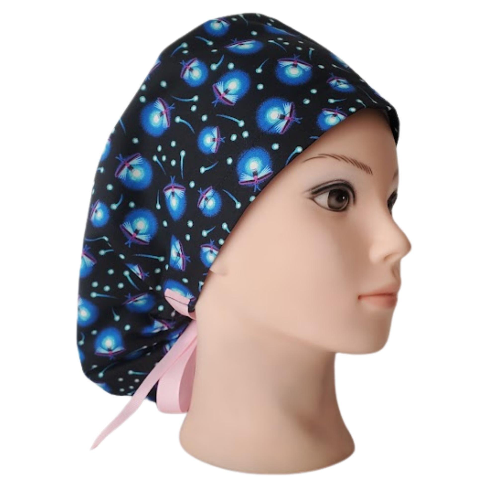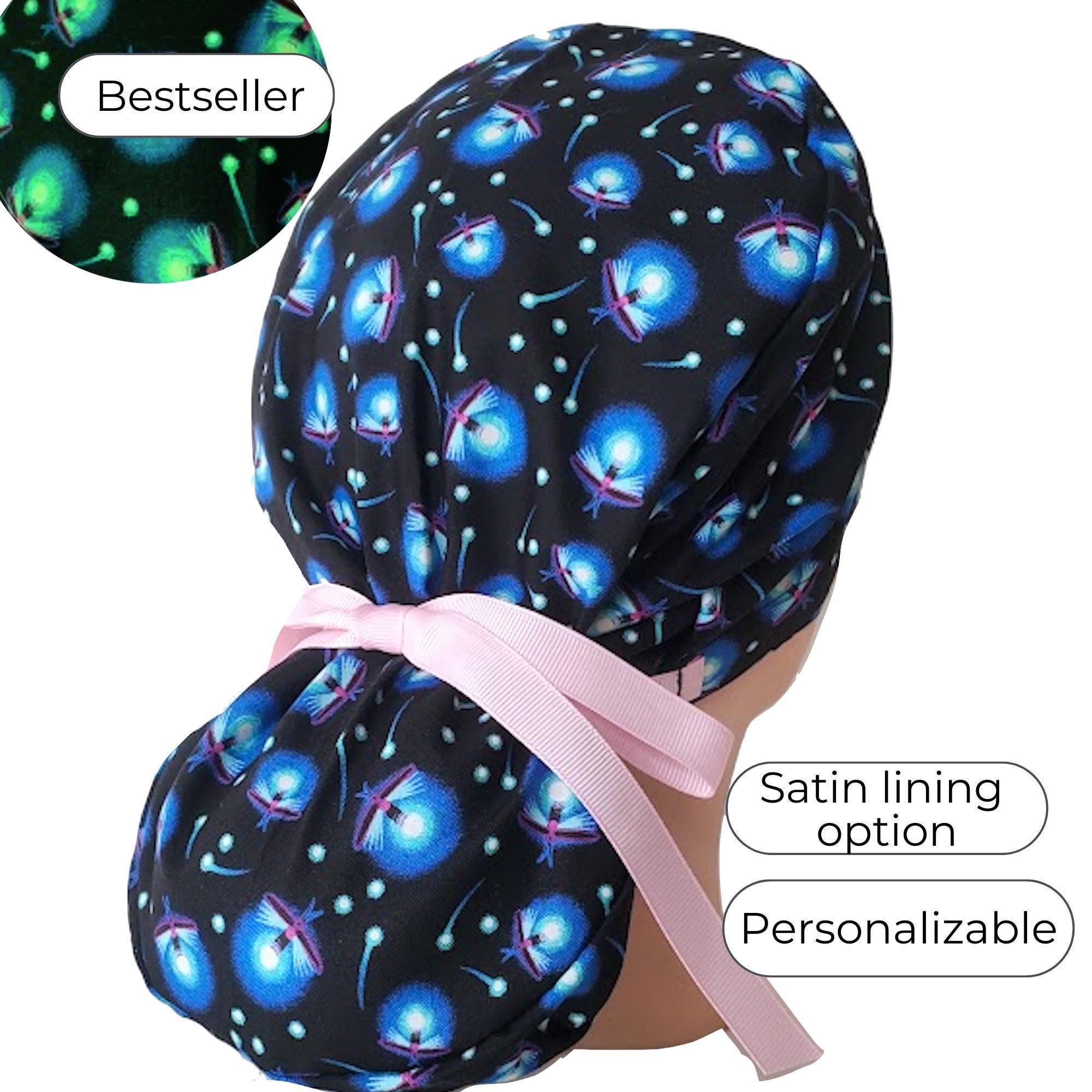Ponytail Scrub Cap in Glow Firefly Print โ handmade surgical scrub hat designed for women with long hair. Featuring glowing blue-green fireflies against a black background, this cap brings a unique look while keeping your hair secure and comfortable during long shifts.
