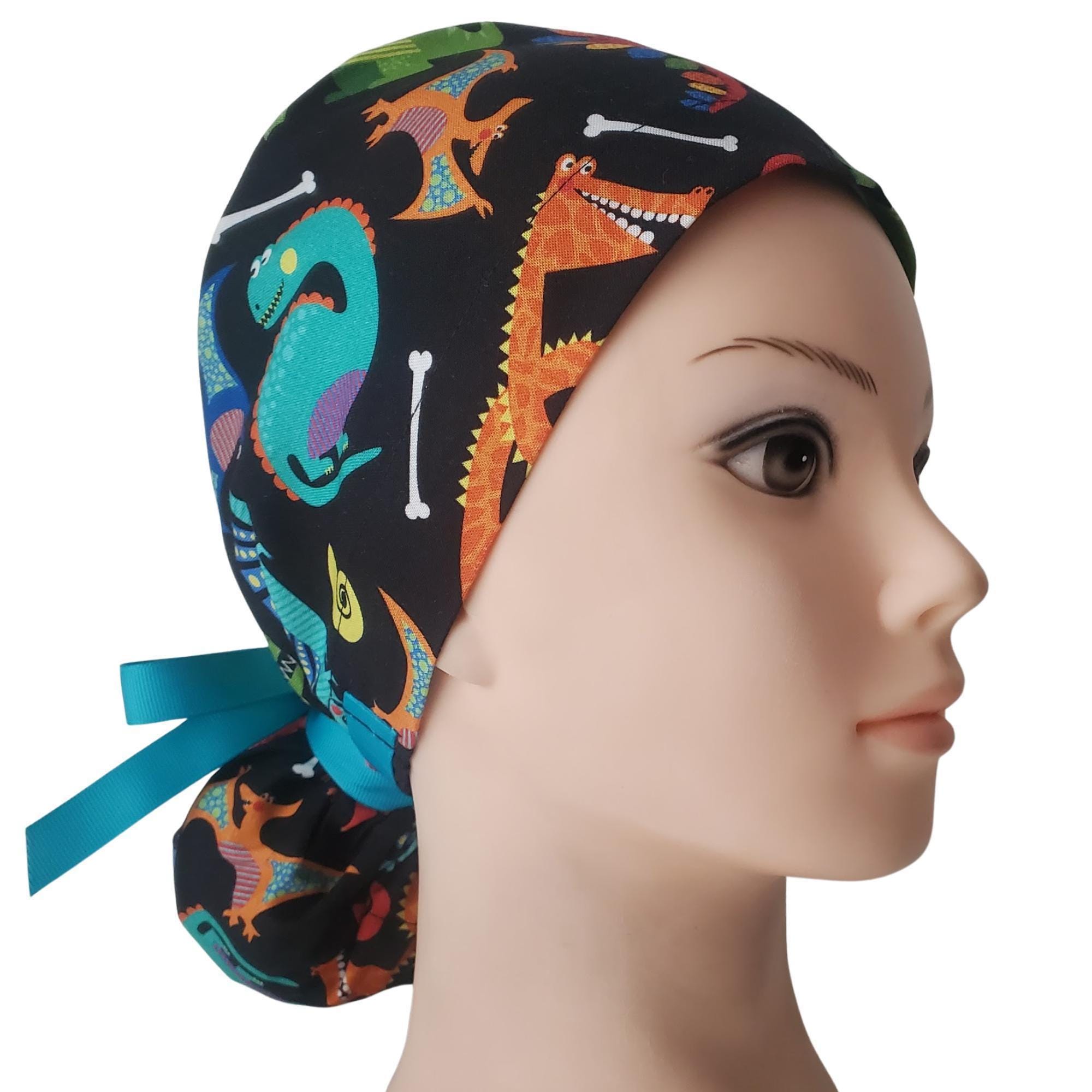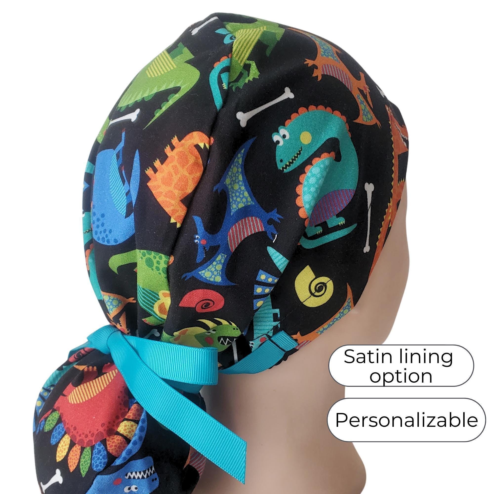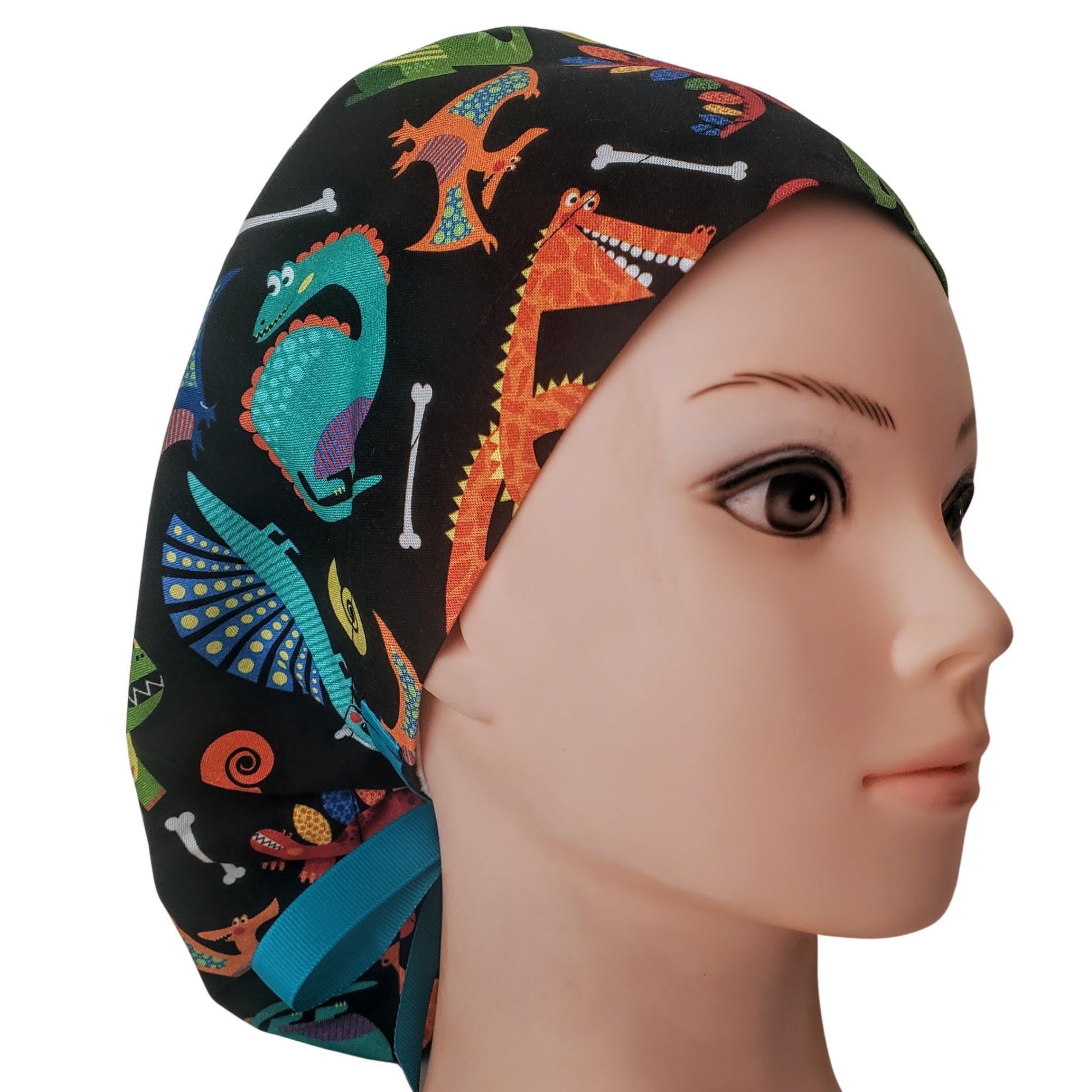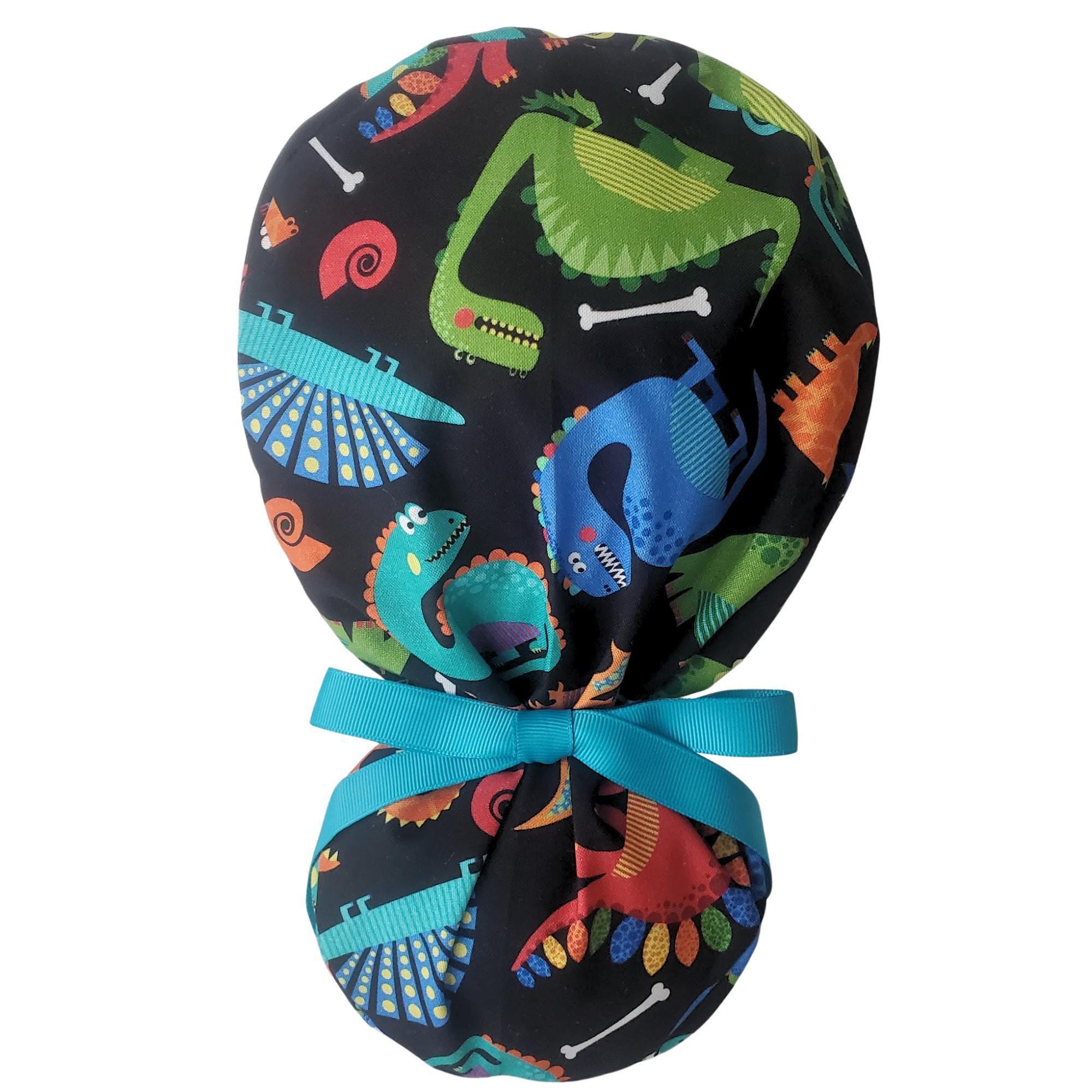 Add some prehistoric fun to your shift with this Dinosaur Ponytail Scrub Cap. Featuring colorful dinosaurs, bones, and vibrant patterns on a black background, this playful scrub hat is perfect for healthcare workers who want to show off their personality while staying comfortable. The ponytail pouch is roomy enough for long hair, and the optional satin lining keeps hair smooth and protected all day.