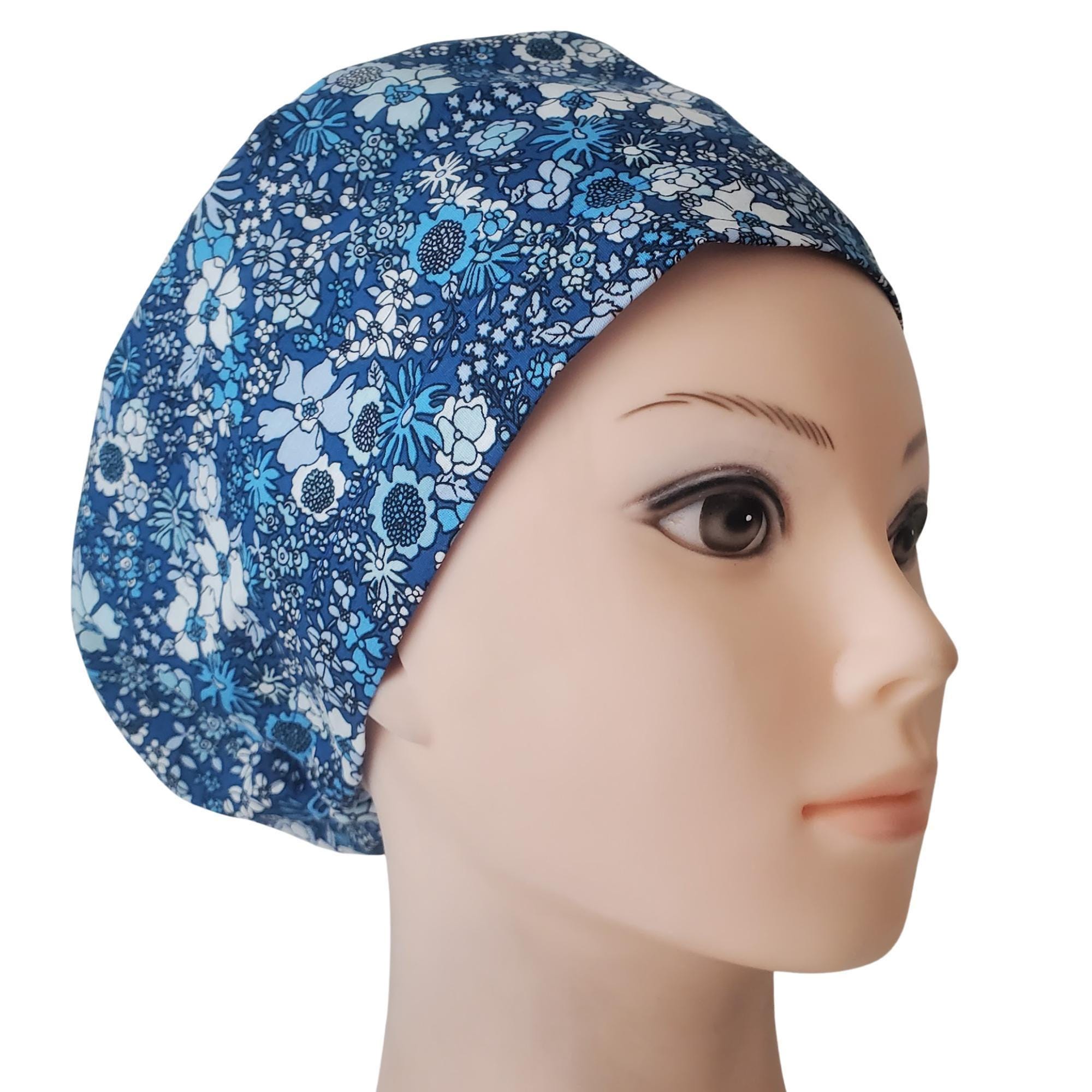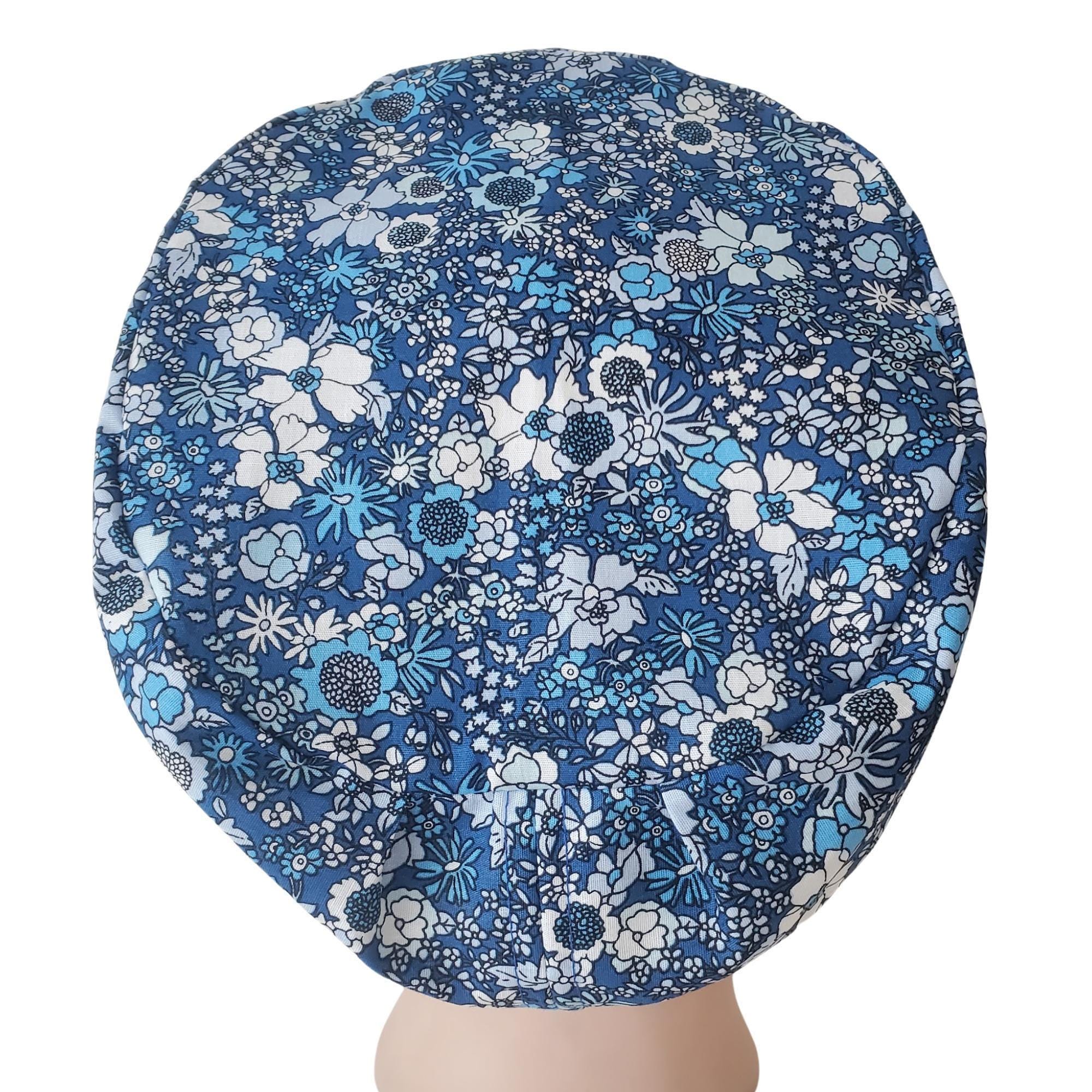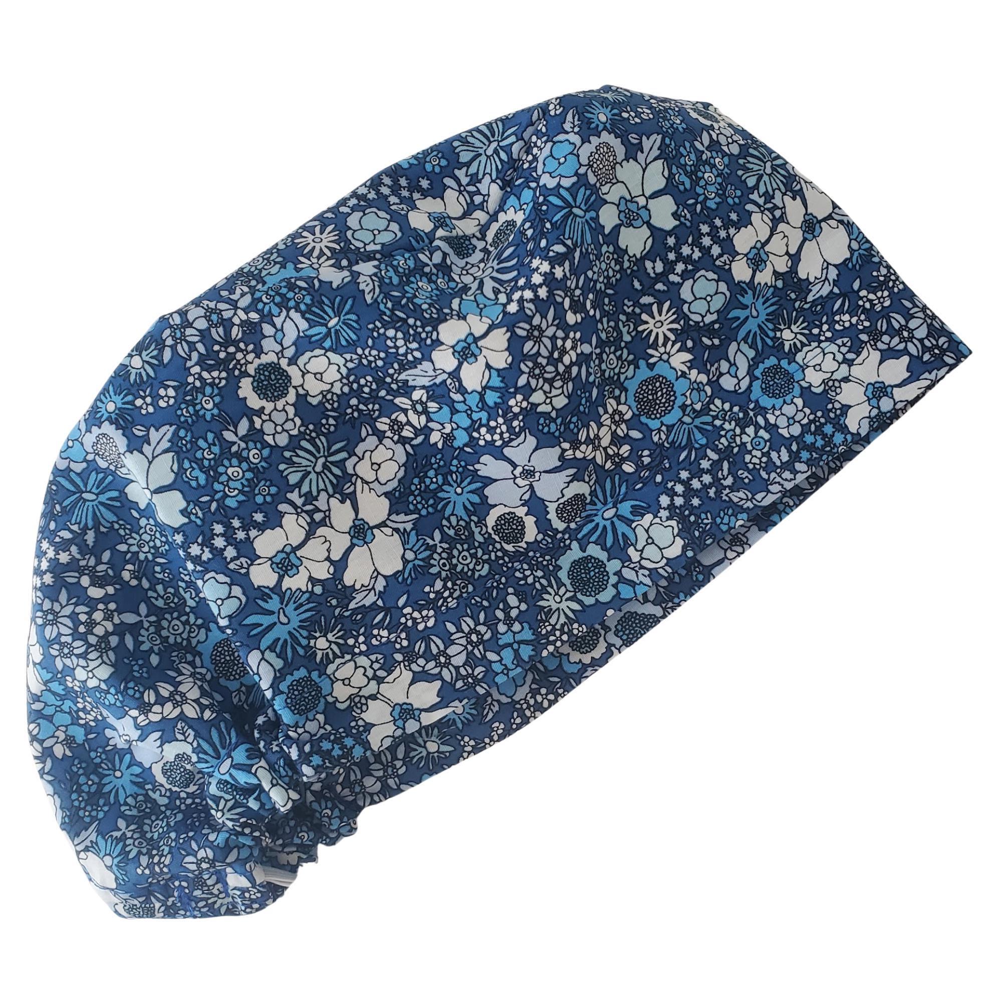 Bring classic charm to your workday with this Blue Floral Euro Scrub Cap. Designed with a timeless navy background and scattered white and blue blossoms, this cap offers both elegance and comfort. The Euro fit style sits neatly around the head β perfect for short hair, ponytails, or buns β while the optional satin lining helps prevent frizz and dryness during long shifts.