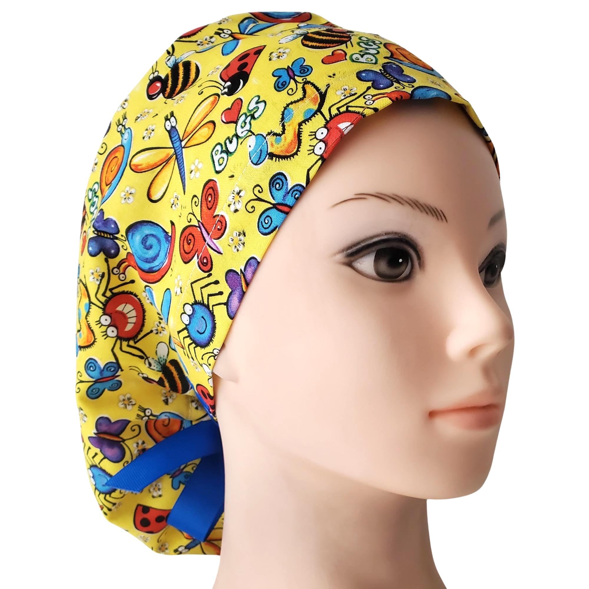 Bring a burst of joy to your shift with this Yellow Bug Print Ponytail Scrub Cap. Decorated with bright bees, butterflies, and ladybugs, this cheerful design instantly lifts your mood while keeping you comfortable. The pony pouch keeps long hair secure, and the optional satin lining helps prevent frizz, tangles, and dryness — perfect for long hours in the clinic or hospital.