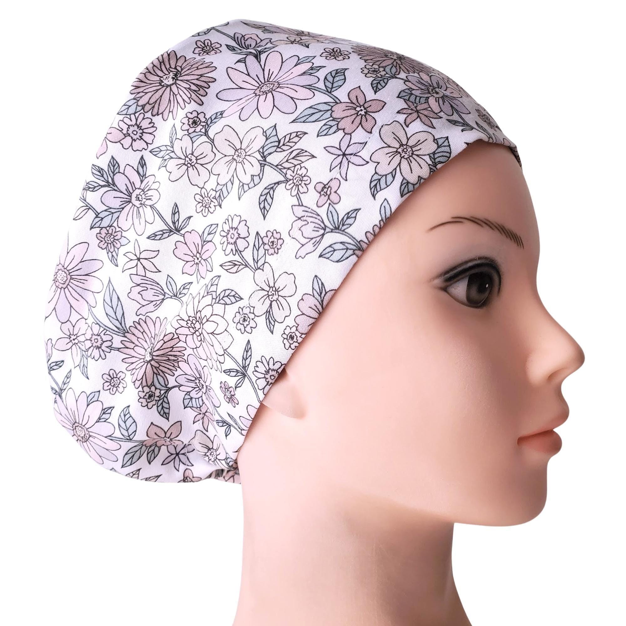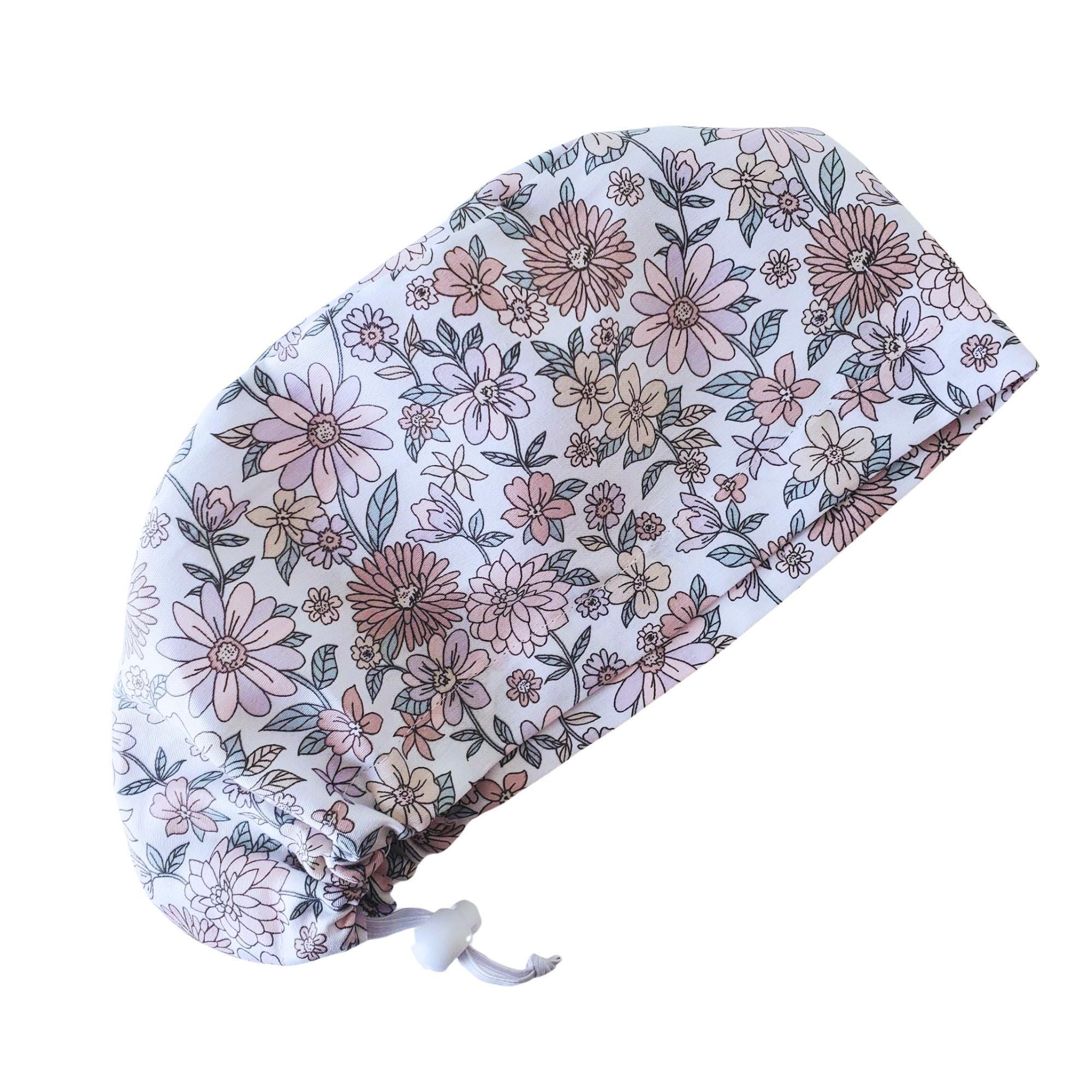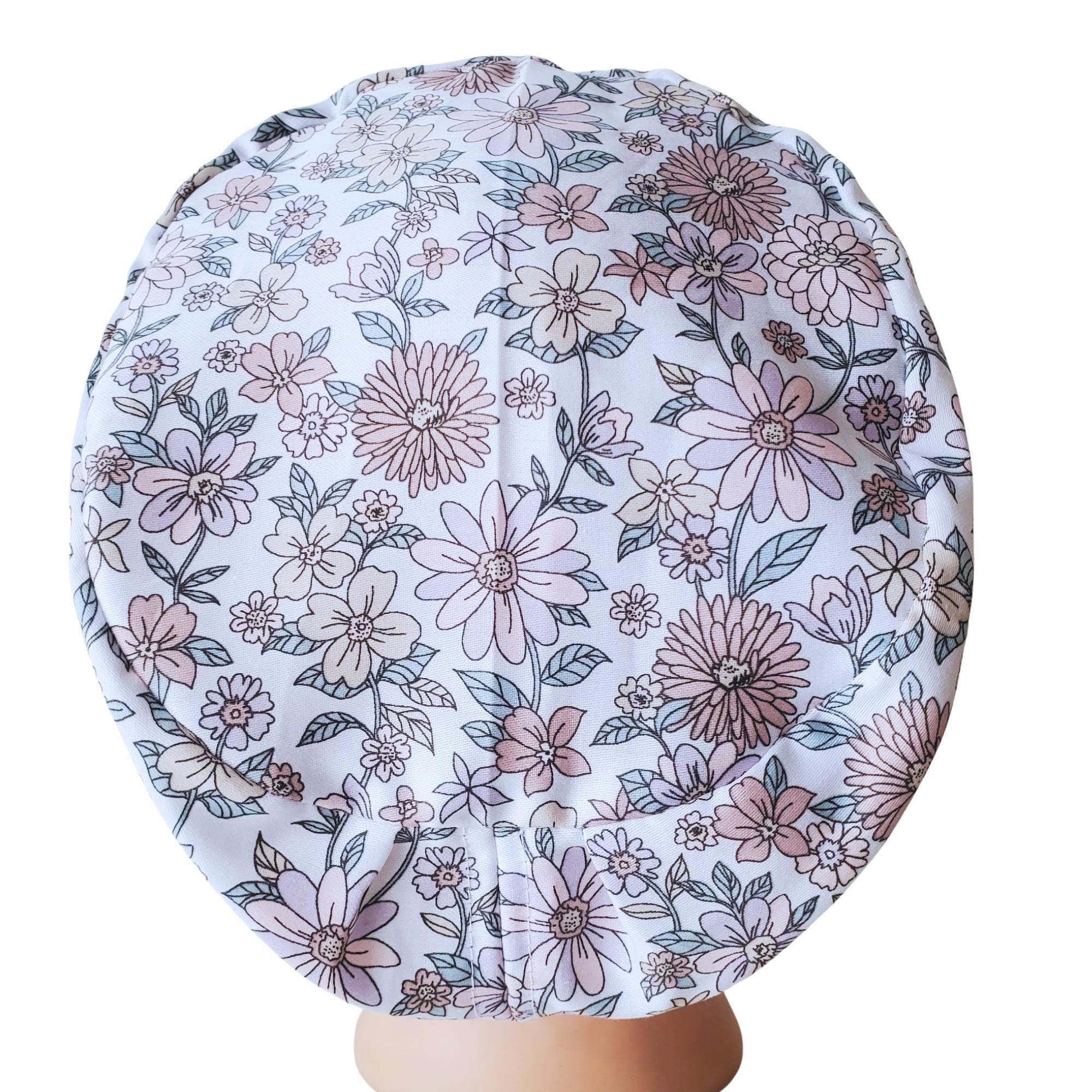 Add a soft, feminine touch to your uniform with this Light Pink Floral Euro Scrub Cap. Featuring a delicate pastel floral pattern on a white background, this cap brings both style and practicality to your workday. Designed for comfort, it fits short to medium-length hair securely while the optional satin lining protects hair from frizz and breakage during long shifts.
