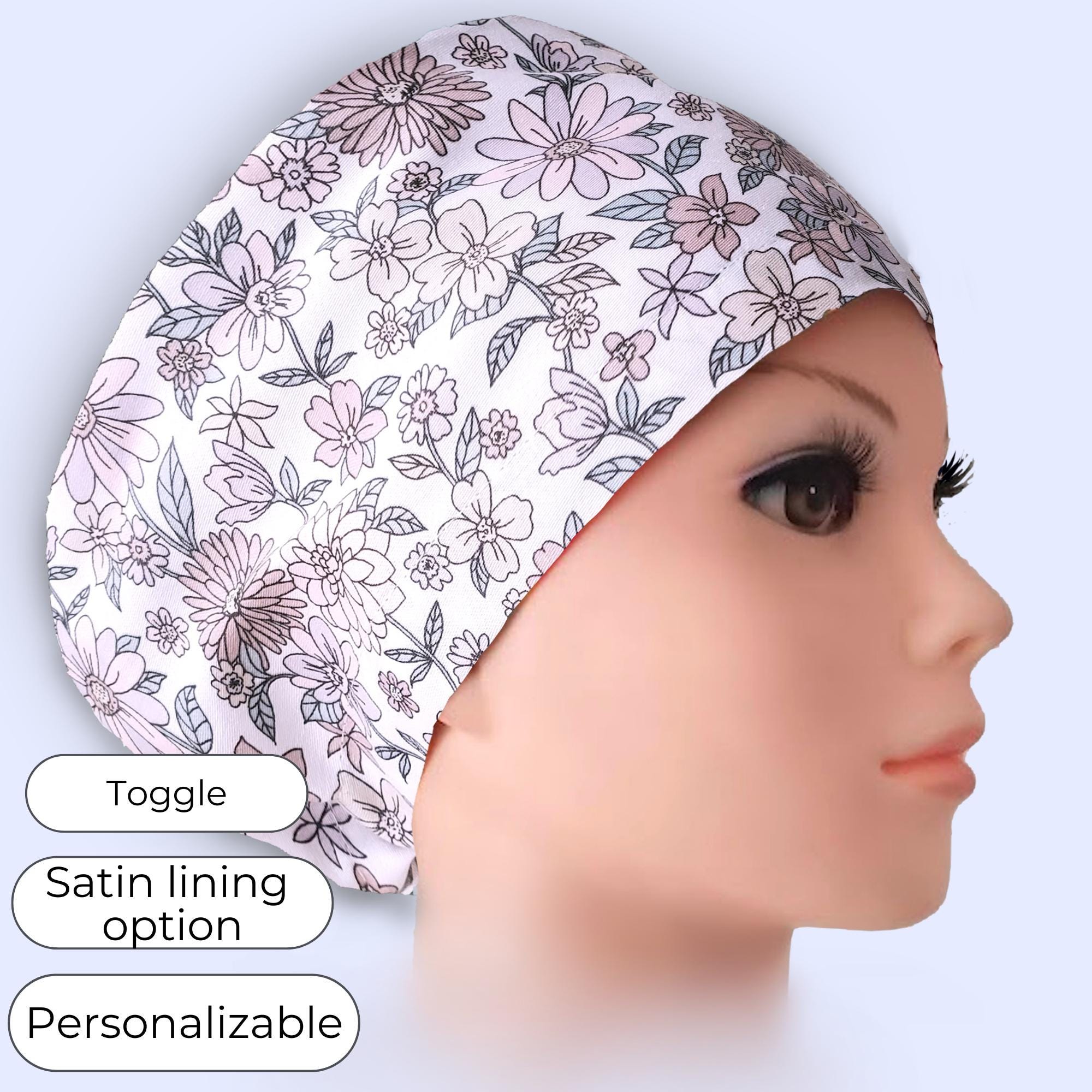 Add a soft, feminine touch to your uniform with this Light Pink Floral Euro Scrub Cap. Featuring a delicate pastel floral pattern on a white background, this cap brings both style and practicality to your workday. Designed for comfort, it fits short to medium-length hair securely while the optional satin lining protects hair from frizz and breakage during long shifts.