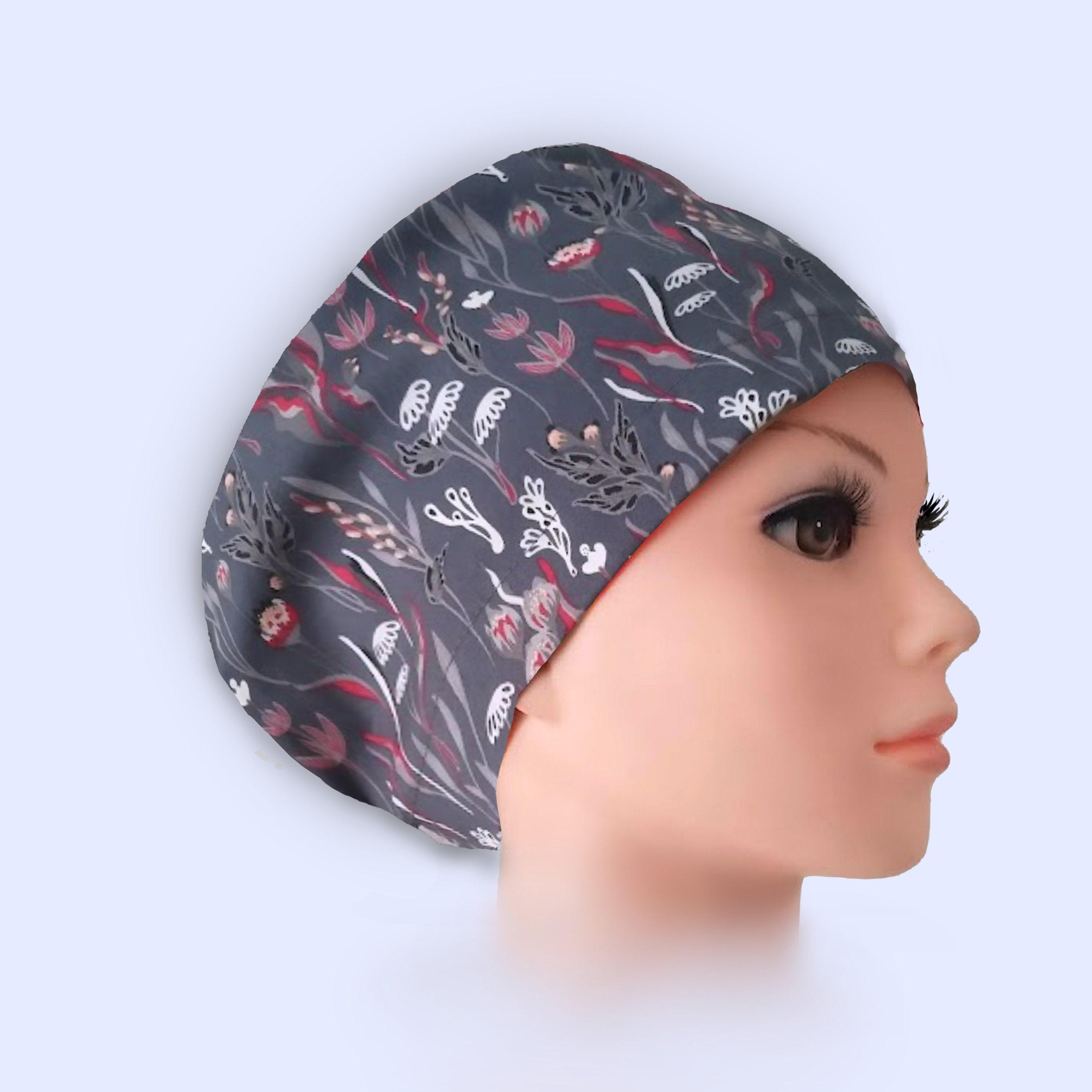 Euro Scrub Caps - Adjustable - Floral Grey - Satin Lined Option