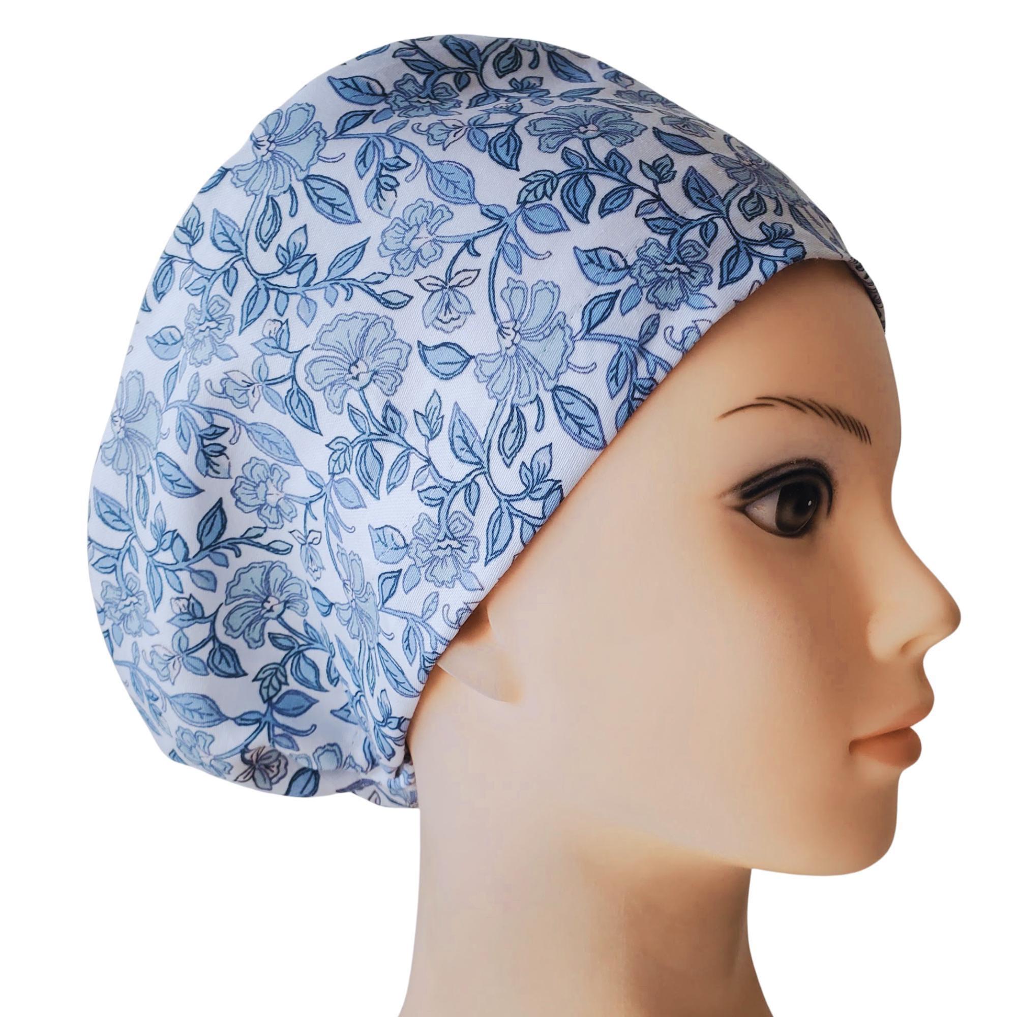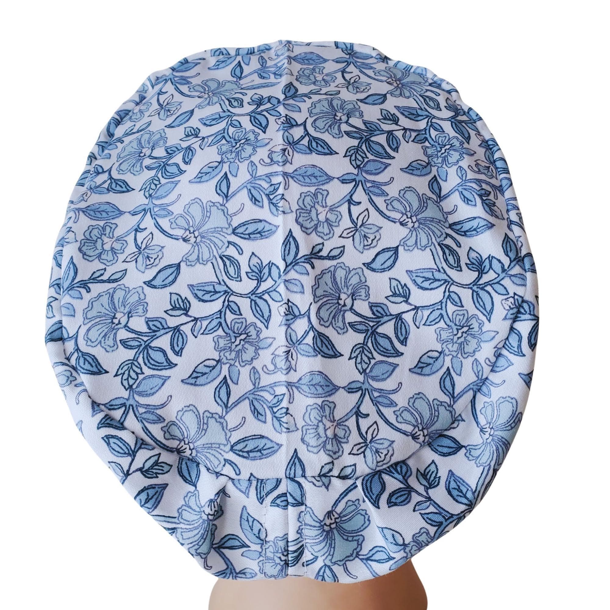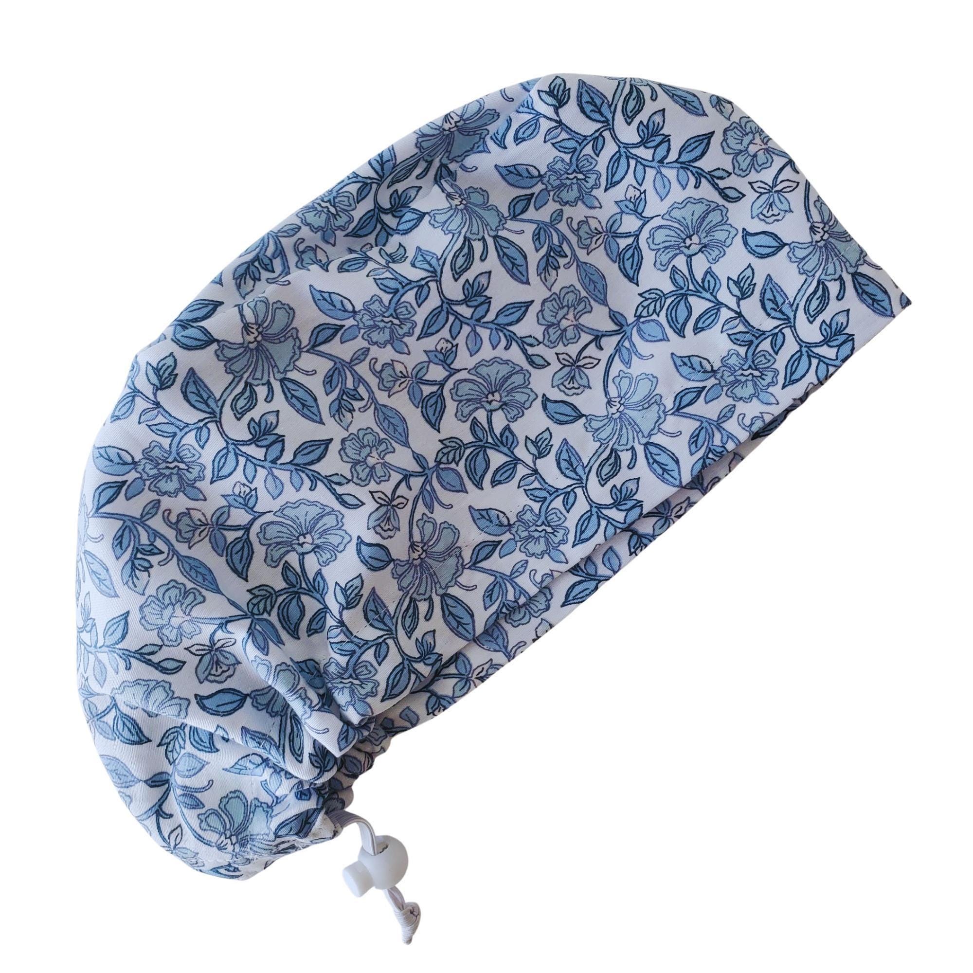 Stay stylish and comfortable through every shift with this Blue Vine Floral Euro Scrub Cap. Featuring an elegant vine and blossom pattern on a soft white background, this cap combines sophistication with function. The adjustable toggle ensures a snug fit for all head sizes, while the optional satin lining protects hair from frizz and breakage during long hours.