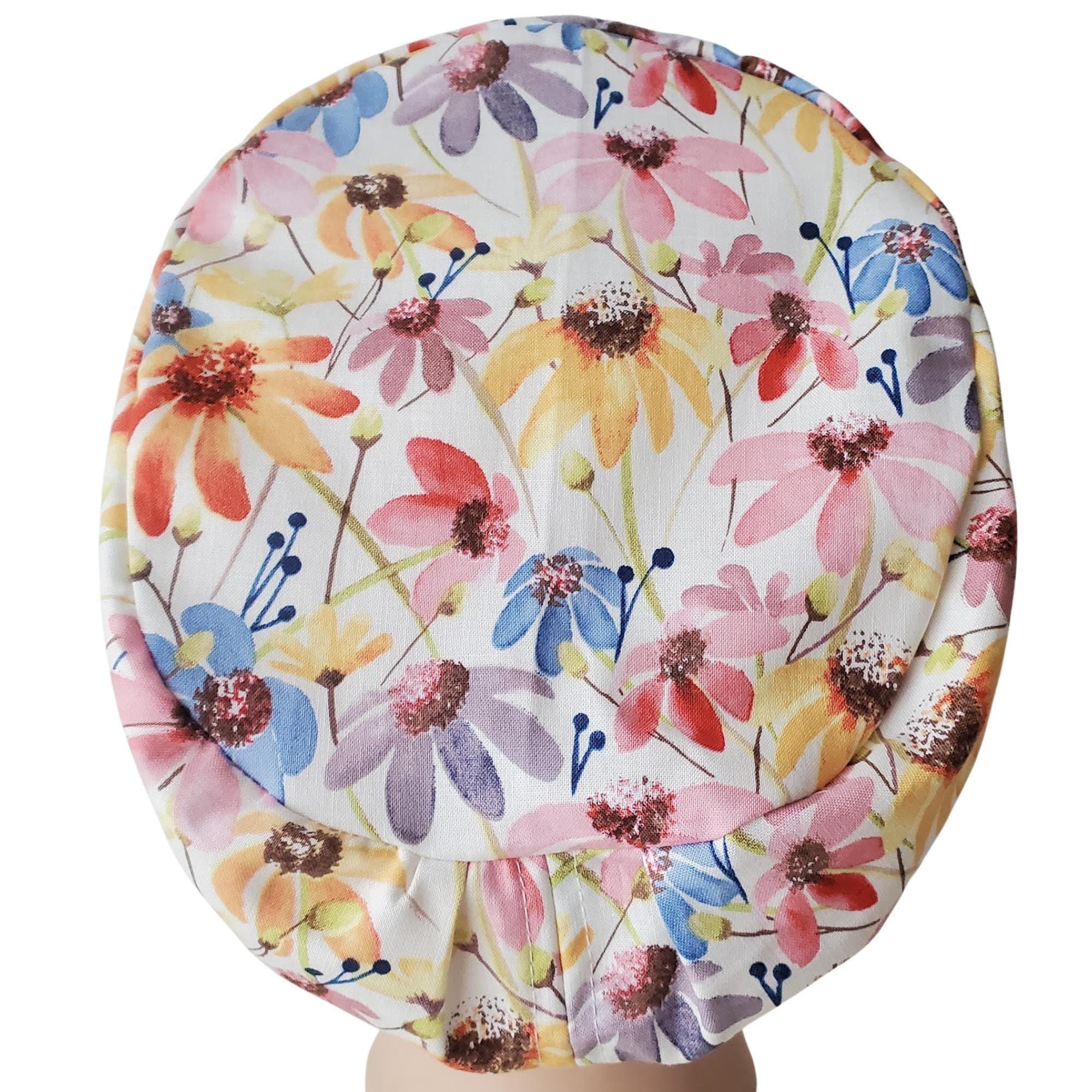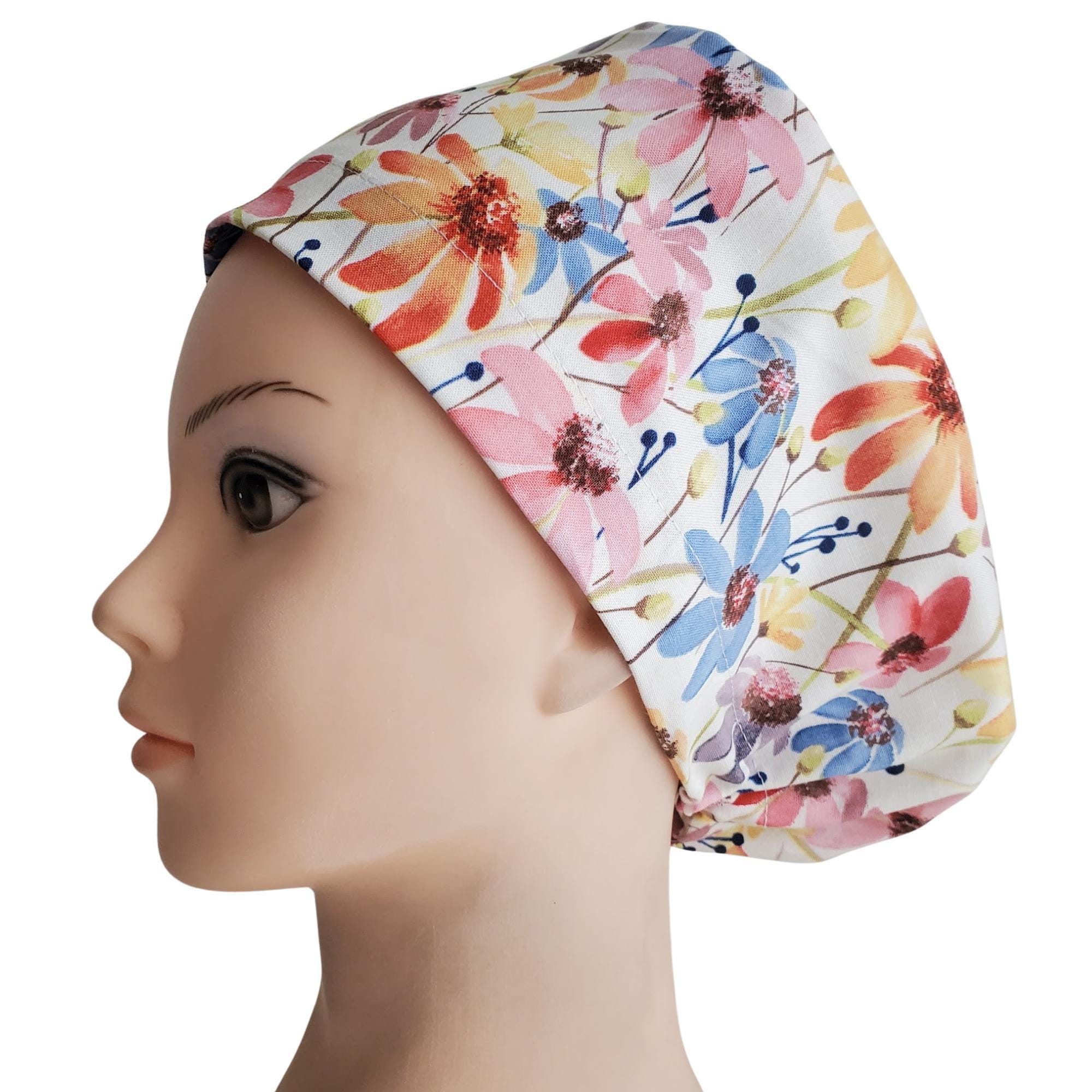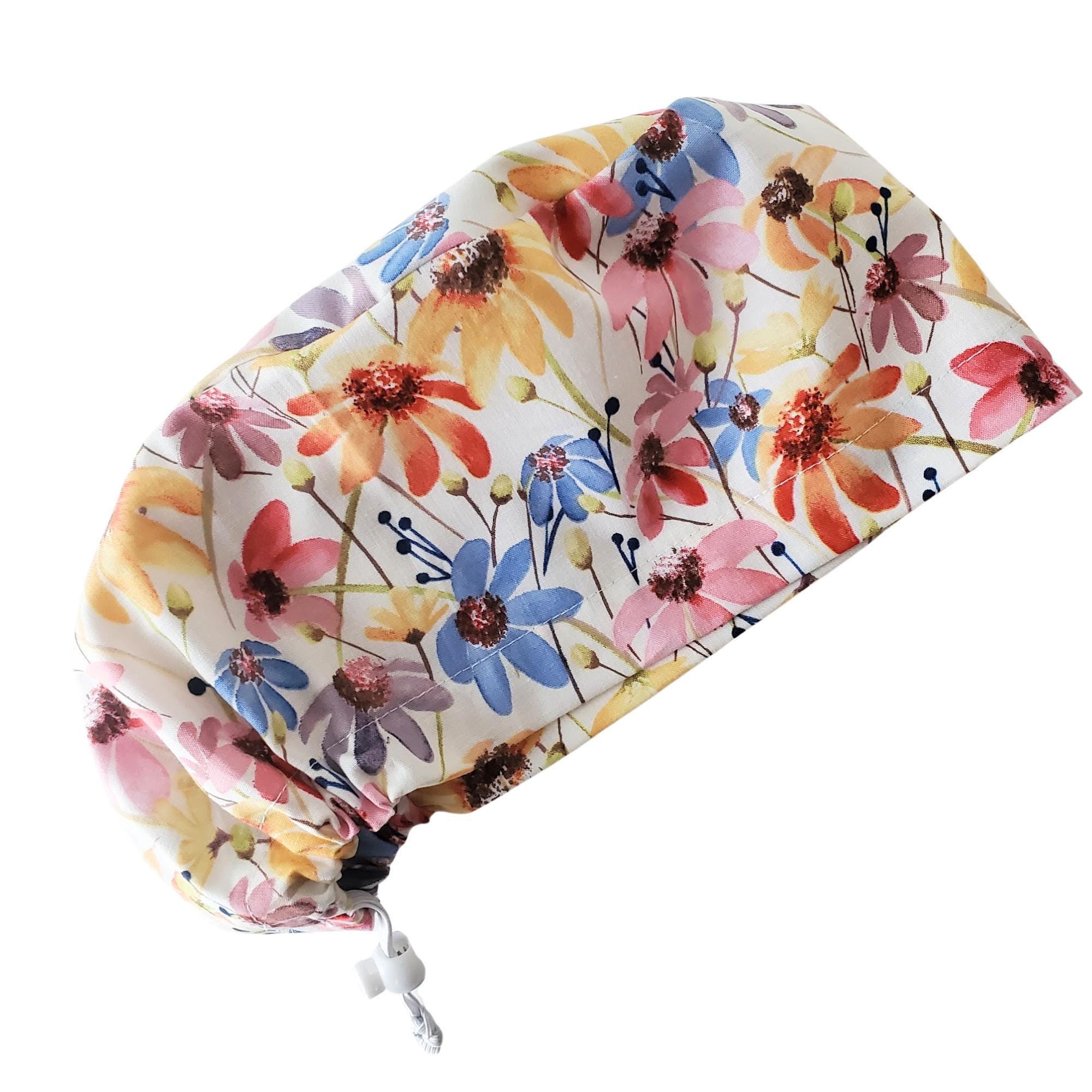 Bring vibrant energy to your shift with this Multicolor Floral Euro Scrub Cap. Featuring a lively mix of pink, orange, blue, and yellow flowers on a white background, this cap is both eye-catching and functional. Designed in the Euro style, it fits close to the head and includes an adjustable toggle for a secure, all-day fit. The optional satin lining helps protect hair from dryness, frizz, and breakage during long hours at work.