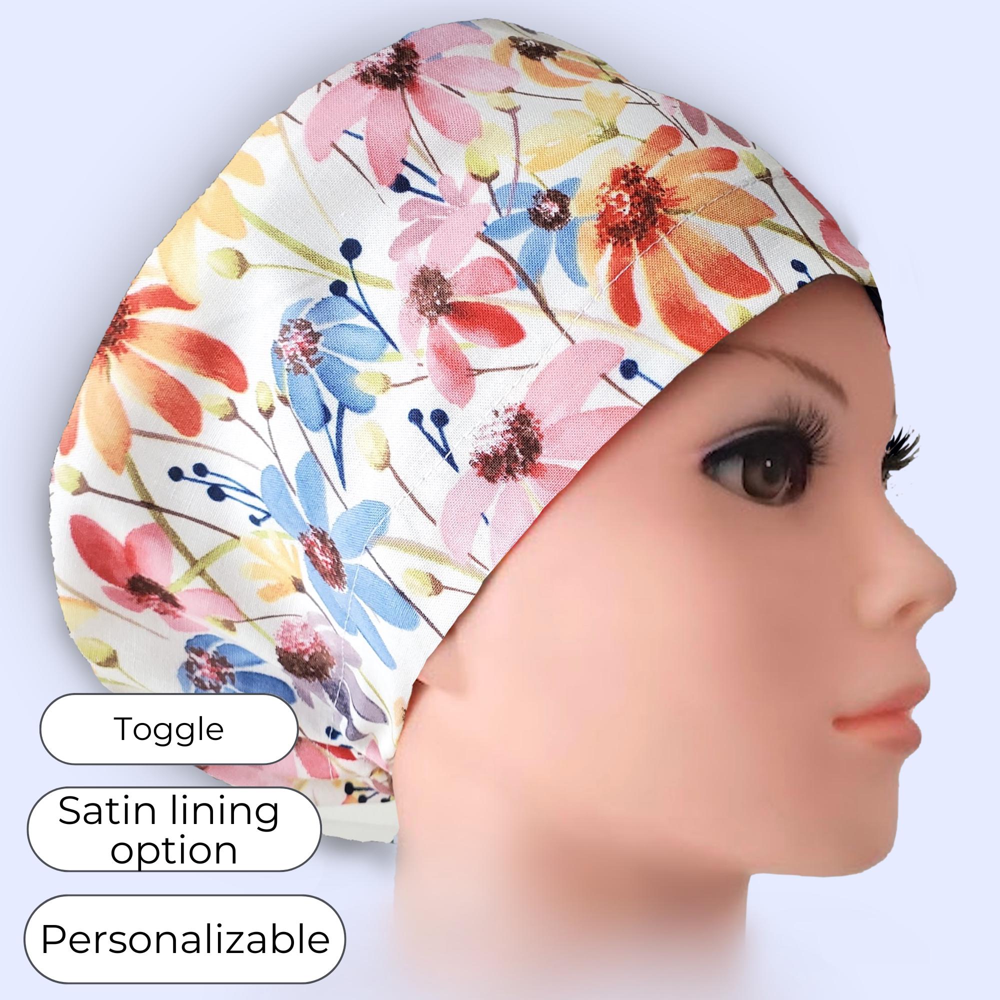 Bring vibrant energy to your shift with this Multicolor Floral Euro Scrub Cap. Featuring a lively mix of pink, orange, blue, and yellow flowers on a white background, this cap is both eye-catching and functional. Designed in the Euro style, it fits close to the head and includes an adjustable toggle for a secure, all-day fit. The optional satin lining helps protect hair from dryness, frizz, and breakage during long hours at work.