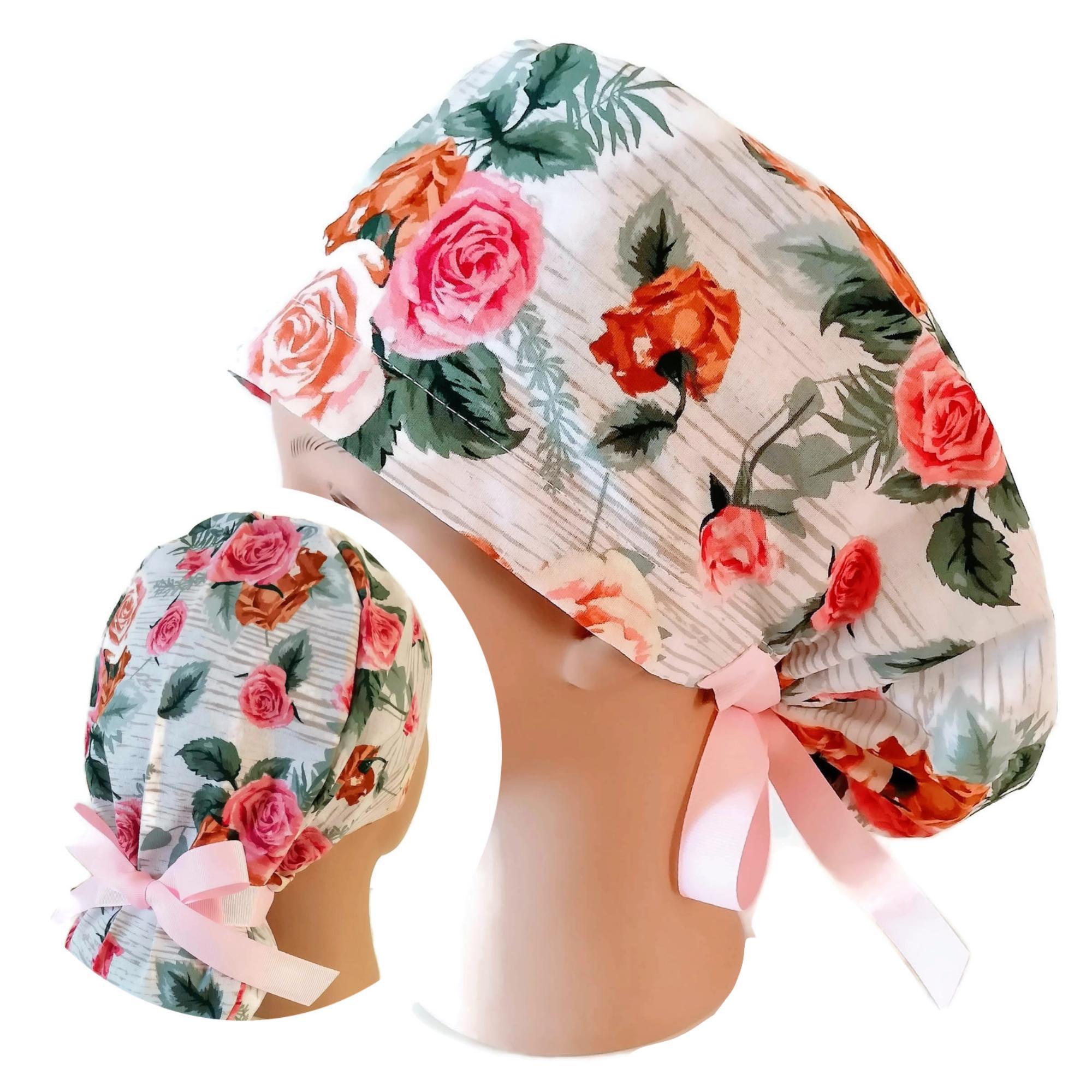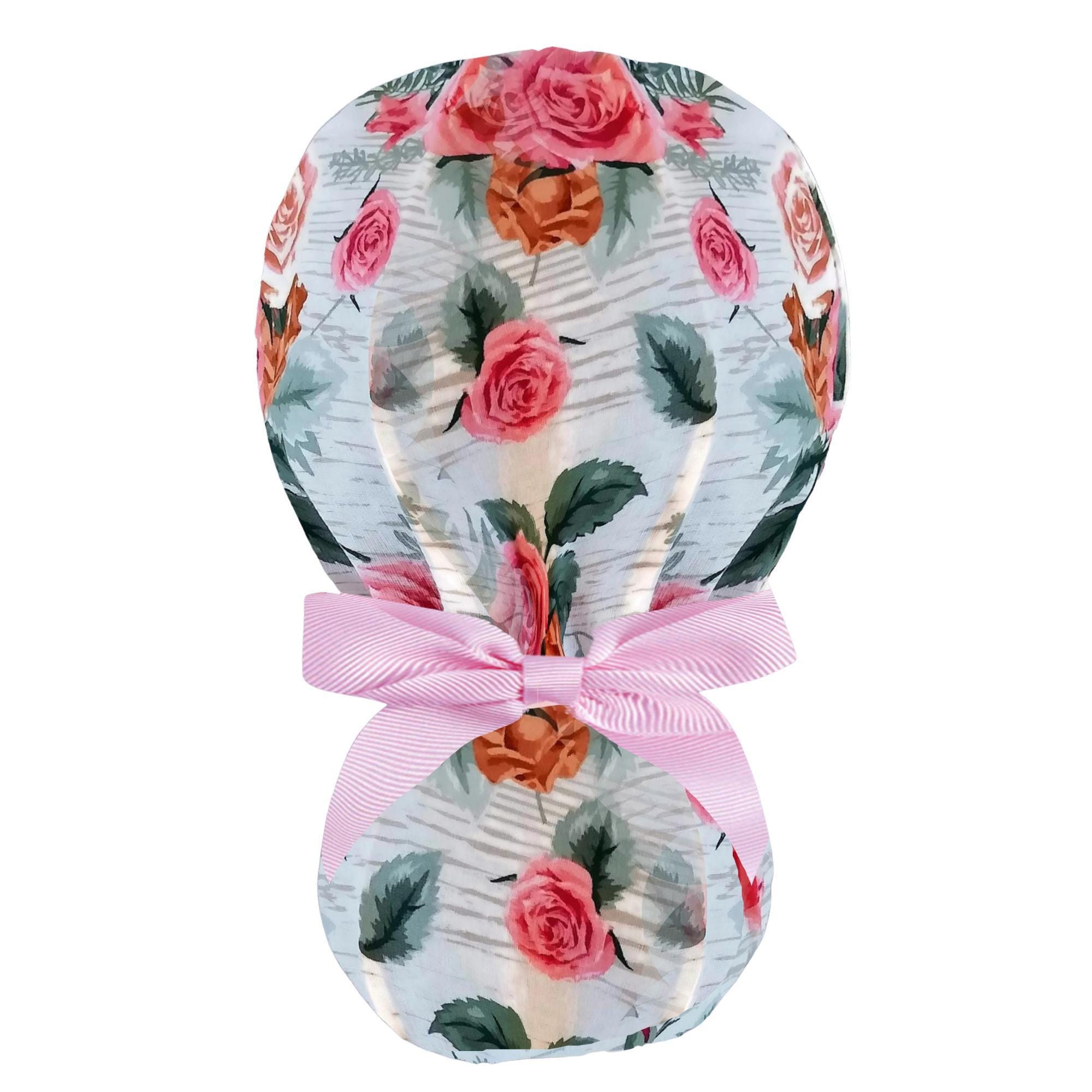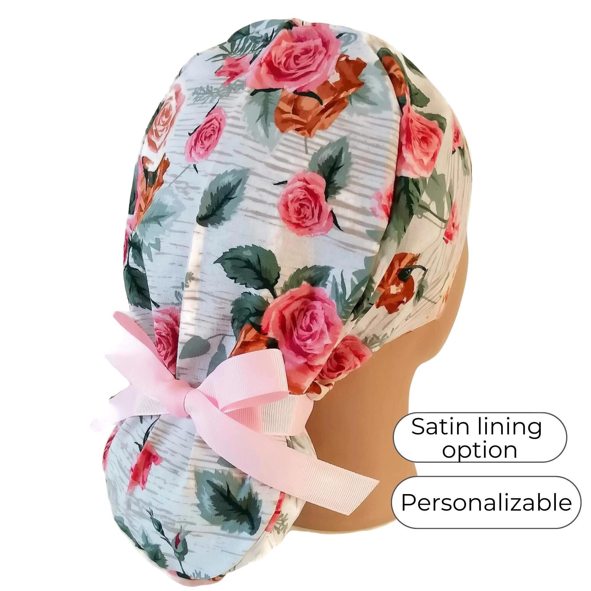 Scrub Cap: Satin Lined Ponytail Style Rose Floral, Adjustable