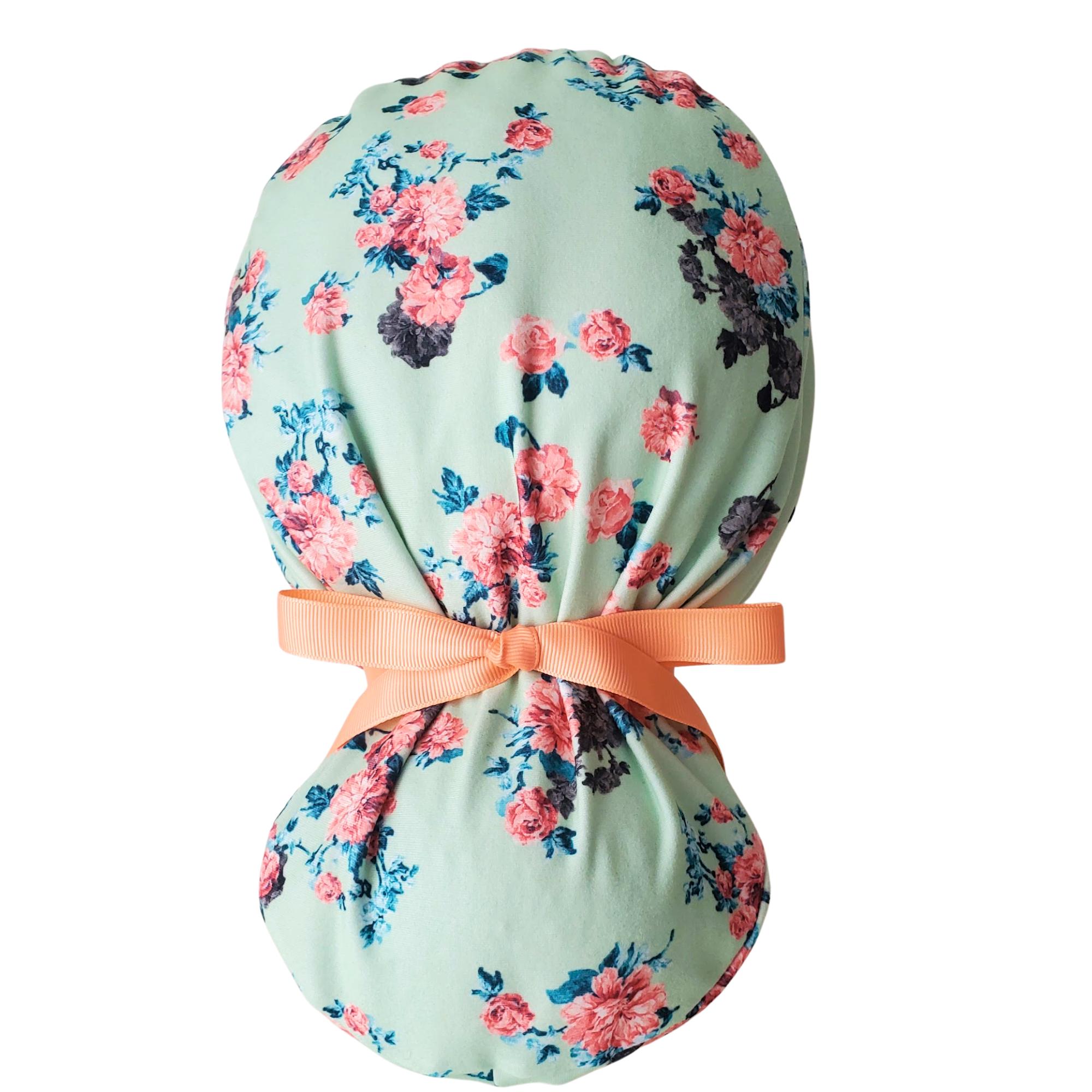 Bring a touch of elegance to your uniform with this stretch ponytail scrub cap in a soft mint floral print. The delicate rose and grey blossoms stand out beautifully on a pastel mint background, offering a fresh and feminine look. Made from breathable stretch fabric, this cap keeps you comfortable through long shifts while staying securely in place. The roomy ponytail pouch fits long or thick hair, and the adjustable toggle allows for a custom fit. A coordinating peach ribbon tie adds a polished finish. Wrinkle free, quick drying, and easy to care for, this cap is perfect for nurses, doctors, and healthcare professionals who appreciate comfort with a stylish twist.