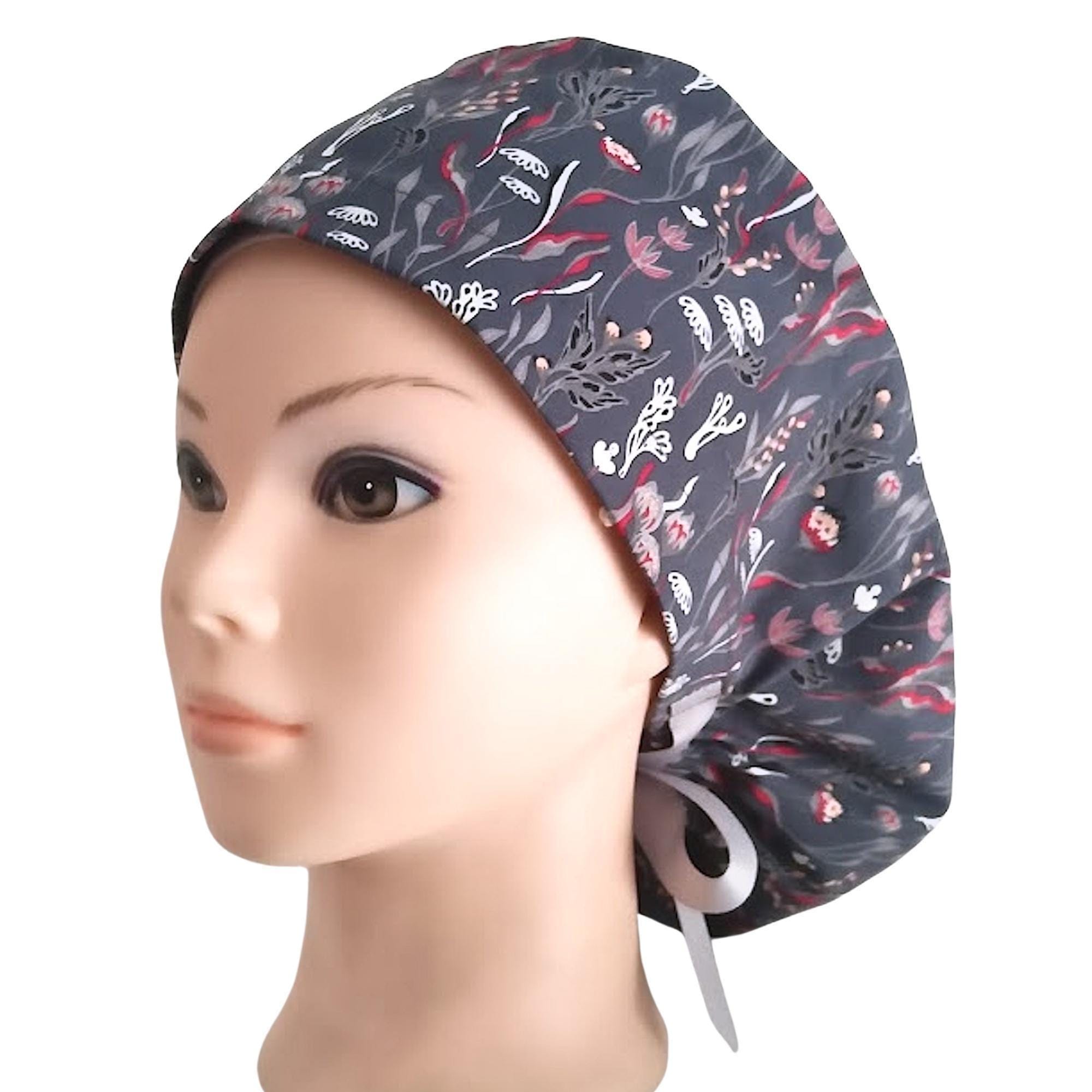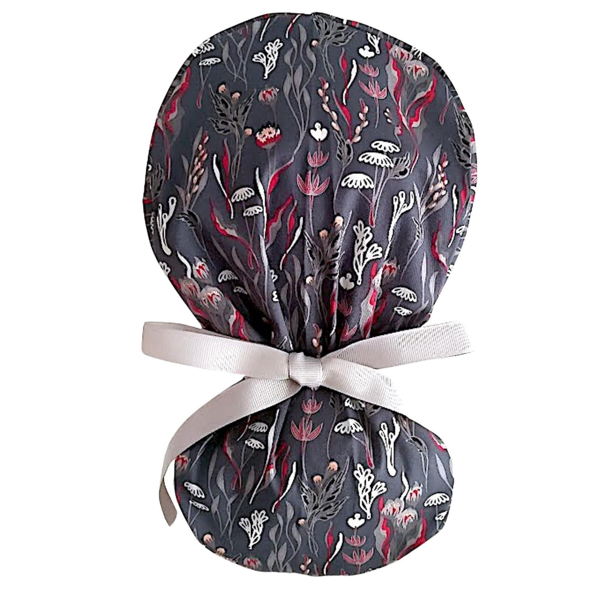 This ponytail scrub cap with satin lining option is handmade from soft, breathable cotton in a charcoal gray botanical print with red and white accents, finished with a classic white ribbon tie. Designed for comfort and style, this scrub cap for women has an elastic back that keeps long hair neatly in place while adding a touch of elegance.