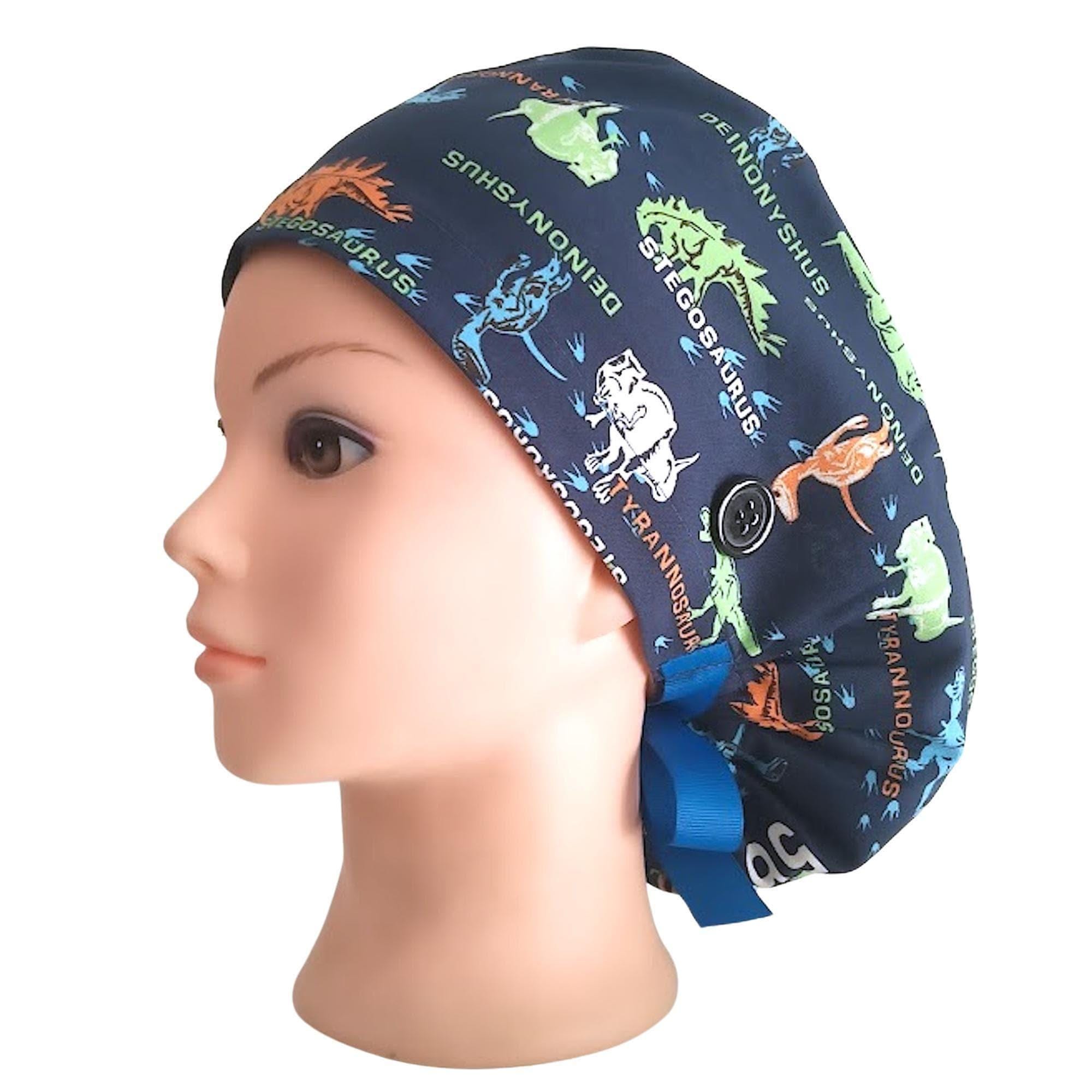 Dinosaur Scrub Cap for Long Hair - Surgical Cap with Silky Satin Lining Option -