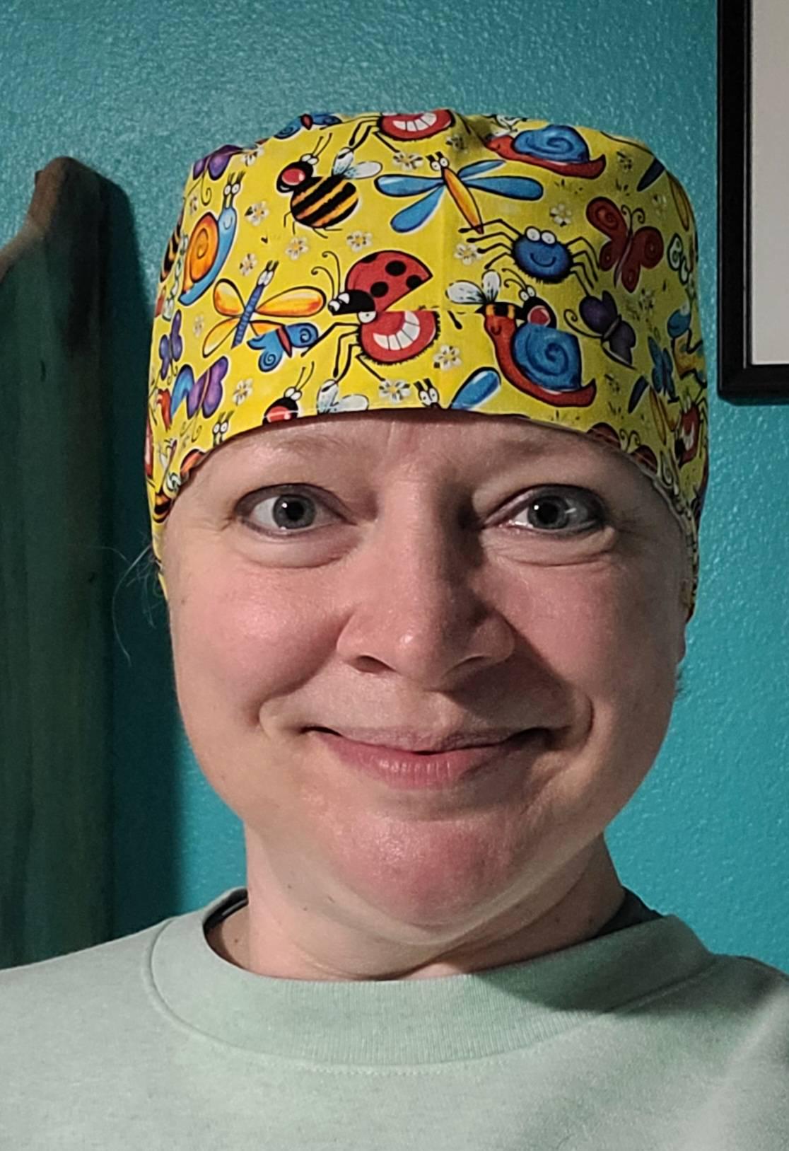 Add a playful pop of color to your uniform with this Yellow Bug Print Euro Scrub Cap. Featuring cheerful bees, butterflies, and ladybugs on a sunny yellow background, this cap brings fun and positivity to your workday. The Euro style design fits short or medium hair comfortably, while the optional satin lining protects your hair from breakage and frizz during long shifts. Perfect for healthcare professionals who love a vibrant, uplifting look.