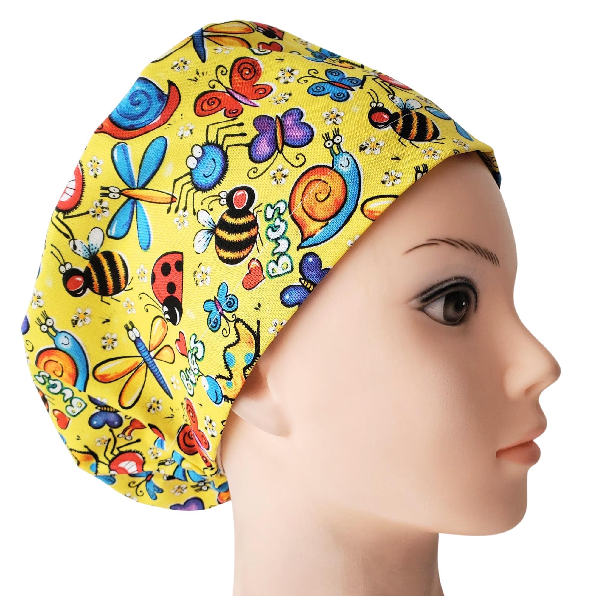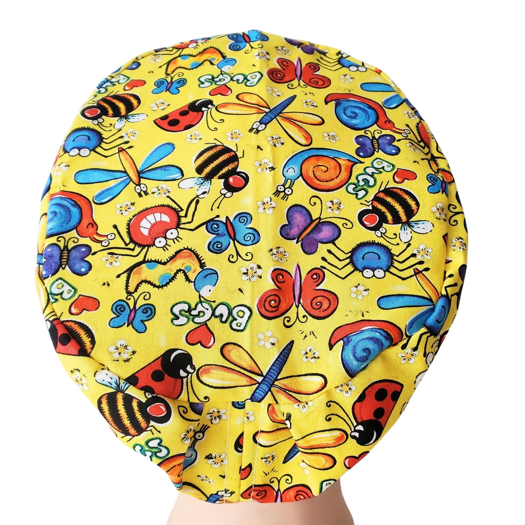 Add a playful pop of color to your uniform with this Yellow Bug Print Euro Scrub Cap. Featuring cheerful bees, butterflies, and ladybugs on a sunny yellow background, this cap brings fun and positivity to your workday. The Euro style design fits short or medium hair comfortably, while the optional satin lining protects your hair from breakage and frizz during long shifts. Perfect for healthcare professionals who love a vibrant, uplifting look.