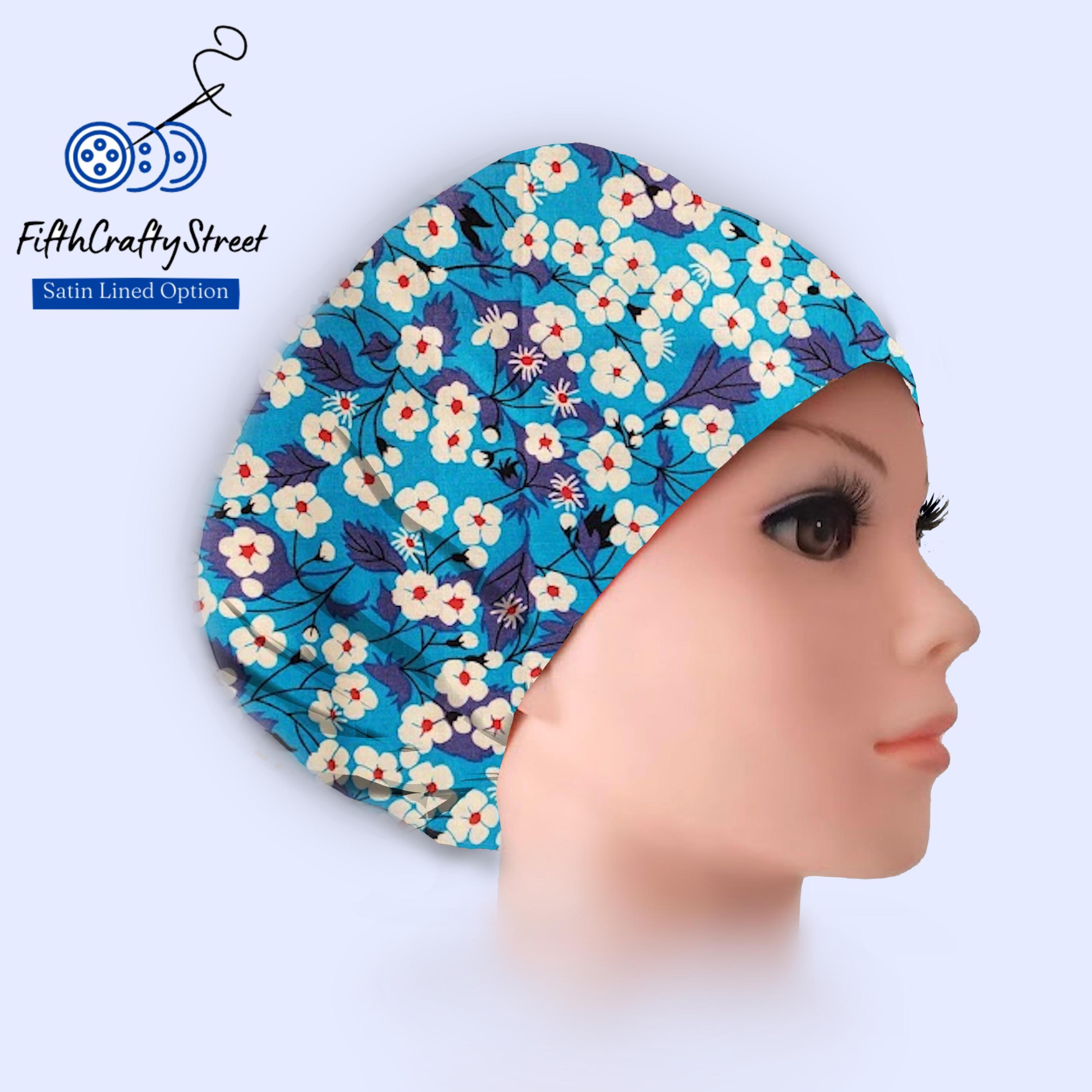Euro Scrub Caps - Adjustable - Satin Lining option - Floral Blue
