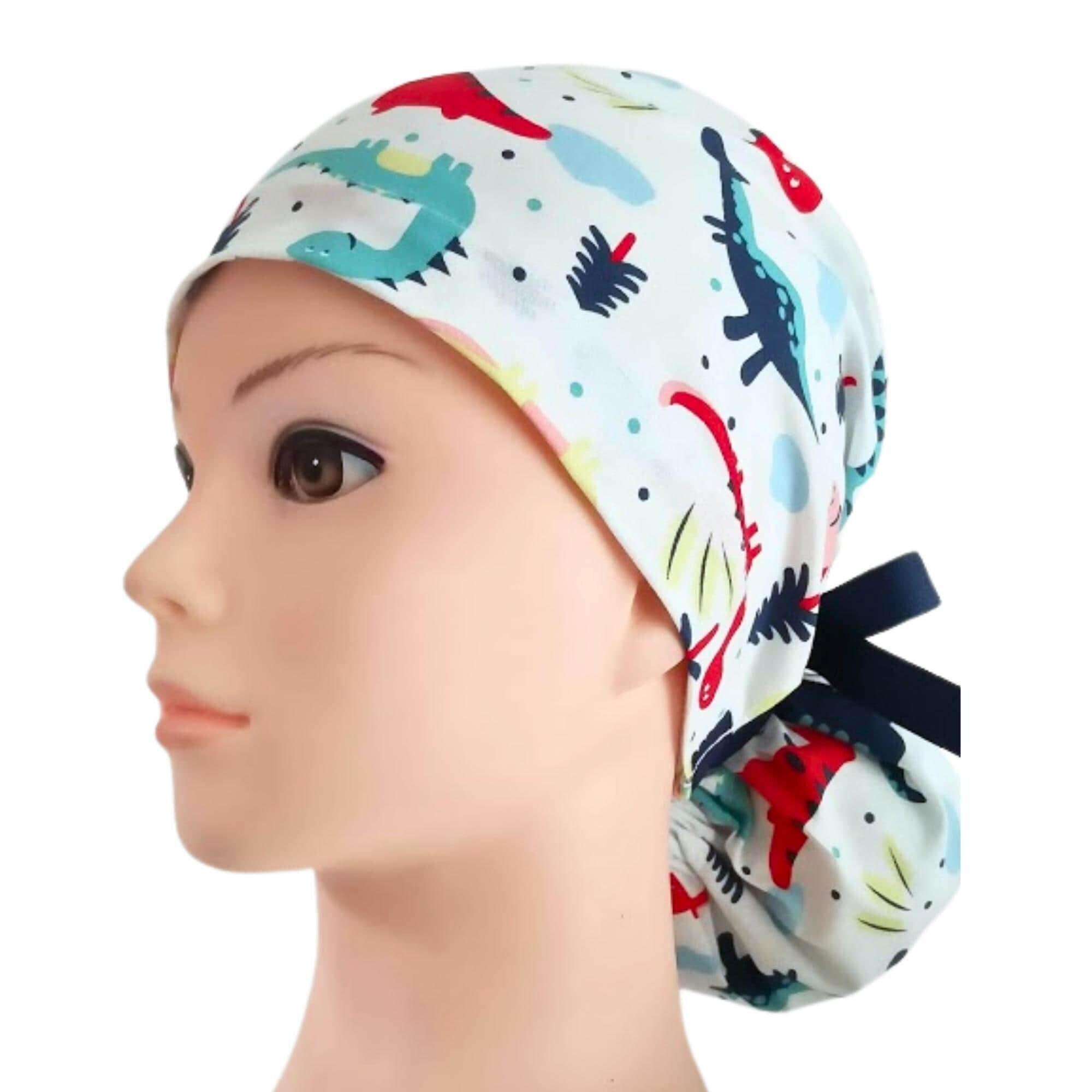 This ponytail scrub cap with satin lining option is handmade from breathable cotton and designed for comfort during long shifts. Featuring a white background with colorful dinosaur print and secure elastic at the back, it keeps long hair neatly in place with bold red ribbon ties. Perfect for adding fun style to your workday while staying practical.