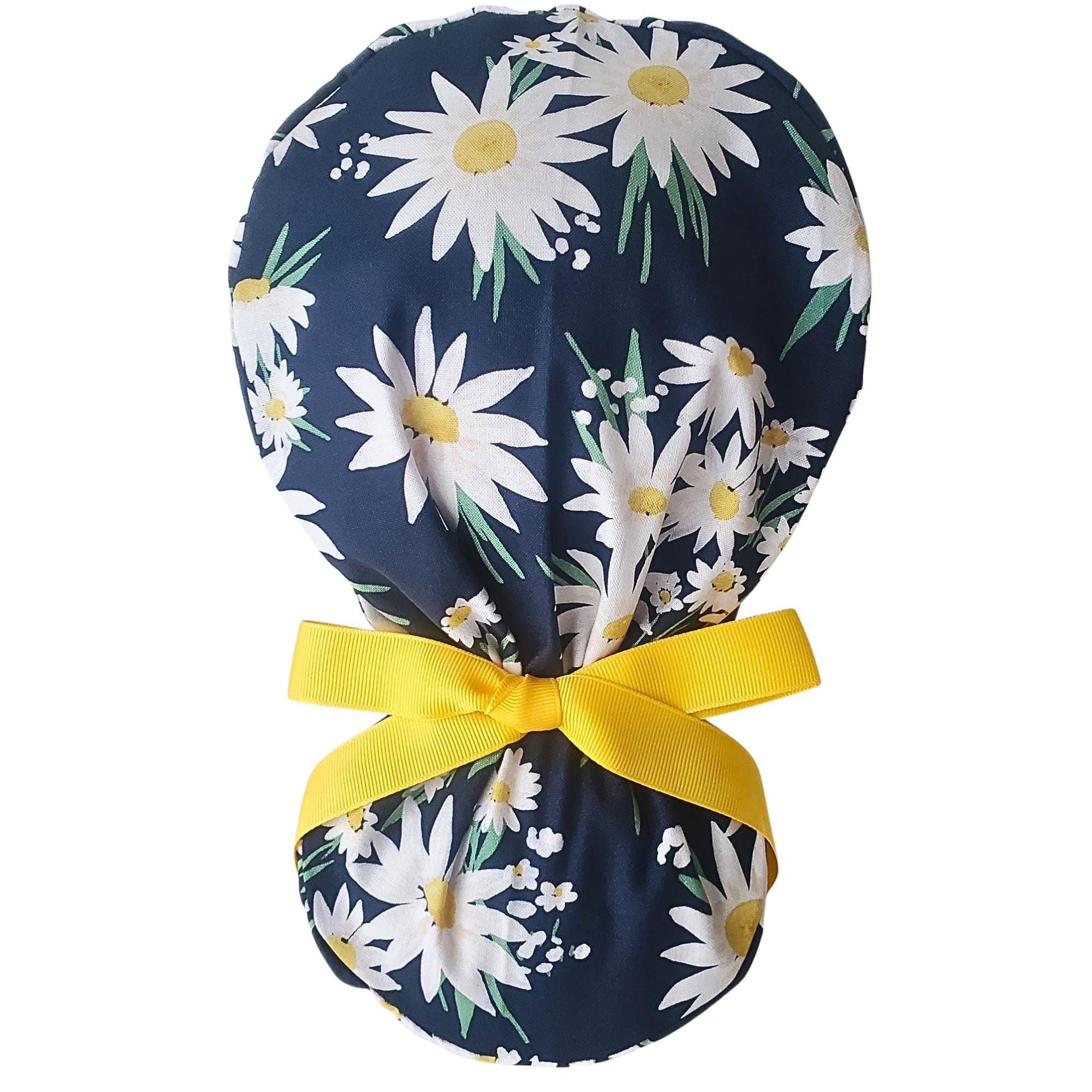 Ponytail Scrub Cap in Navy Daisy Print – handmade surgical scrub hat designed for women with long hair. This cap features bright white daisies with golden centers on a navy blue background, finished with a cheerful yellow ribbon tie. The ponytail style keeps your hair secure and stylish throughout long shifts.