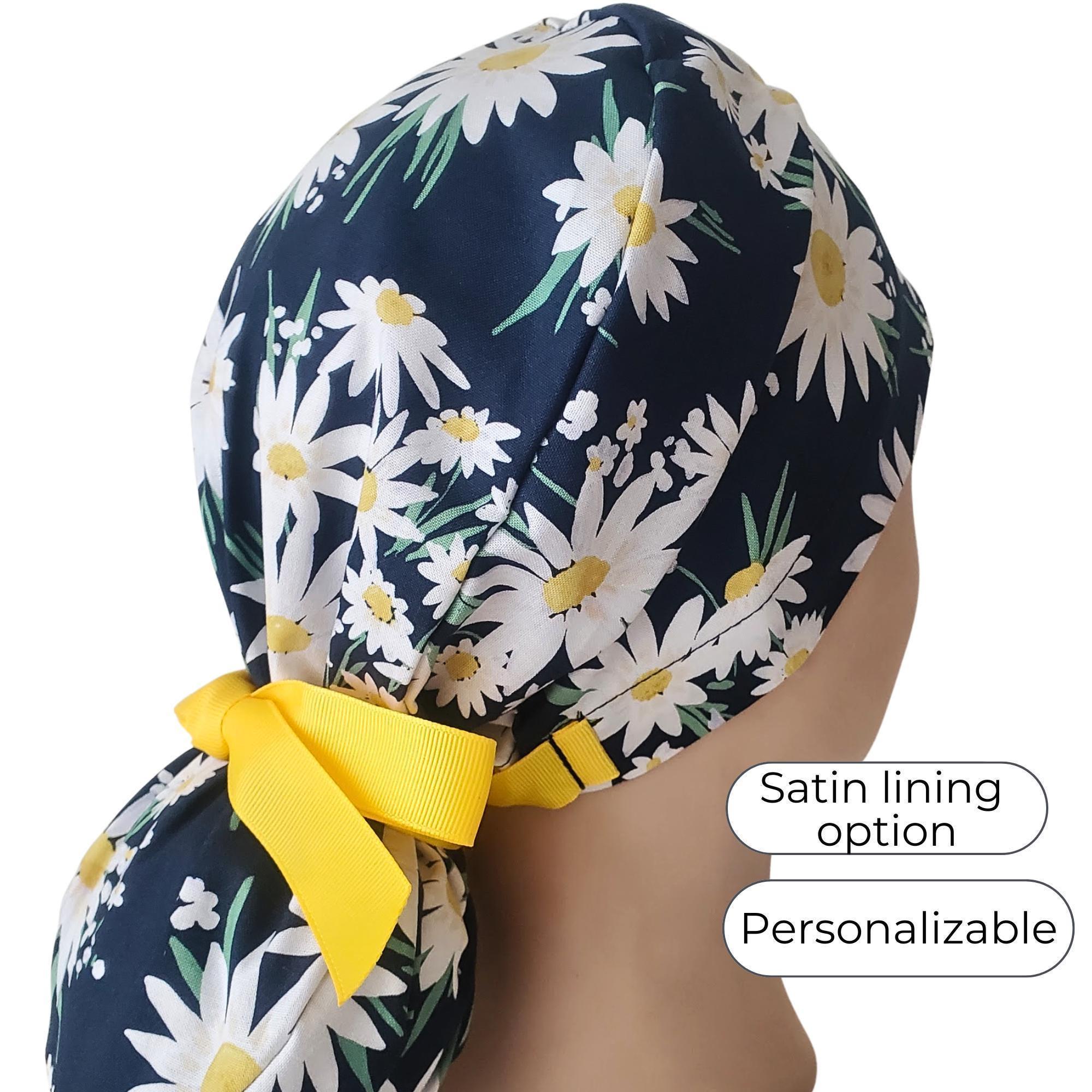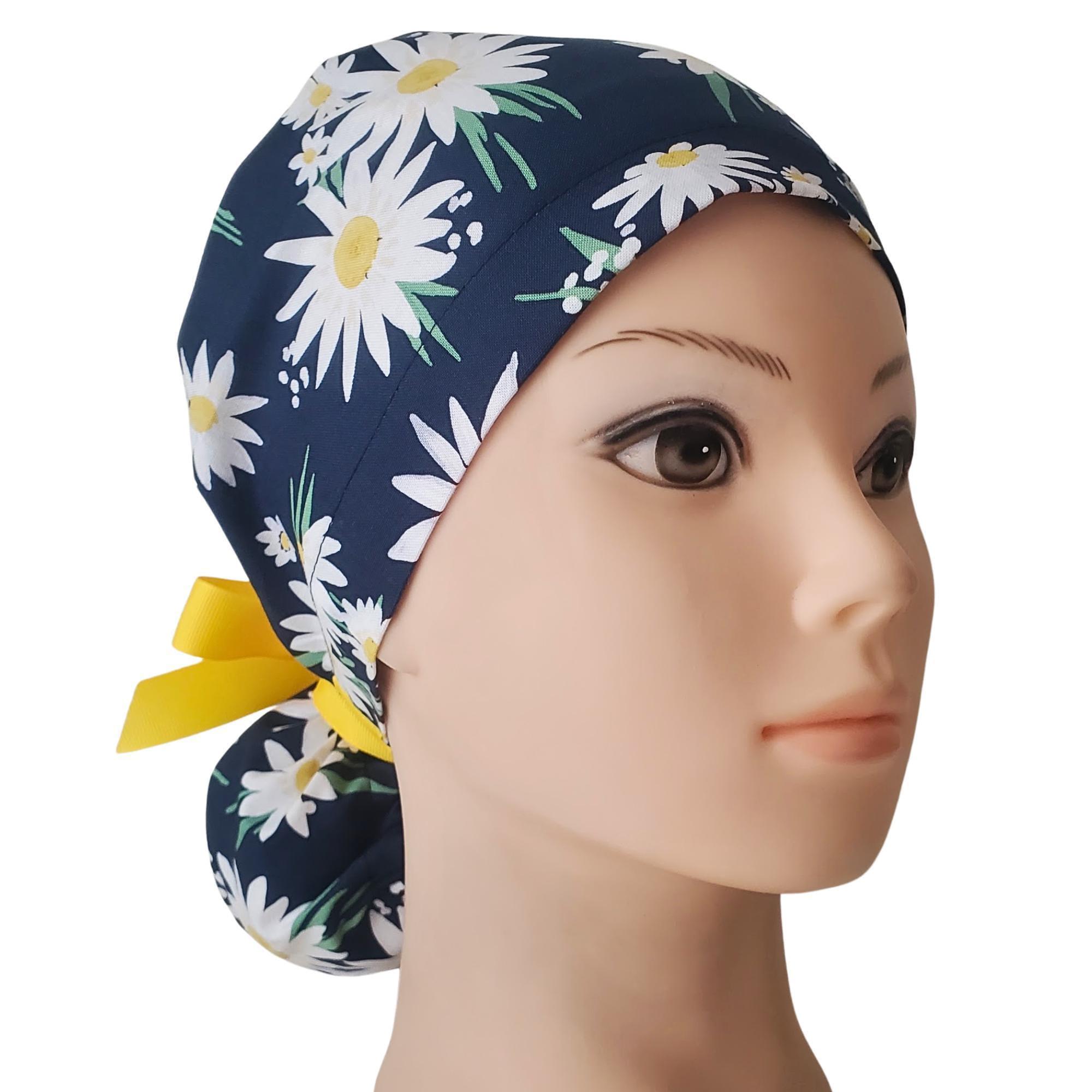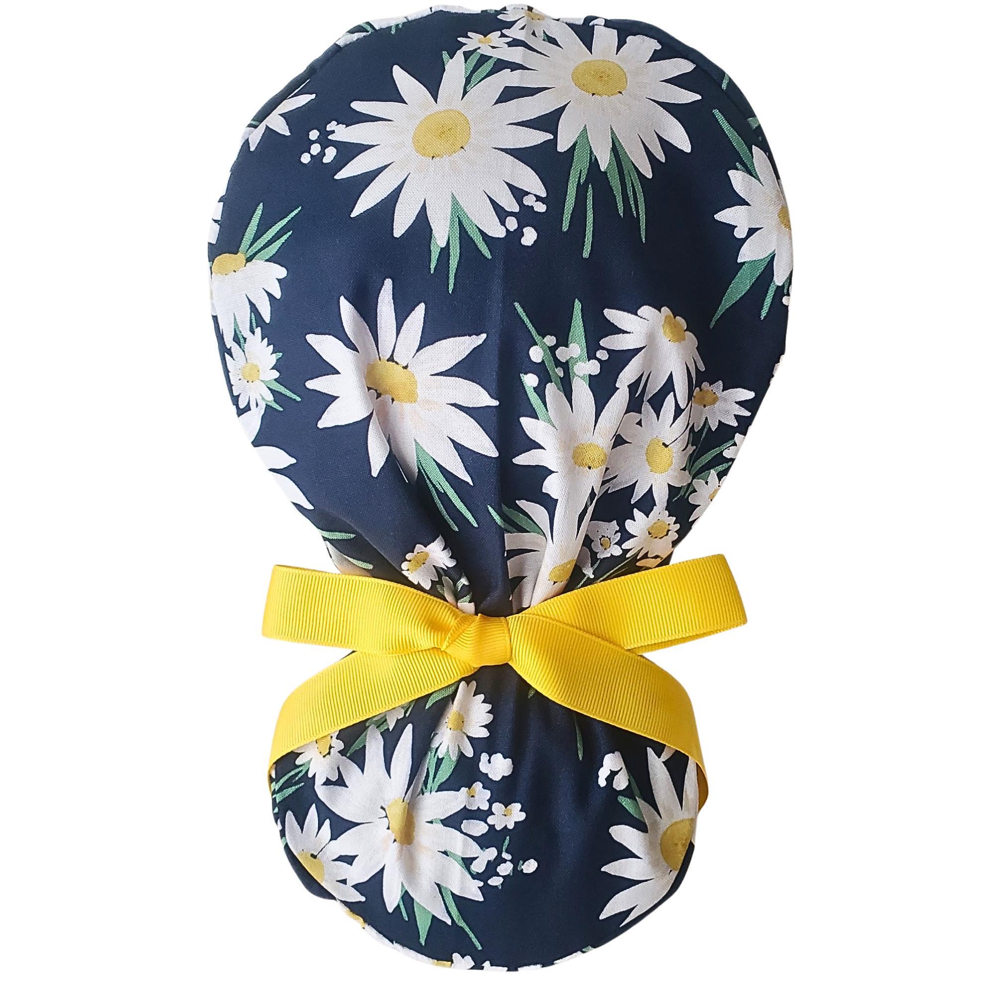 Ponytail Scrub Cap in Navy Daisy Print β handmade surgical scrub hat designed for women with long hair. This cap features bright white daisies with golden centers on a navy blue background, finished with a cheerful yellow ribbon tie. The ponytail style keeps your hair secure and stylish throughout long shifts.
