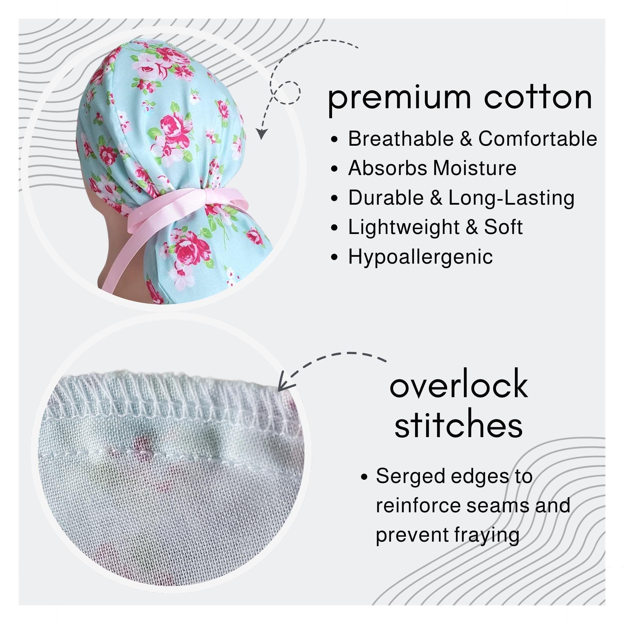 Our ponytail scrub cap is designed with both comfort and style in mind, perfect for long hair and long shifts. Each cap is handmade from high-quality cotton, making it soft, breathable, and comfortable to wear all day. The back features a secure elastic band with ribbon ties, so you can adjust the fit easily and keep your hair neatly in place.