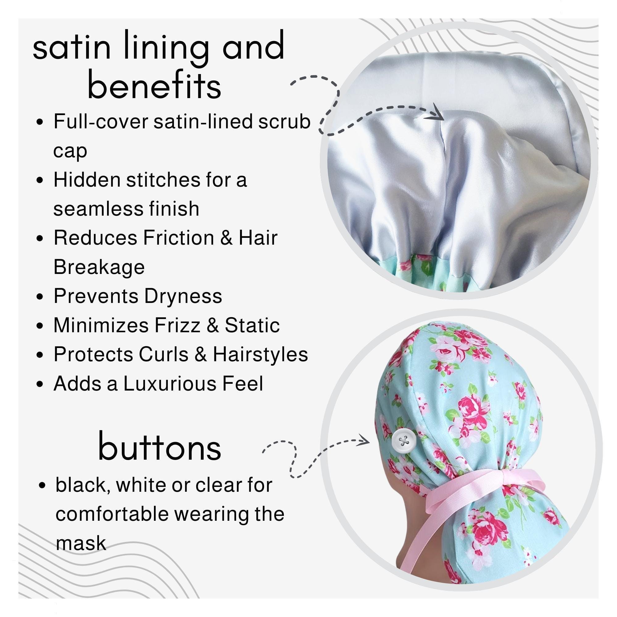 Choose from a variety of fabric prints, with the option for satin lining and personalization to make your cap unique. These surgical hats are durable, lightweight, and easy to care for — just machine wash and reuse.