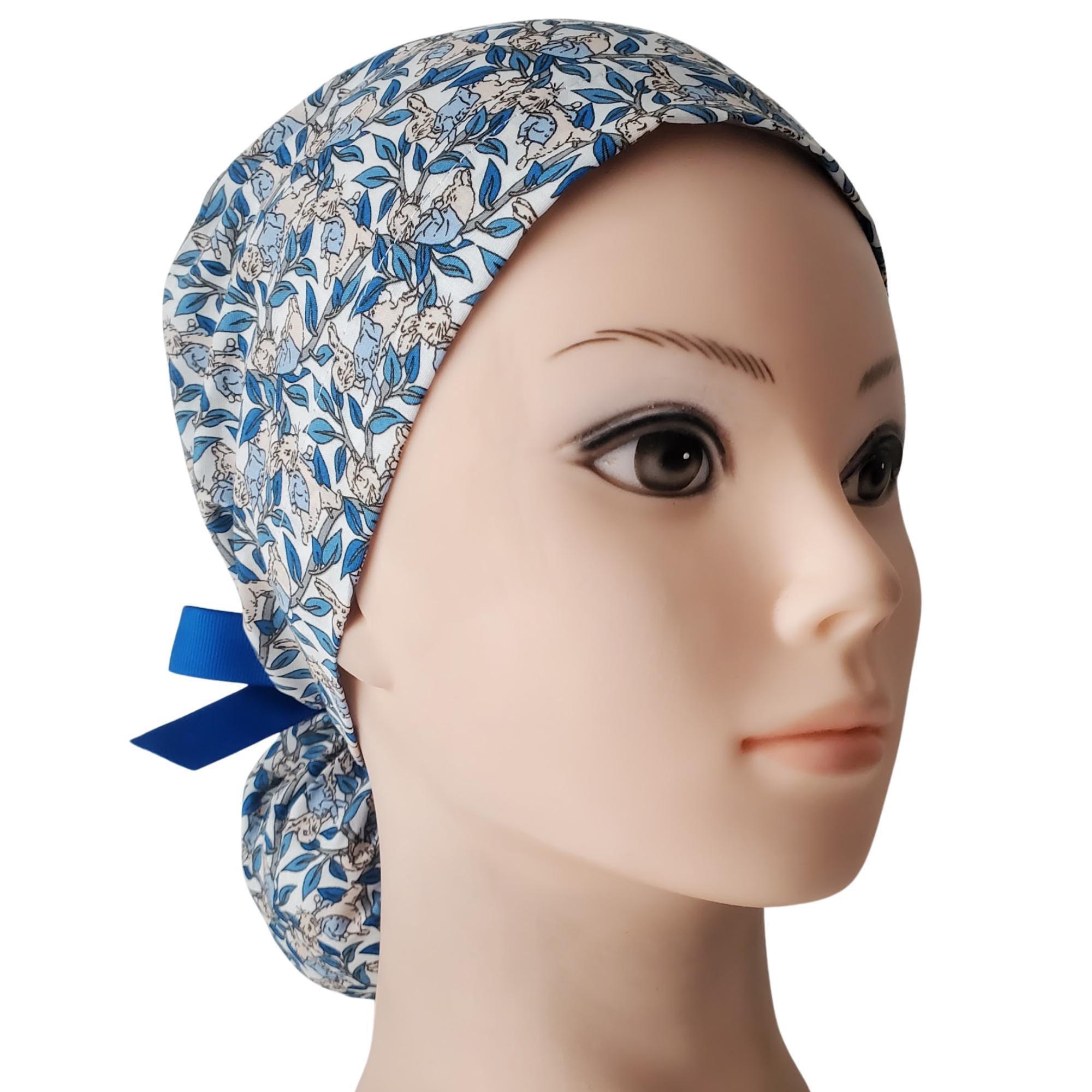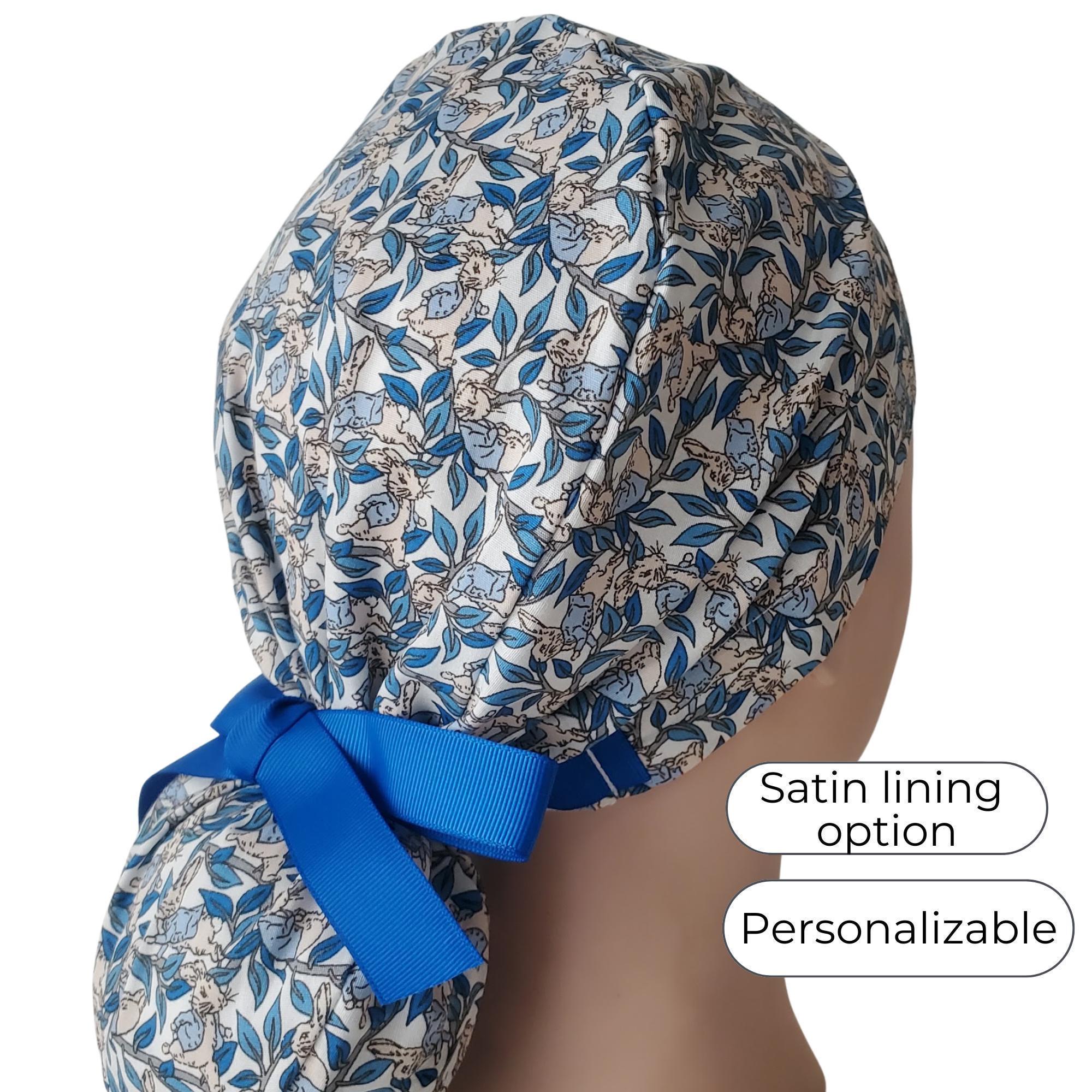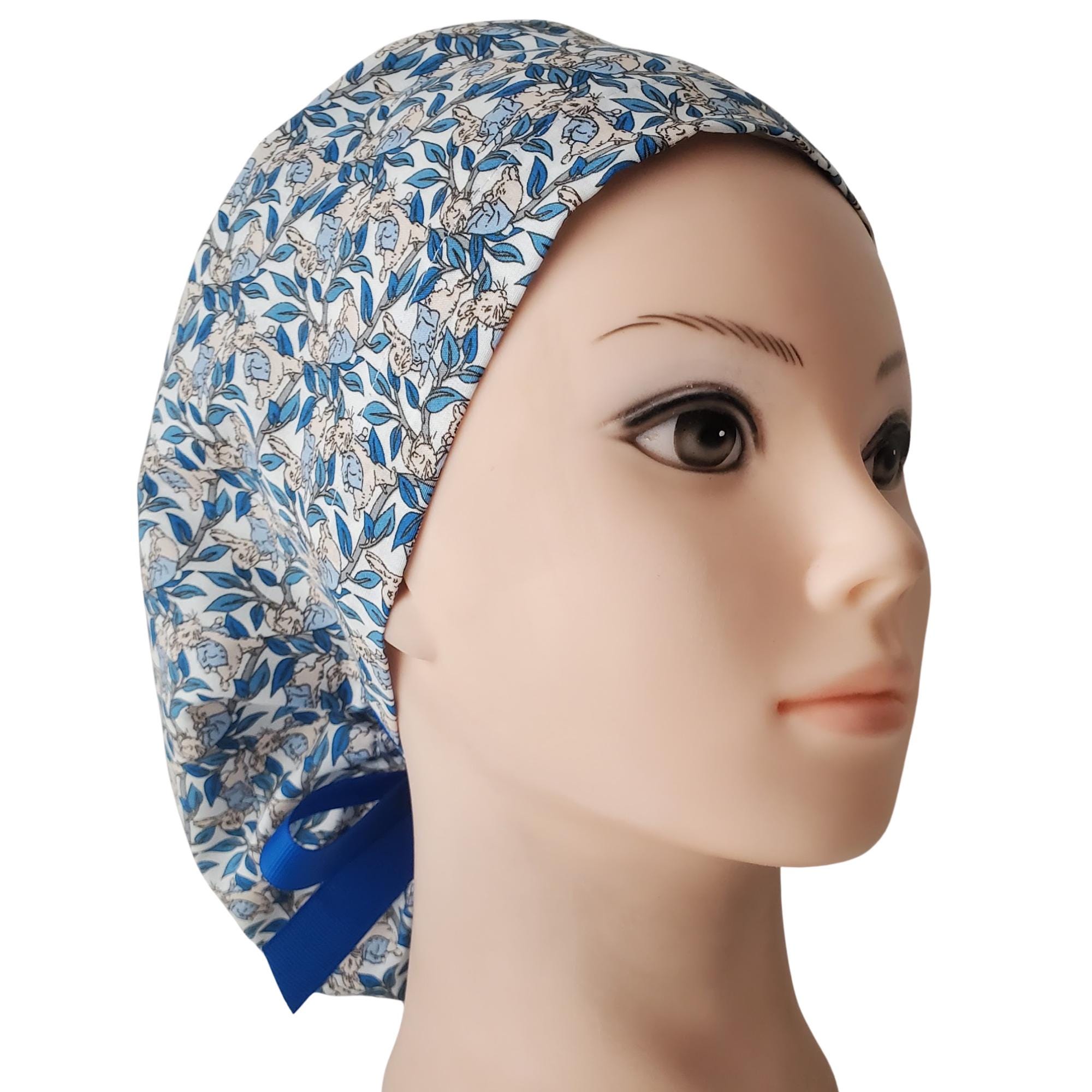 Refresh your look with this Bunny in Blue jacket Ponytail Scrub Cap, featuring an elegant leaf pattern in deep and sky-blue tones on a soft white background. Designed for long hair, the roomy ponytail pouch keeps hair neatly tucked and secure. The optional satin lining helps reduce frizz and dryness, making it perfect for professionals who want comfort, protection, and style throughout long shifts.