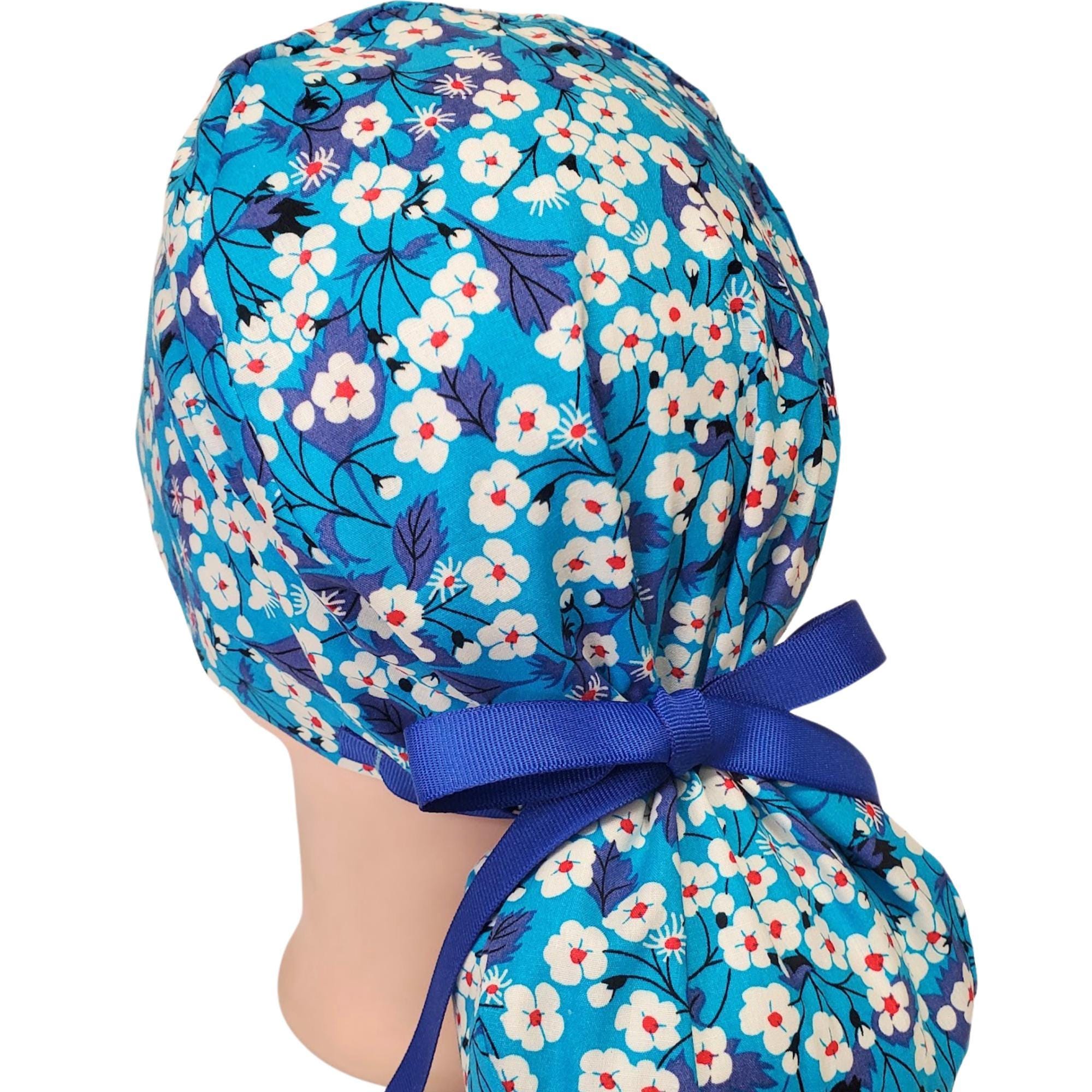 Ponytail Scrub Cap for Women - Surgical Cap with Satin Lined Option - Blue Floral -