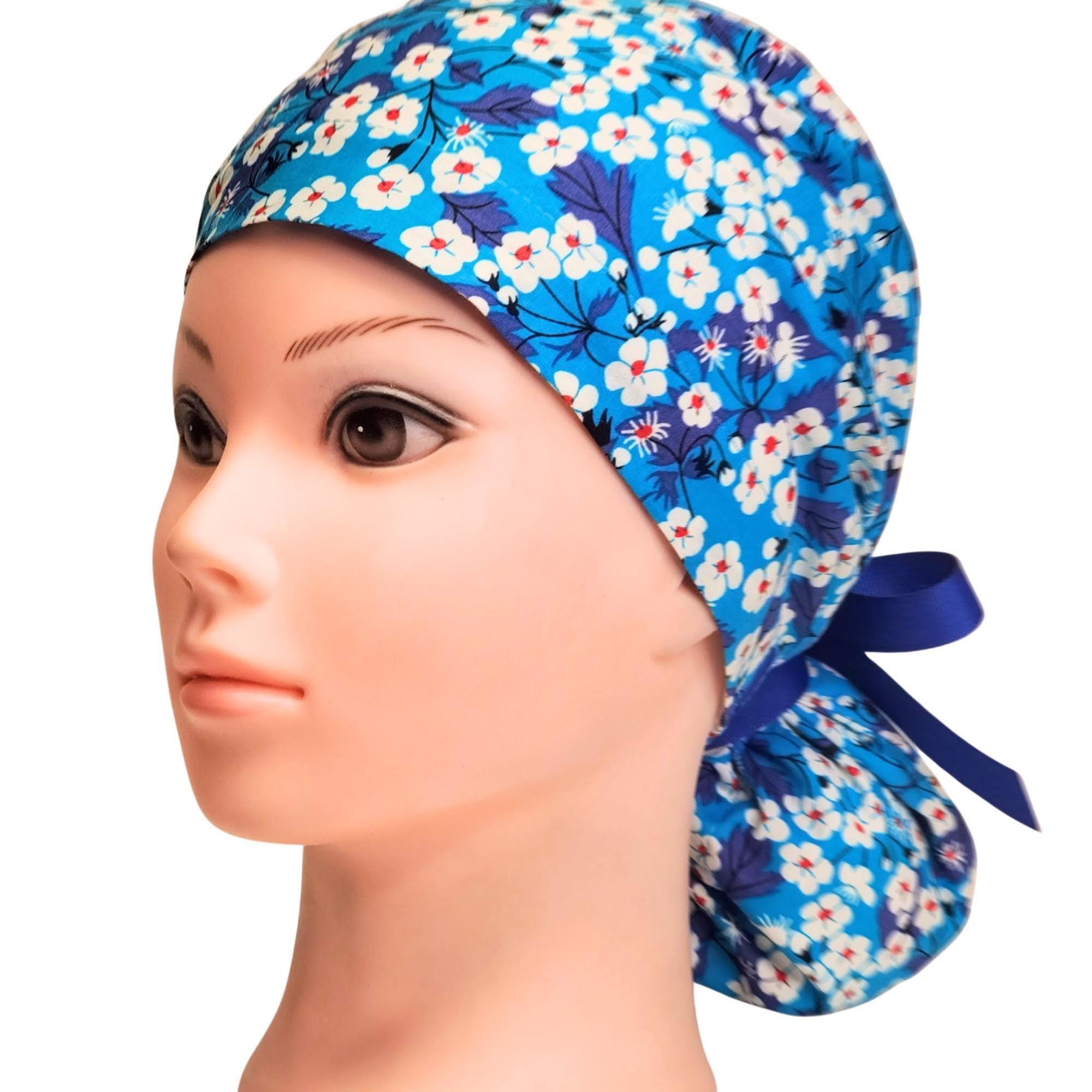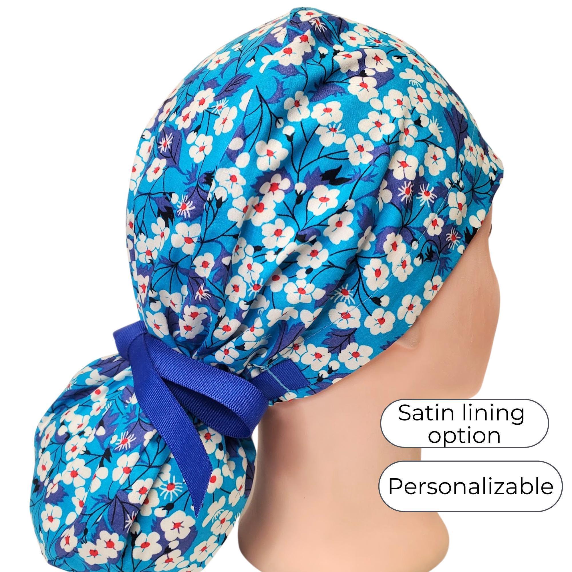 Ponytail Scrub Cap for Women - Surgical Cap with Satin Lined Option - Blue Floral