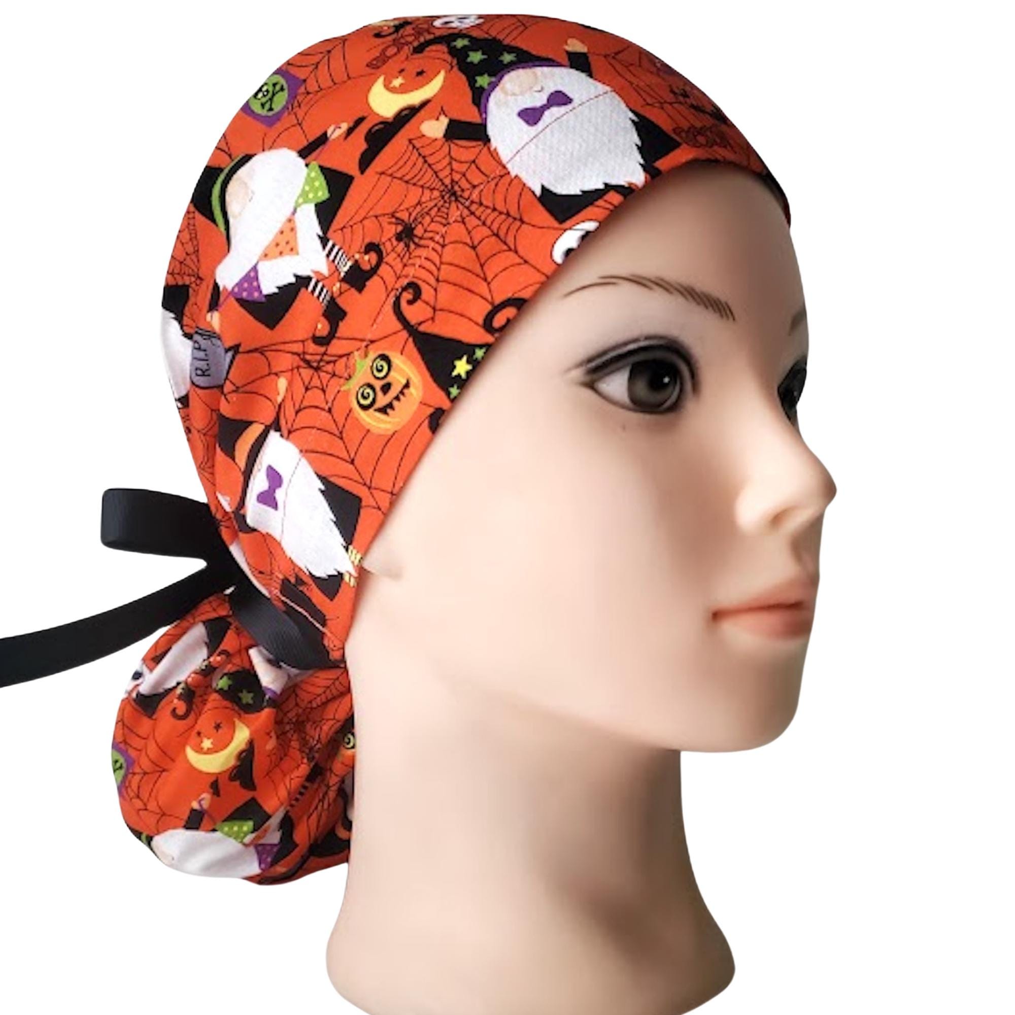 Ponytail Scrub Cap with Satin Lining, Embroidery, and Buttons for Comfortable Mask Wearing.