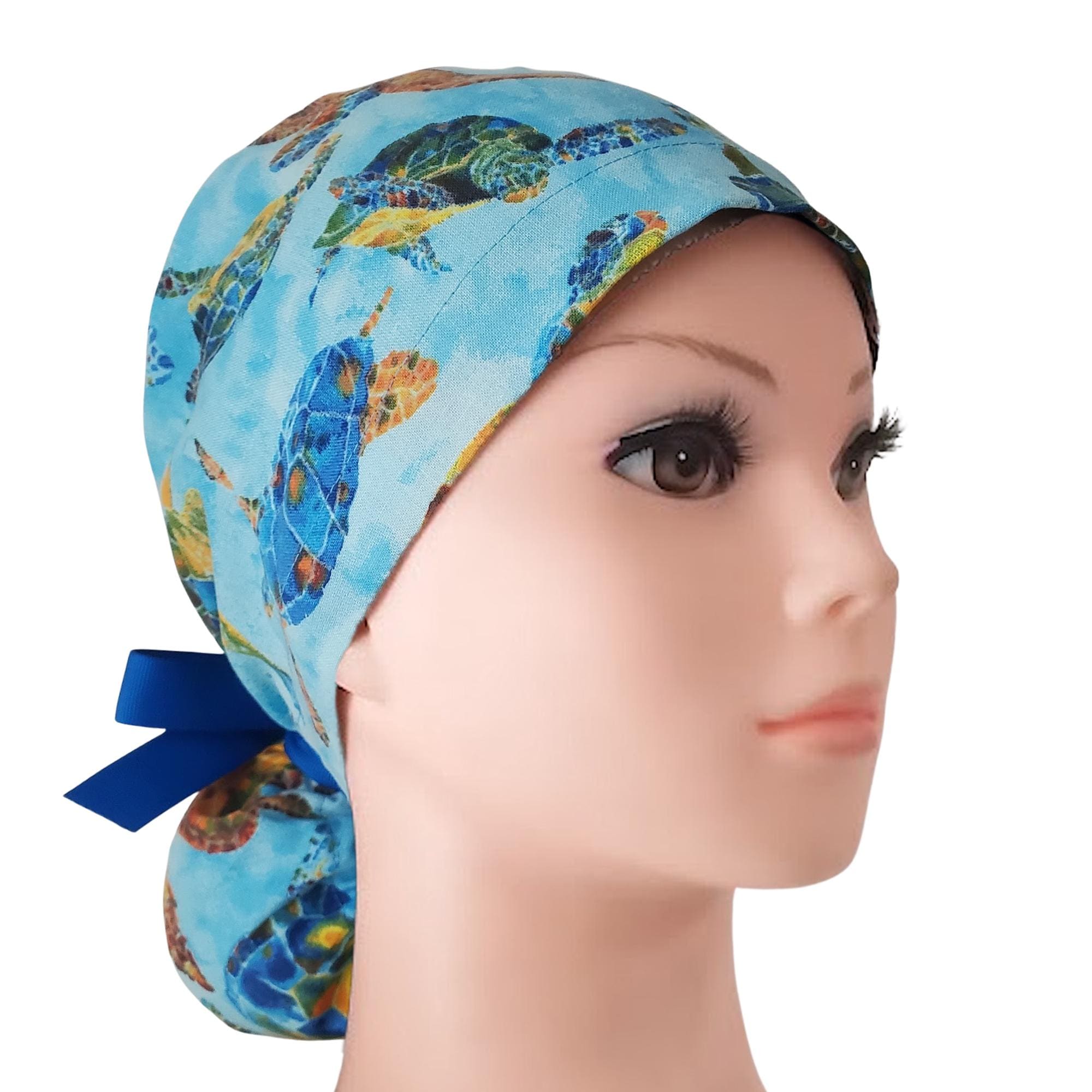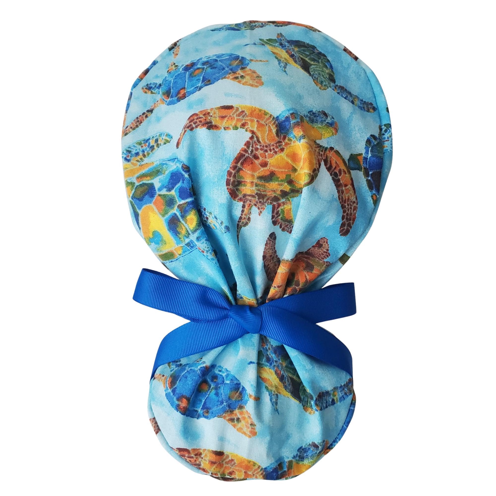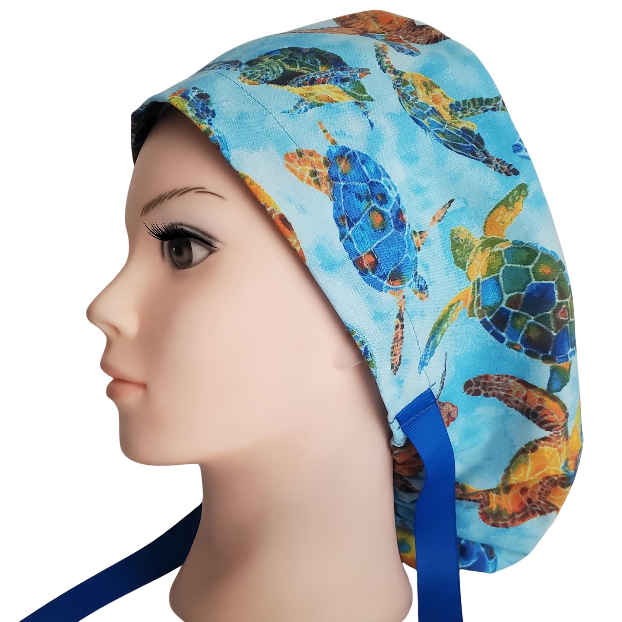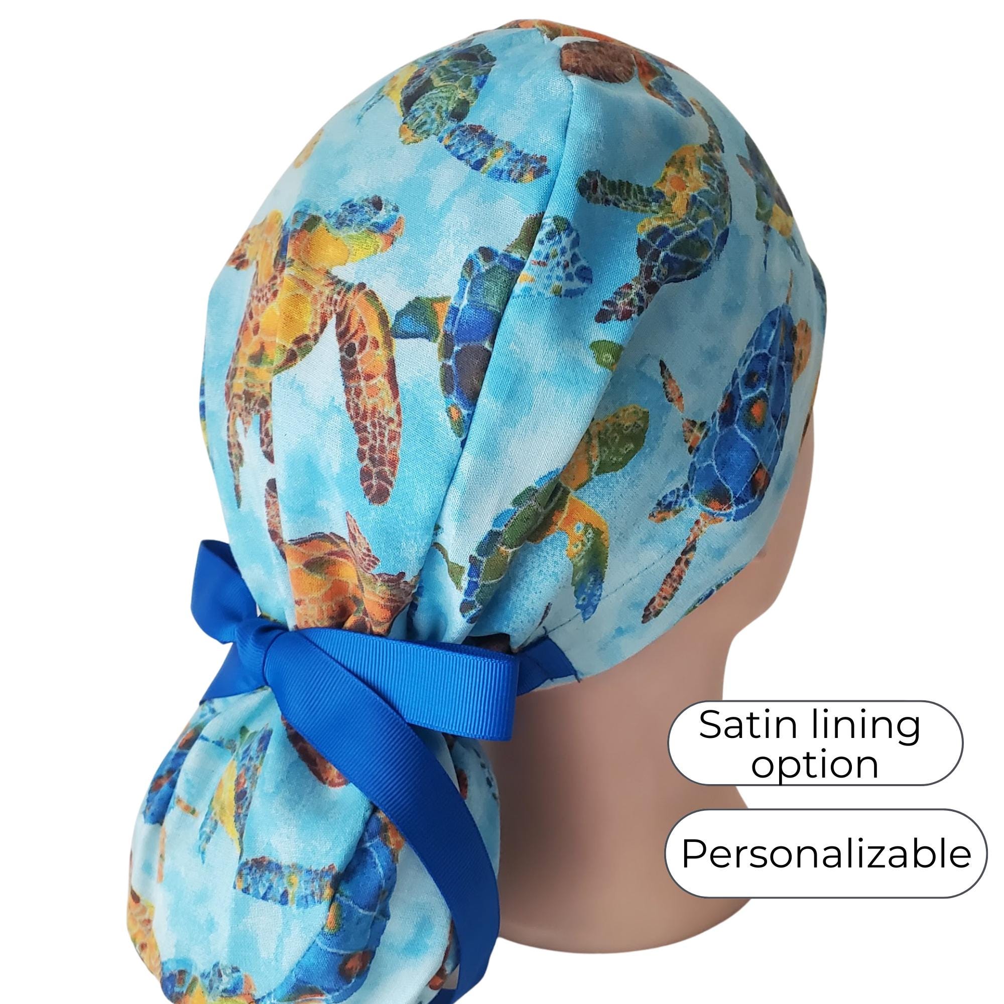 Available with or without a satin lining for added hair protection, this design features a unique Blue Ocean Turtle print. Each cap is carefully handmade to balance functionality, durability, and style.