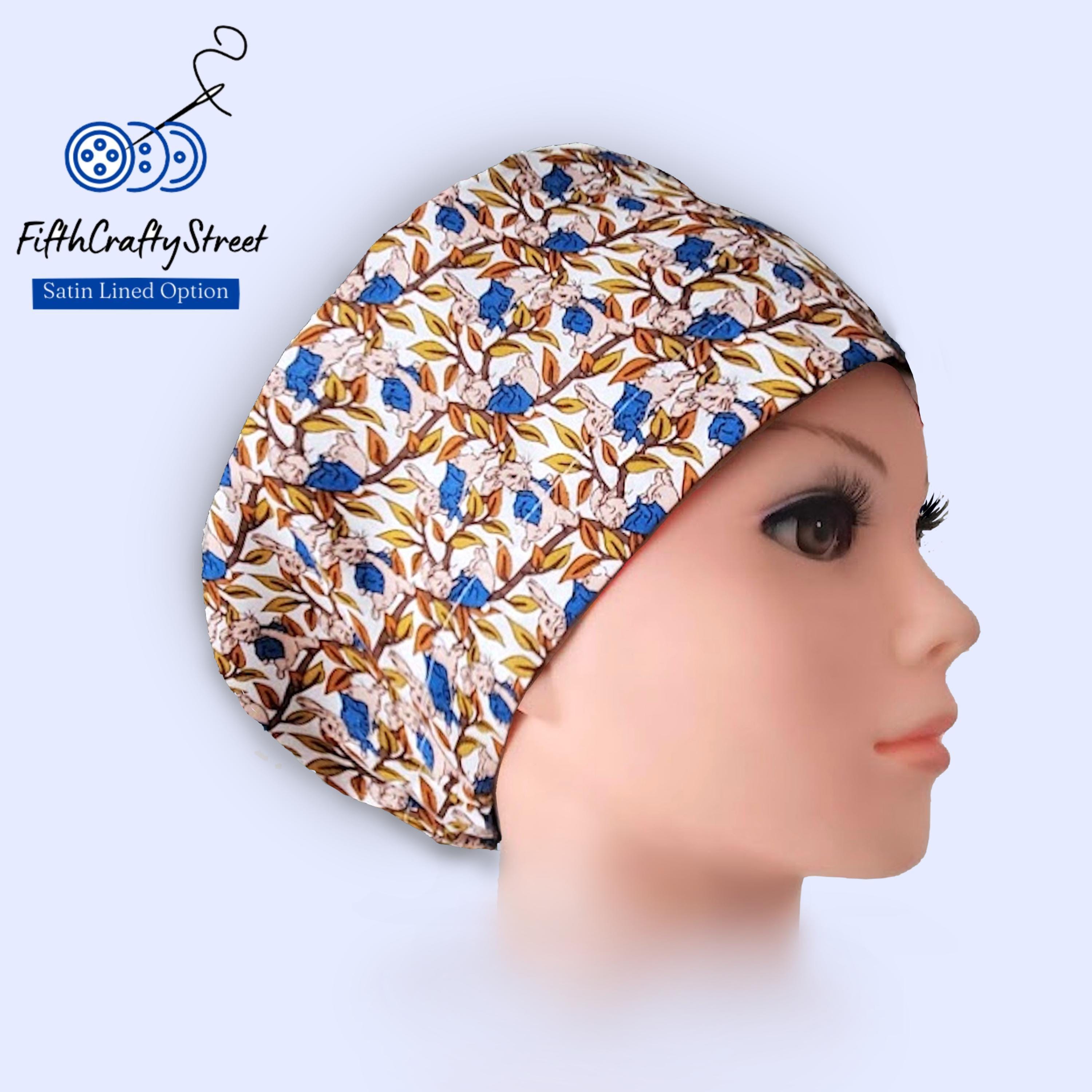 Euro Scrub Caps - Adjustable - Satin Lined option - bunny in blue jacket -