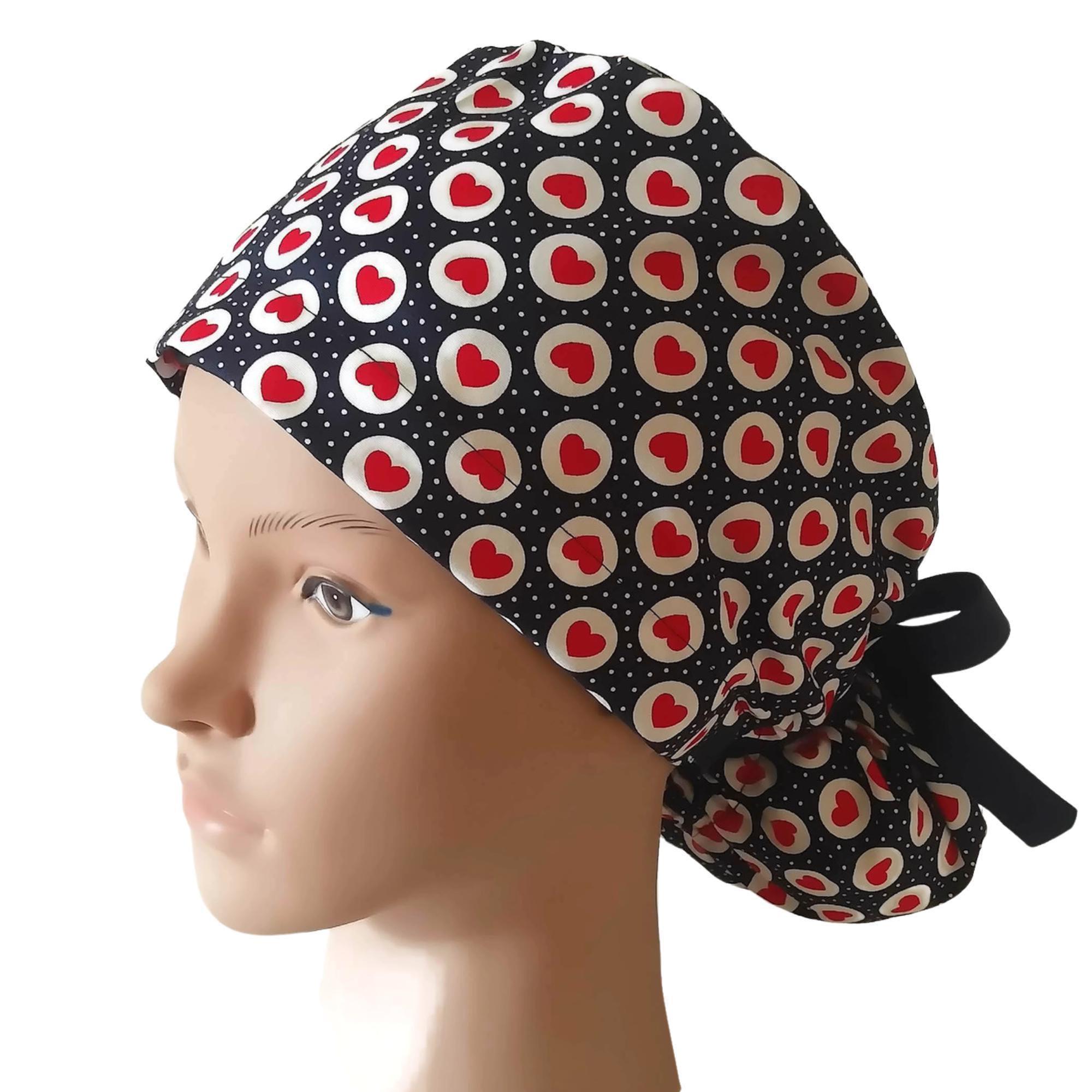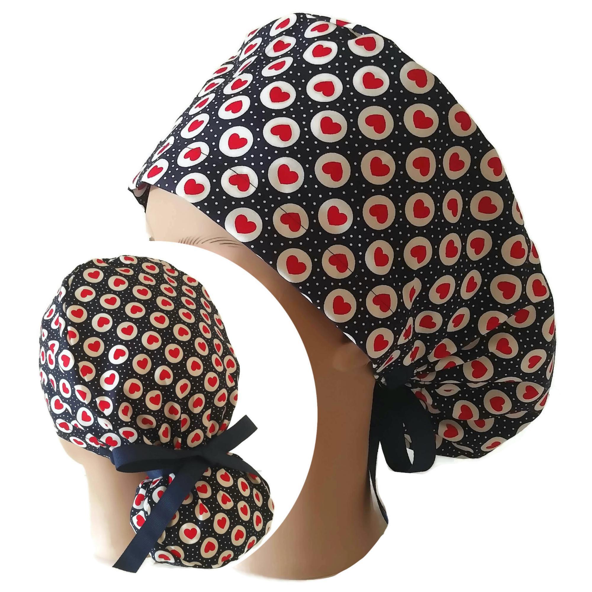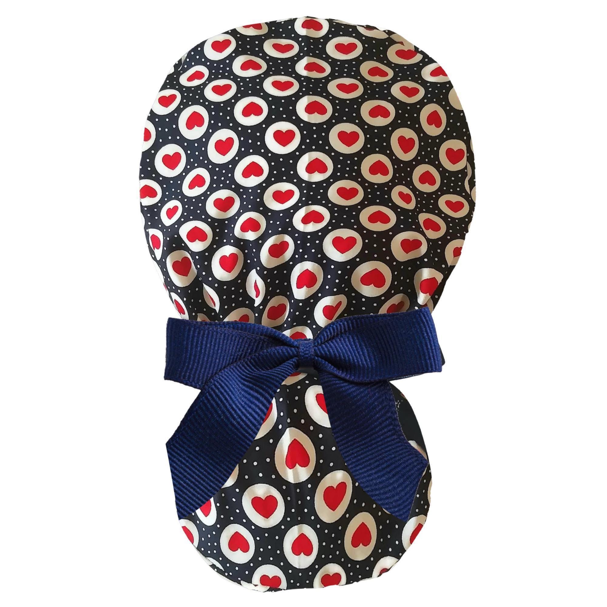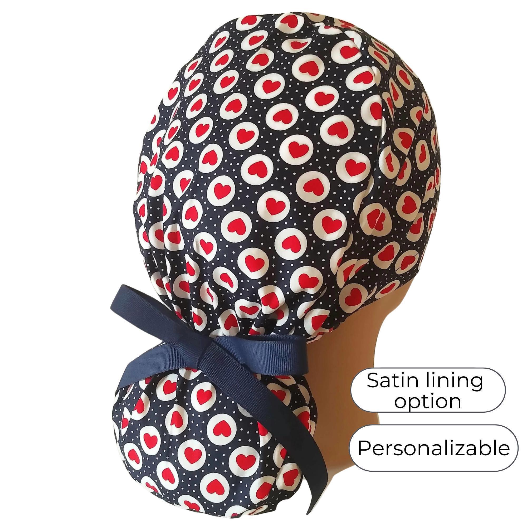 Hearts Ponytail Scrub Cap for Women - Surgical Hat Satin Lined Option