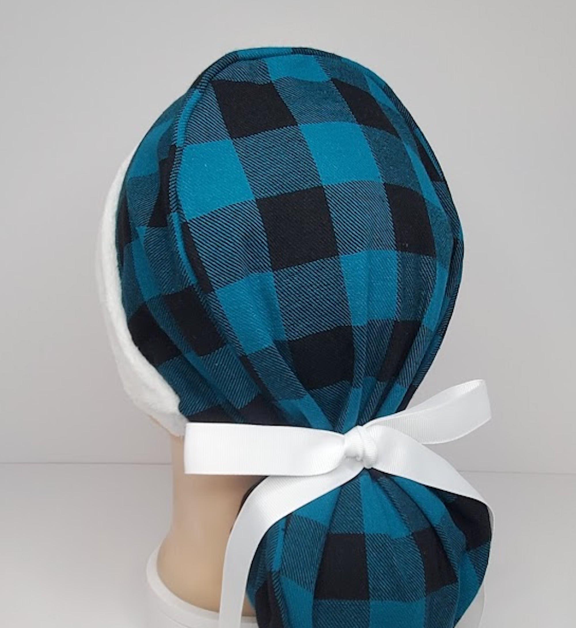 Ponytail Scrub Cap with Satin Lining, Embroidery, and Buttons for Comfortable Mask Wearing.