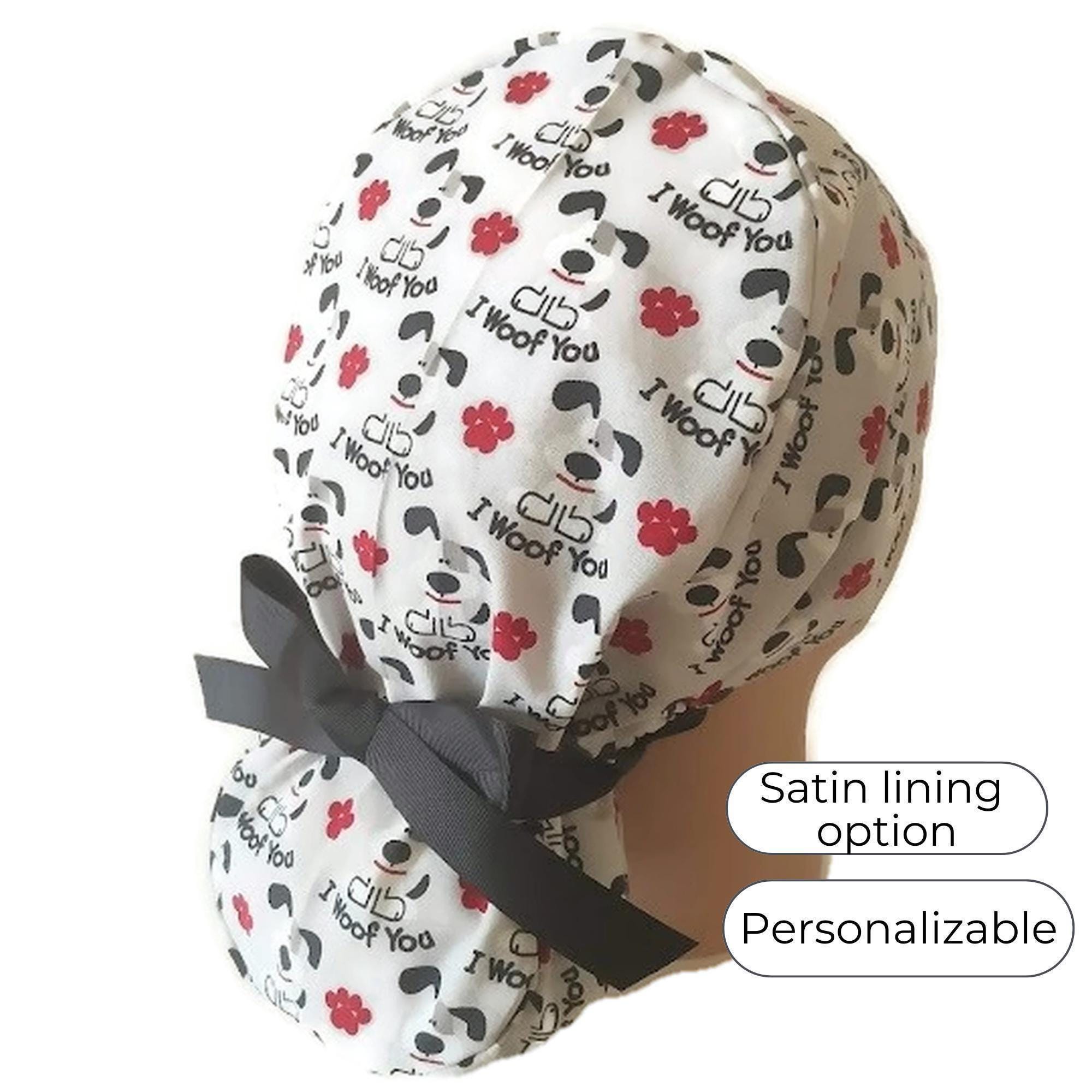 Dog Paws Ponytail Scrub Cap: Satin Lined Cotton Surgical Cap