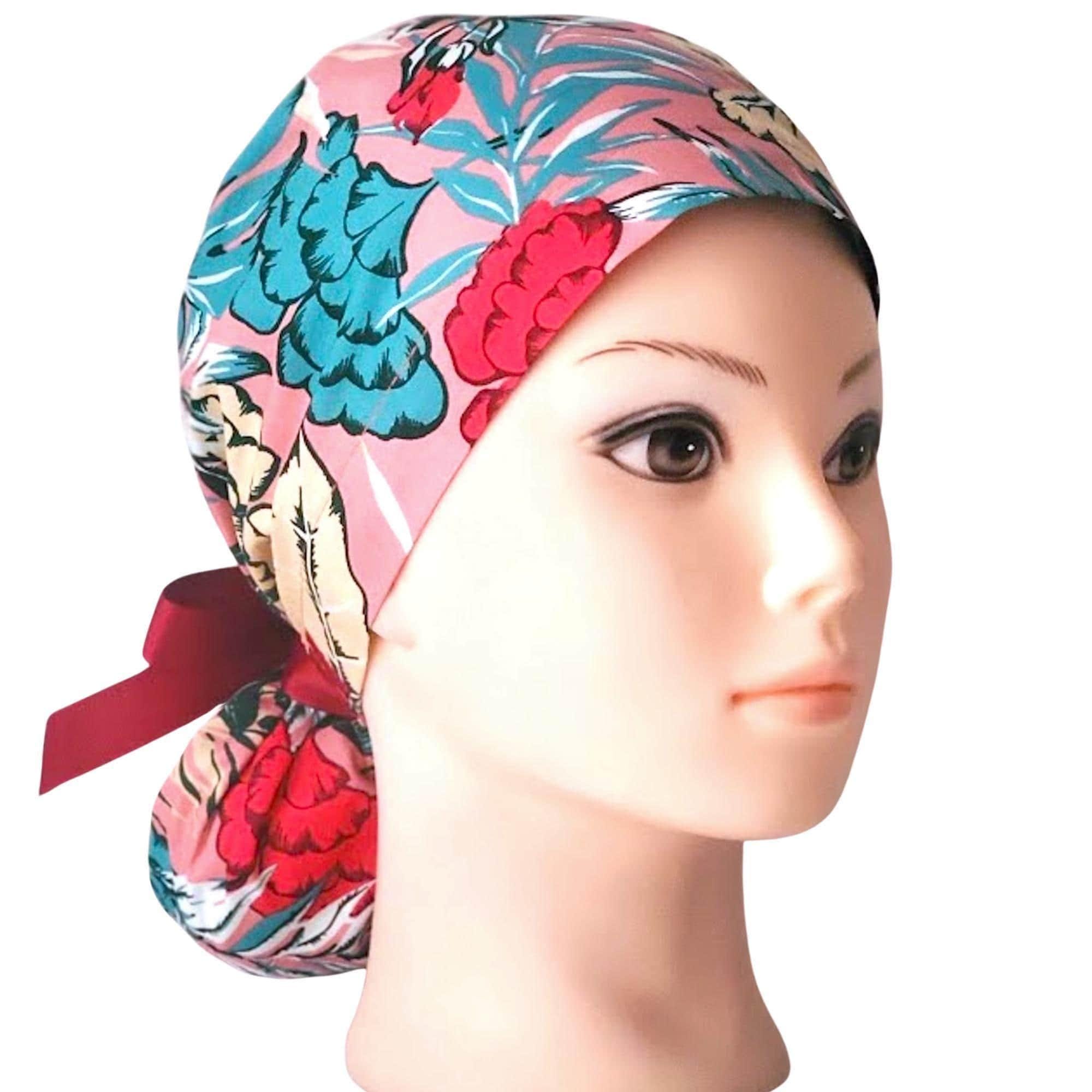 Ponytail Scrub Cap in Tropical Floral Print – handmade surgical scrub hat designed for women with long hair. This vibrant floral design adds style while keeping your hair secure and comfortable during long shifts.