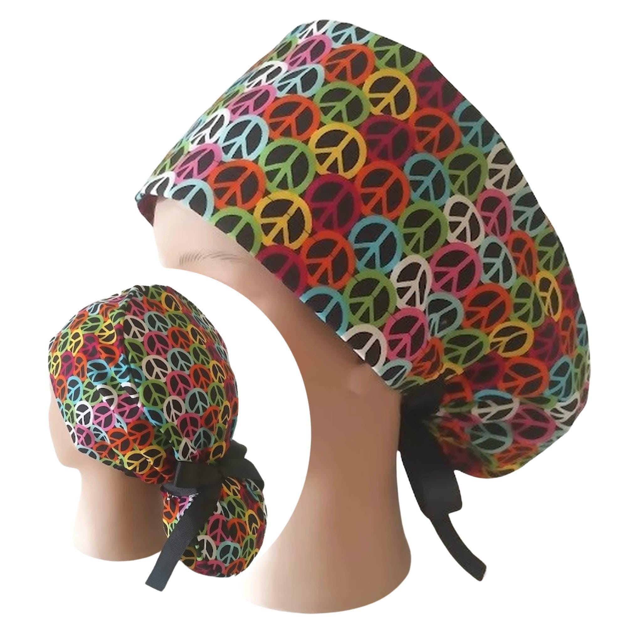 Peace Sign Ponytail Scrub Cap for Women - Surgical Cap Satin Lined Option -