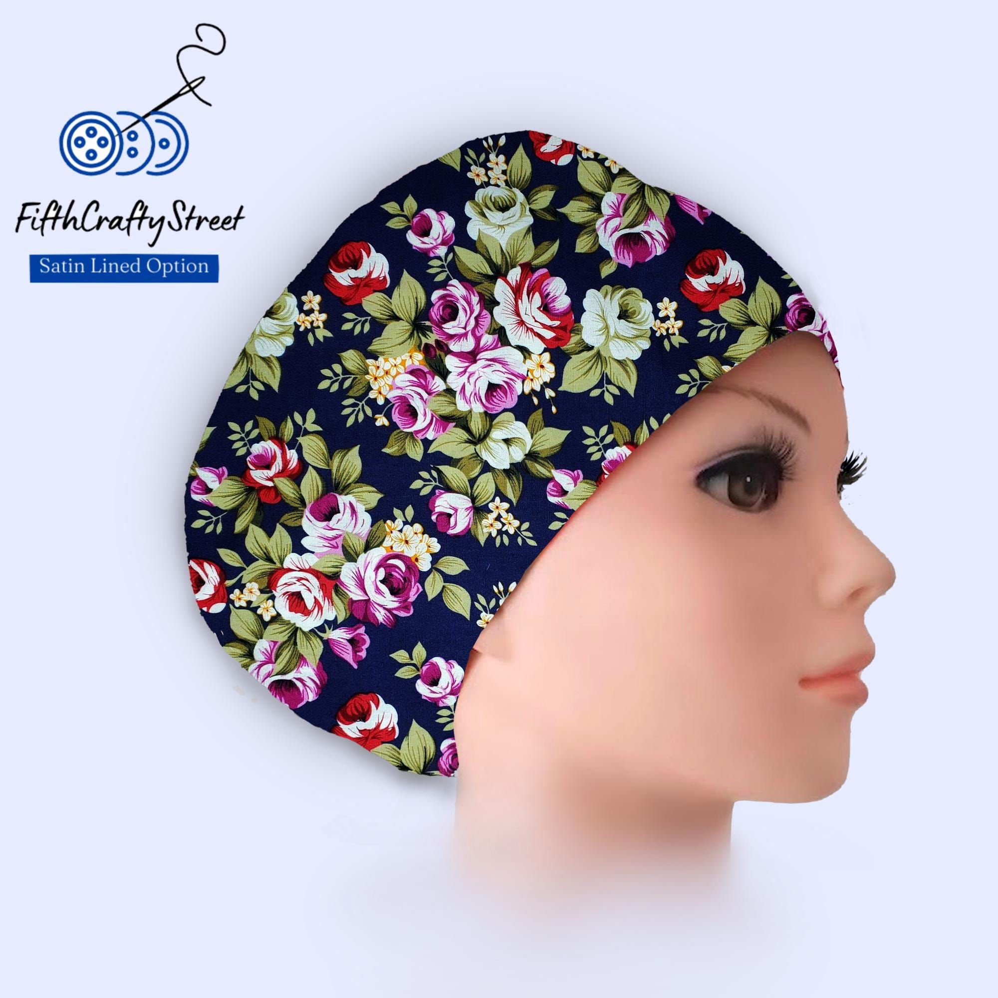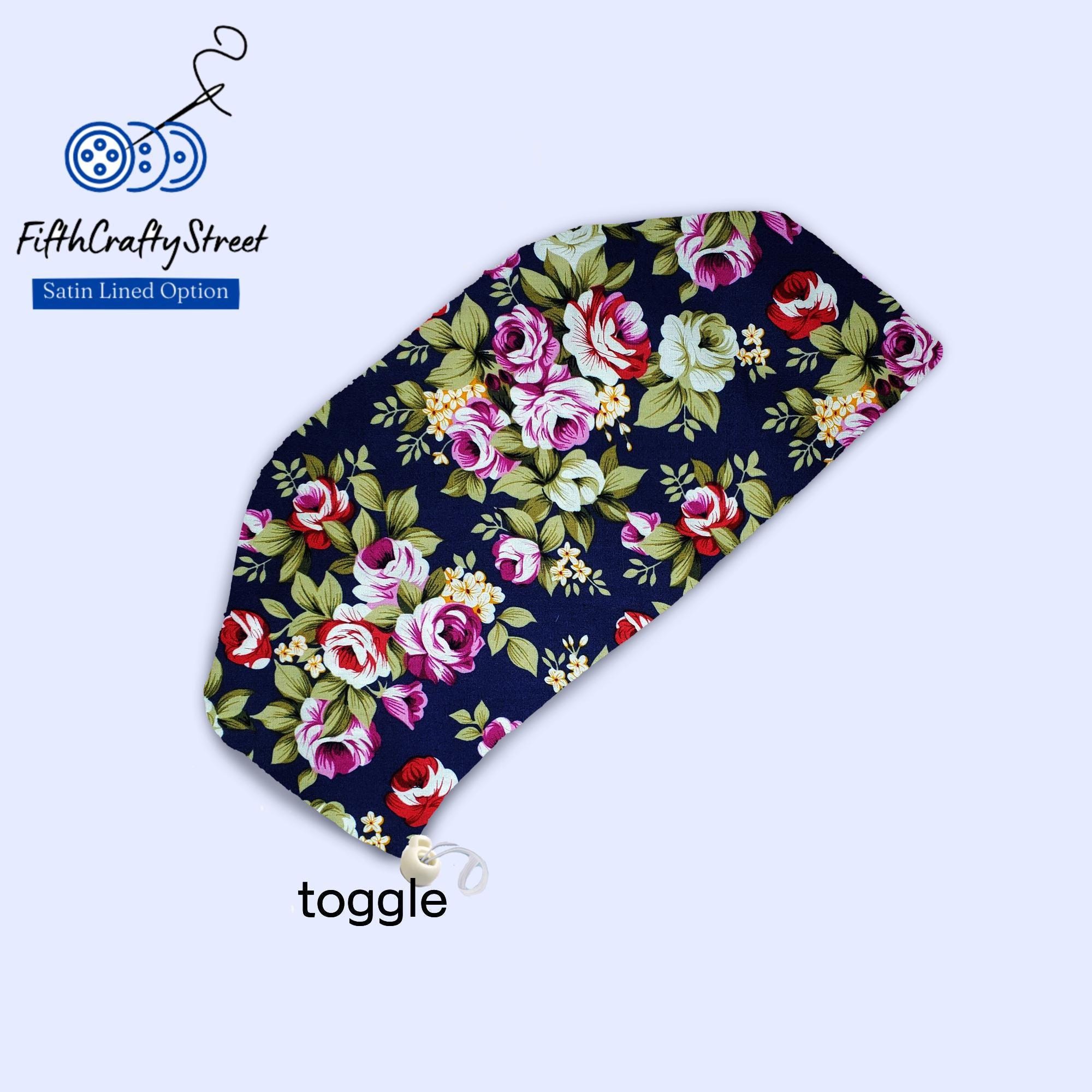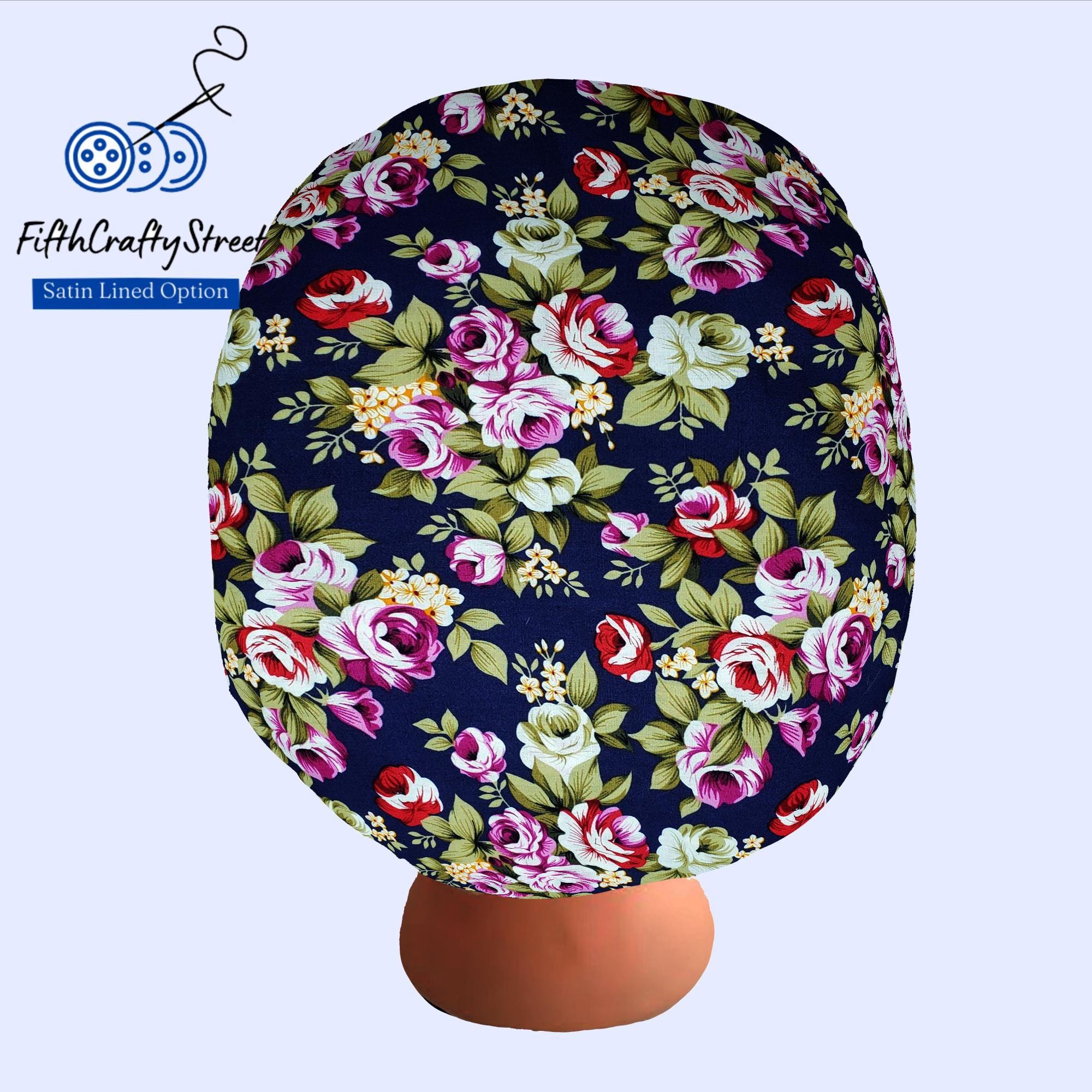 Euro Scrub Caps - Adjustable - Satin Lining option - Floral on navy