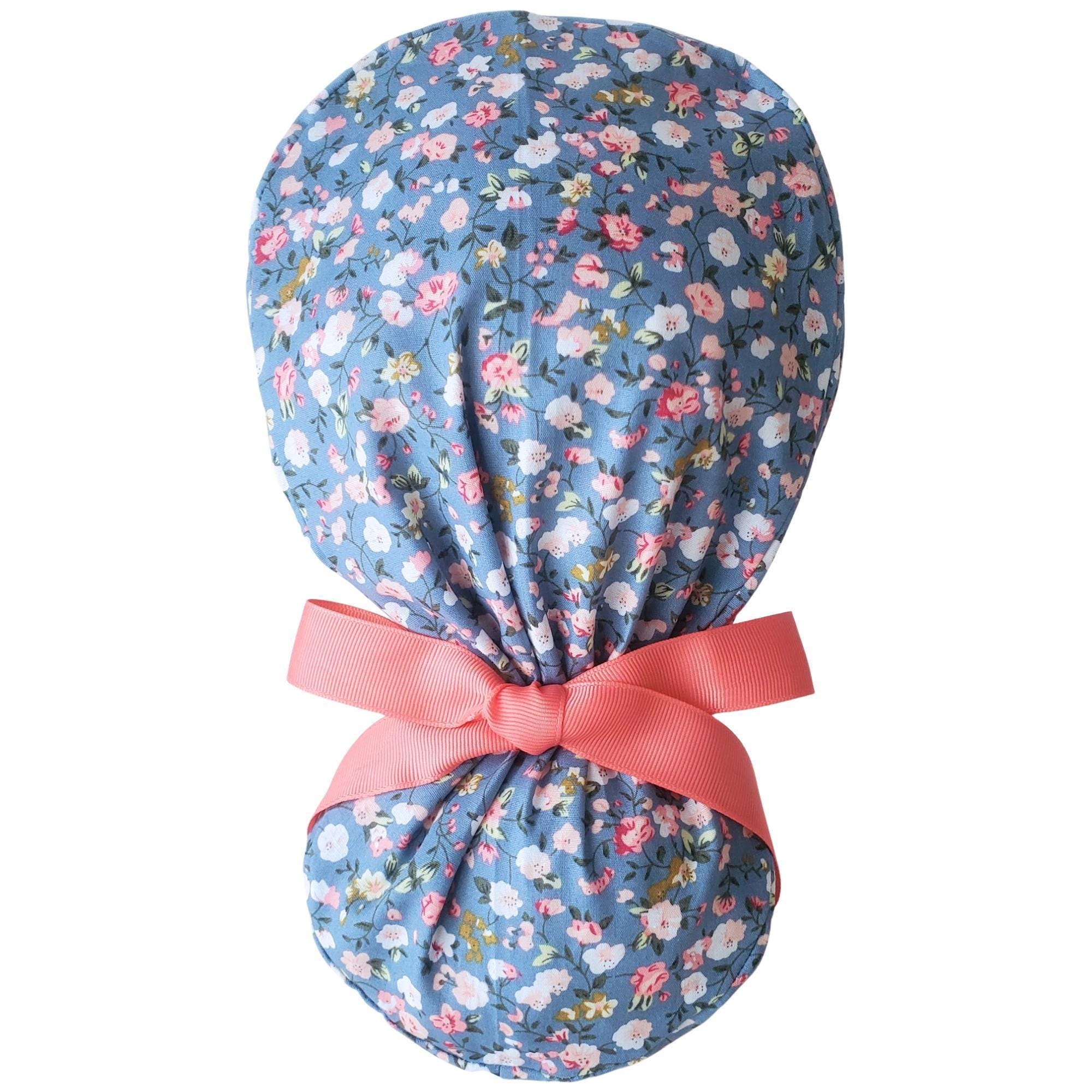 Bring elegance and comfort to your shift with this Blue Floral Ponytail Scrub Cap. Designed with a soft blue background and delicate pink and white flowers, this scrub hat combines beauty and function. The roomy ponytail pouch keeps long hair neatly tucked away, while the optional satin lining protects hair from breakage and frizz.