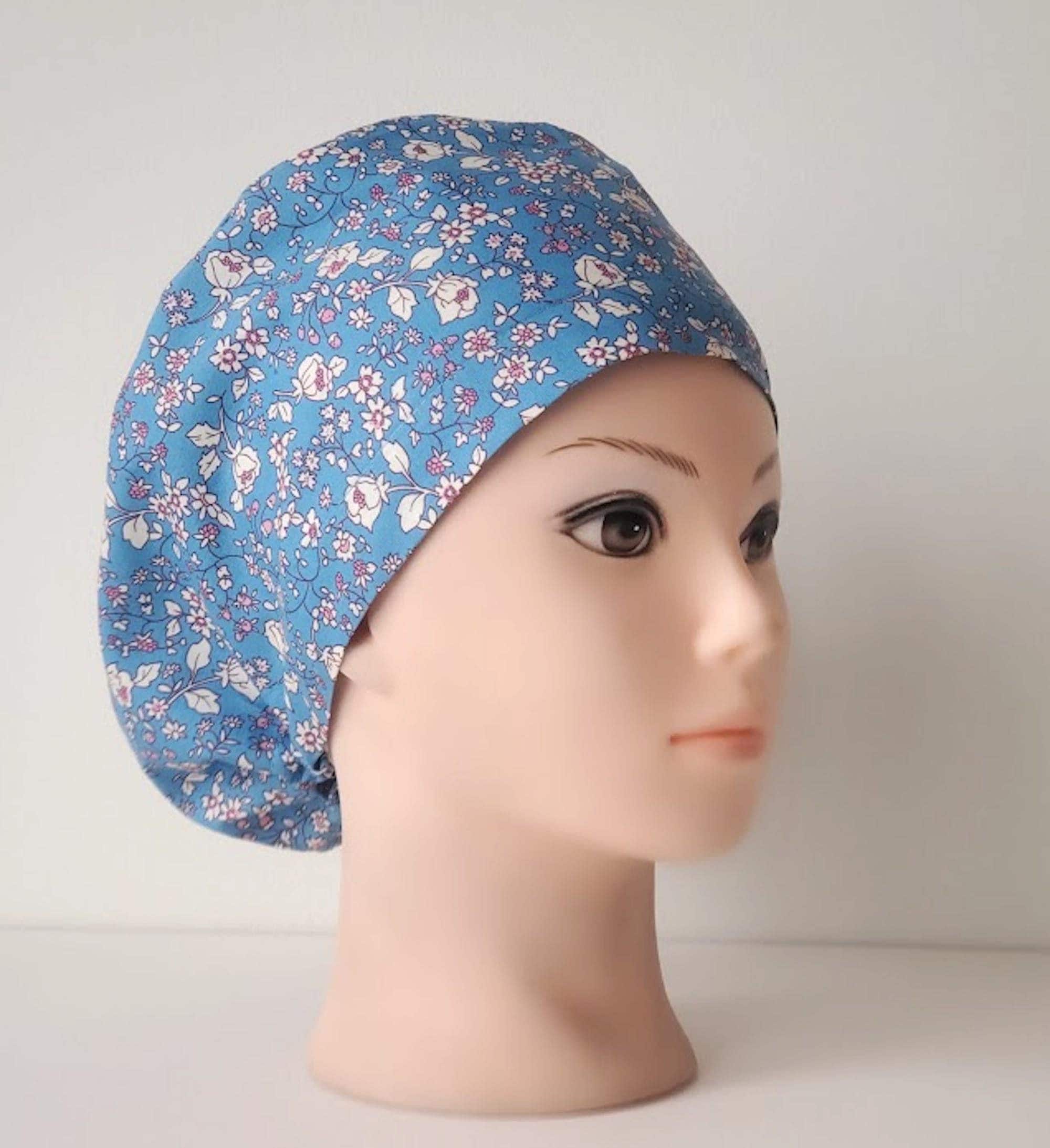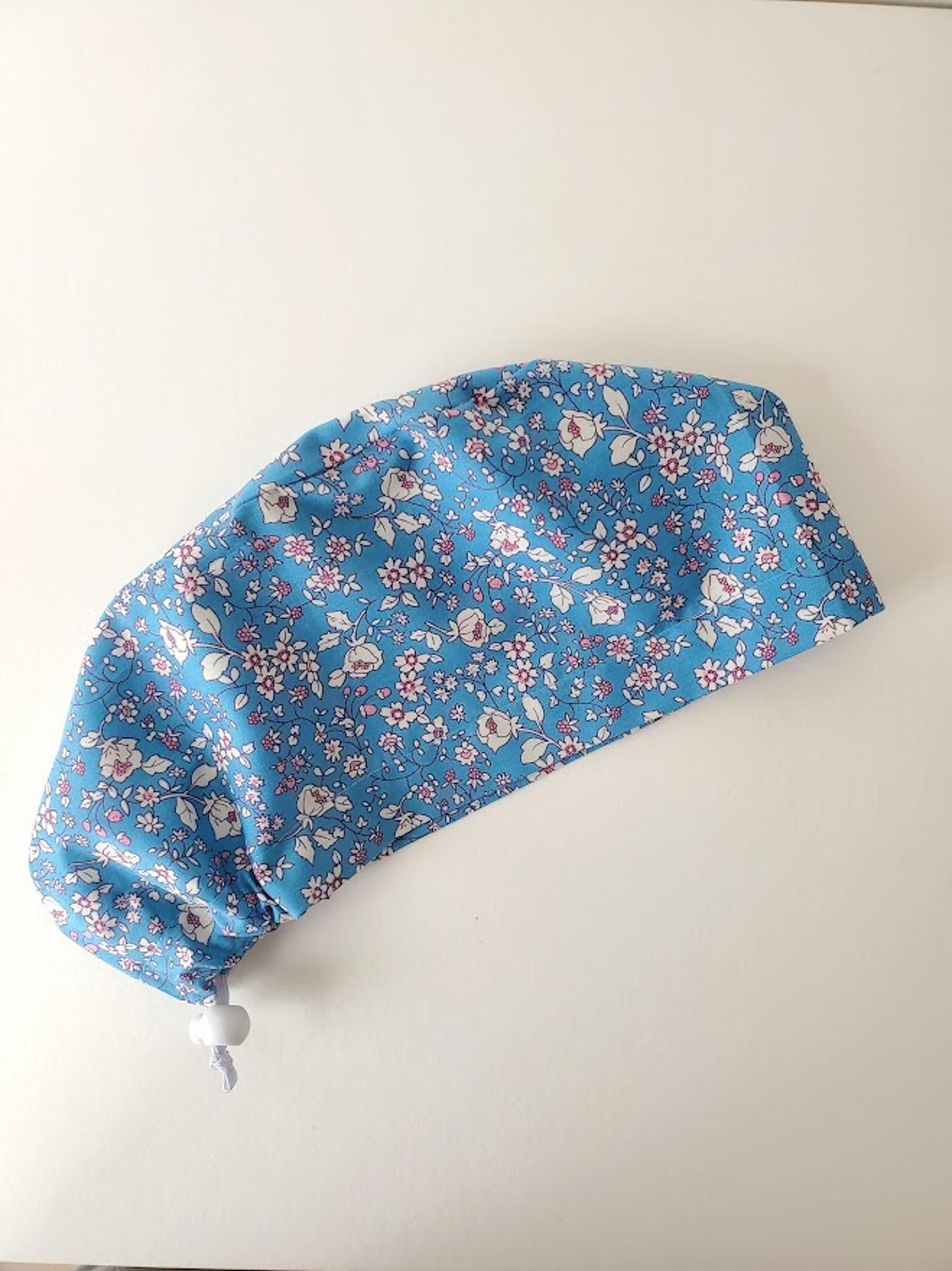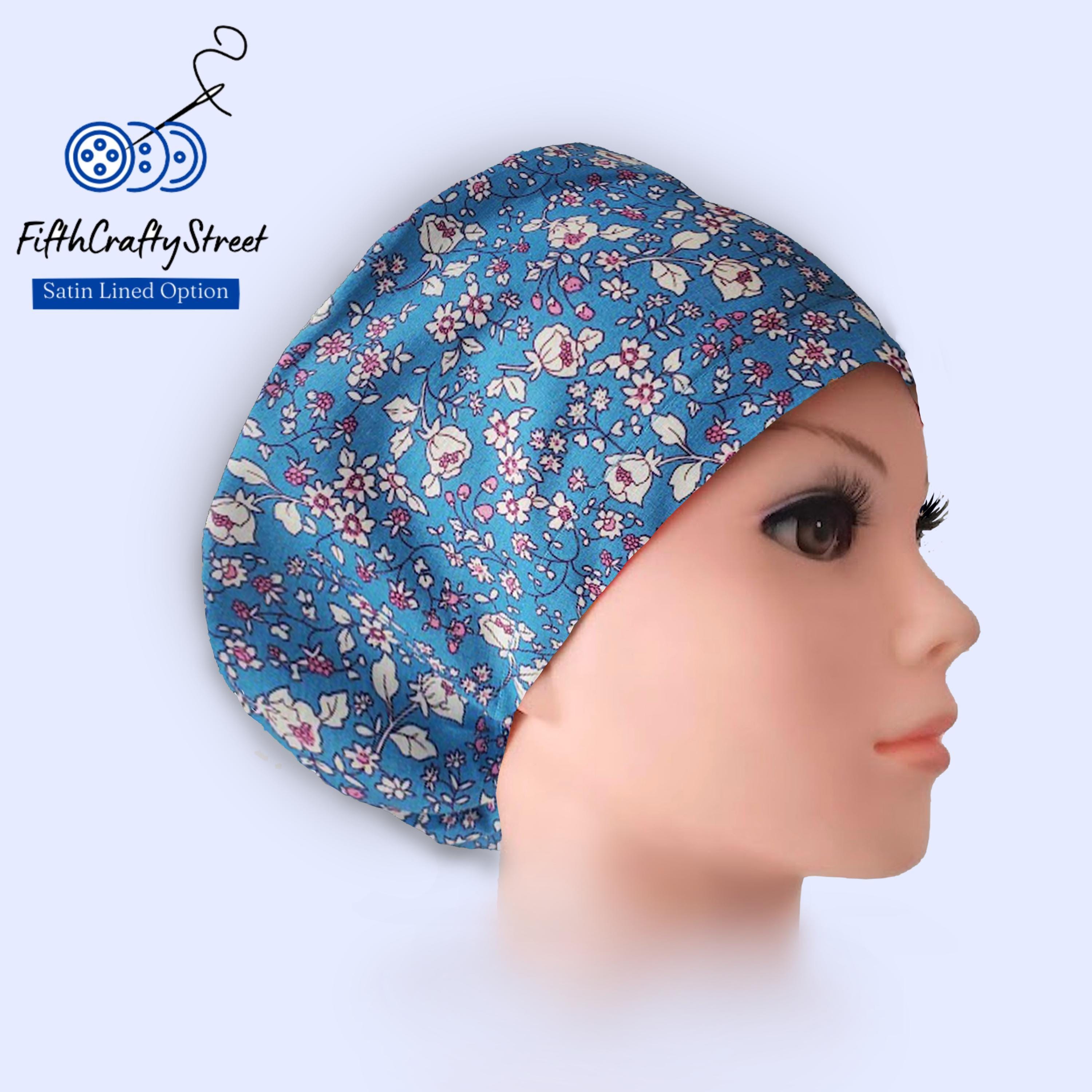 Floral blue Euro Scrub Caps - Adjustable - Satin Lining option